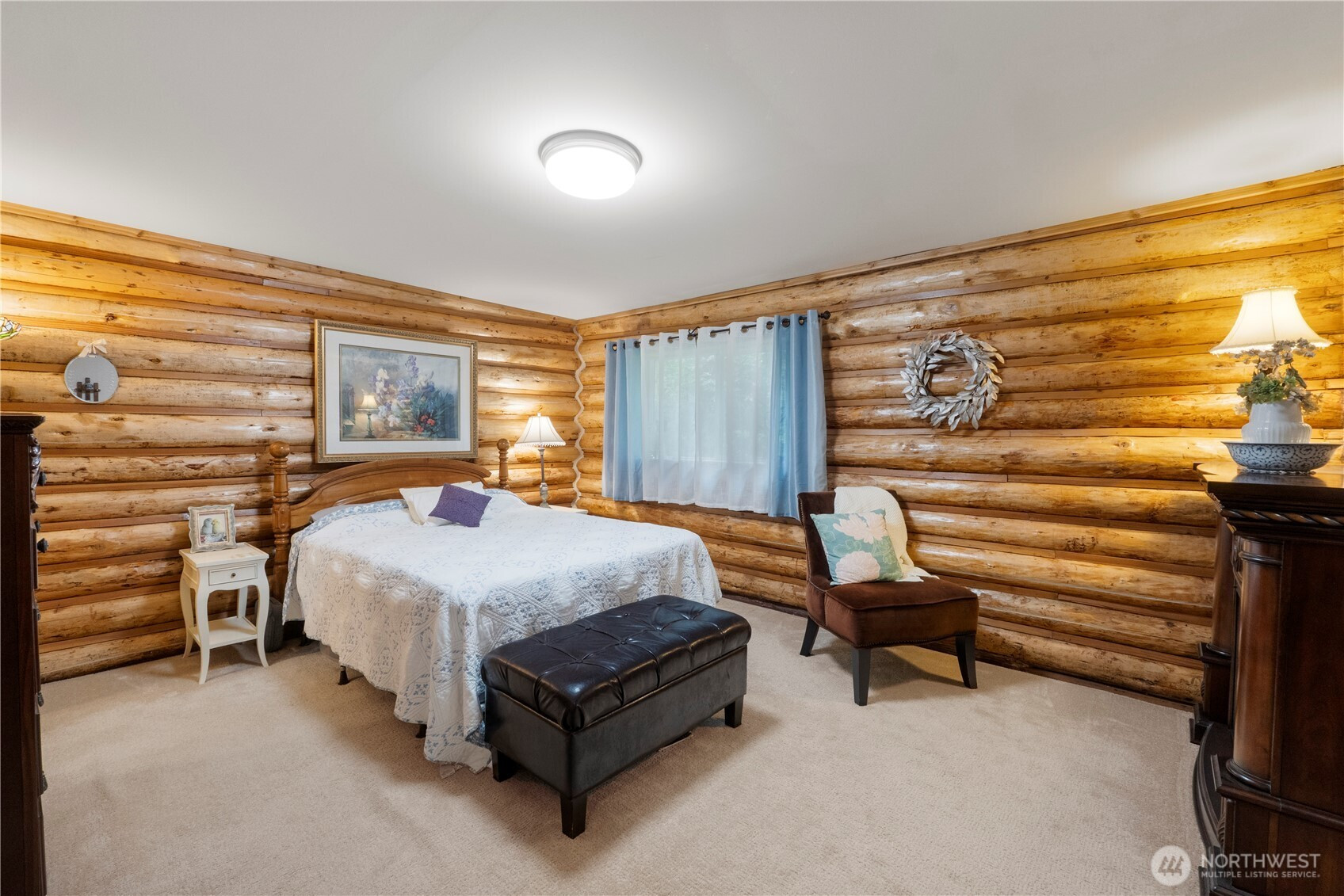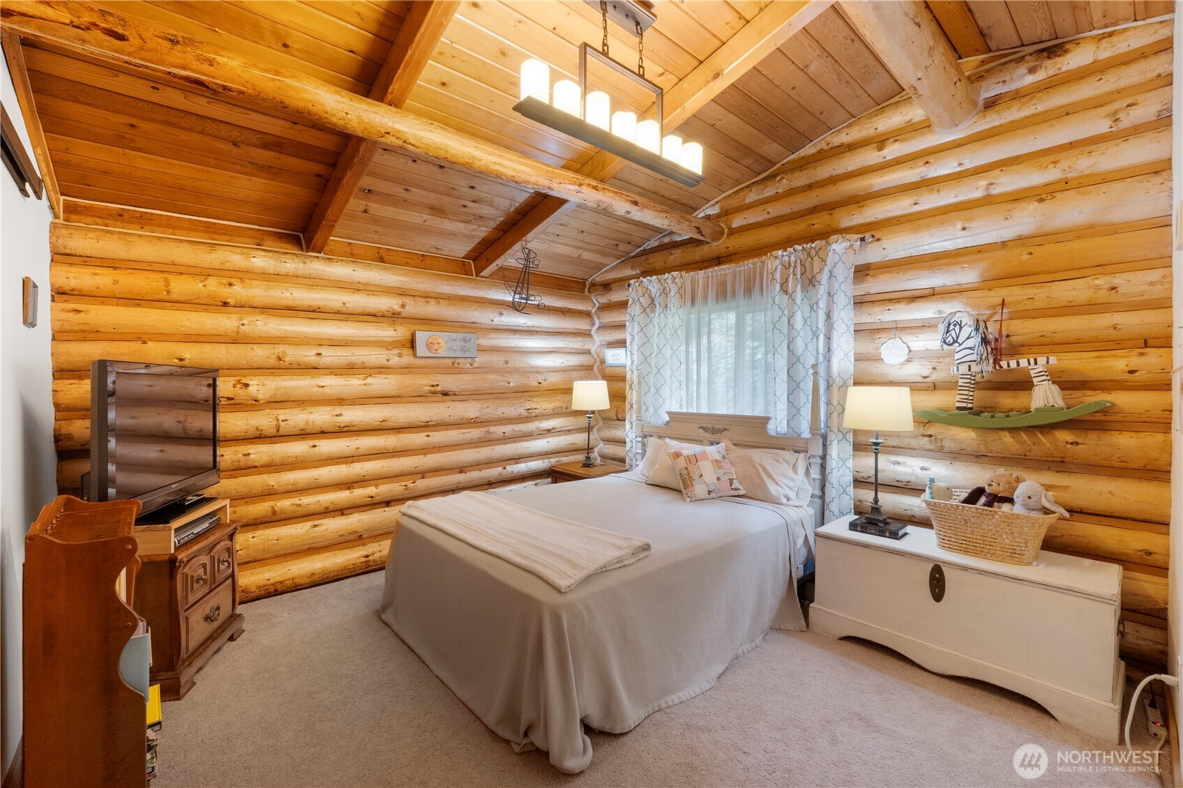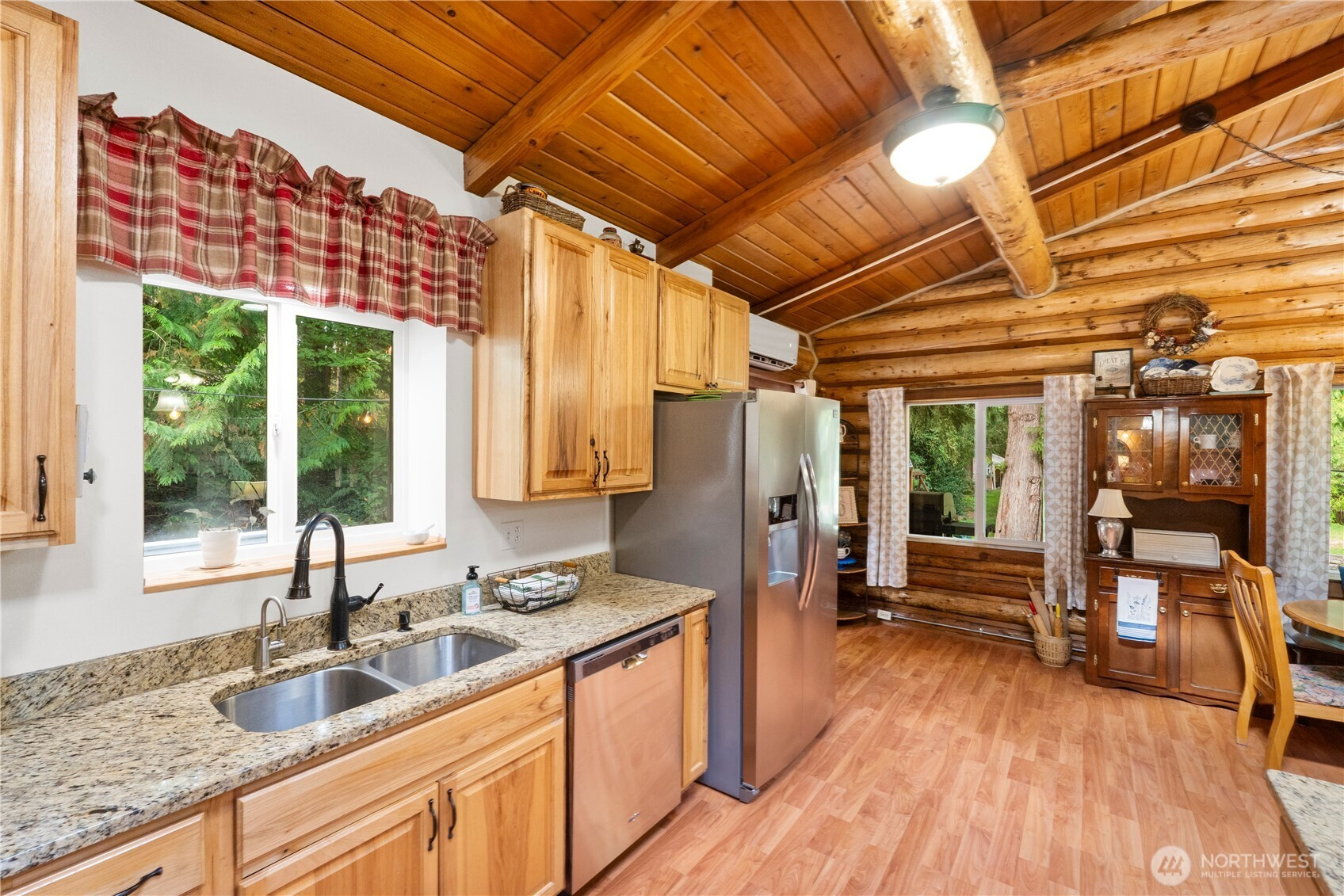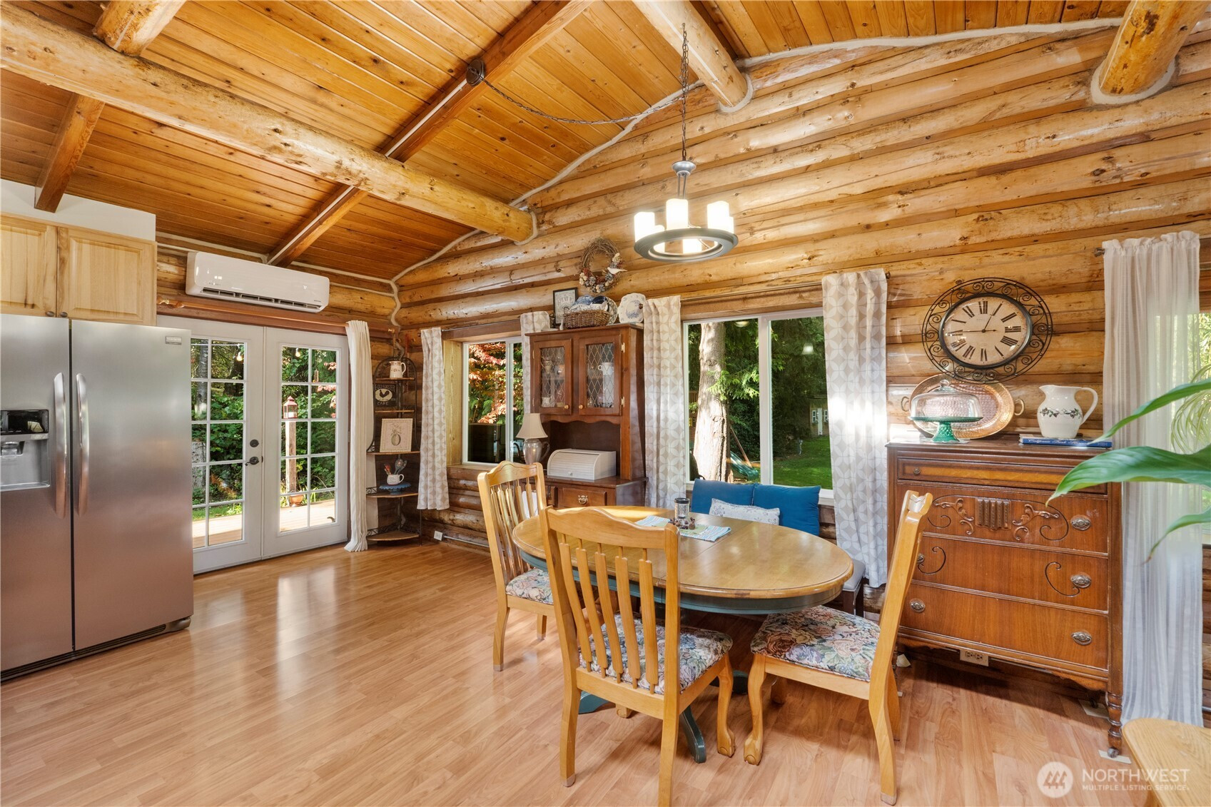 Situated on 2.4 secluded wooded acres, stunning 2-story log home totally remodeled offers the perfect blend of rustic charm & modern comfort. Featuring 3 bdrms, 2.25 baths, the home welcomes you w/vaulted ceilings, skylights & beautiful French doors. Main Floor Primary Bdrm Enjoy year-round comfort w/efficient mini-split heating & cooling, plus the warmth of a pellet stove. Entertain or relax on the expansive wrap-around deck, perfect for soaking in the peaceful surroundings. Detached garage offers storage & best of all, no HOA! Even w/its private, wooded setting, you're just minutes from shopping, schools, dining, & freeways. This is PNW living at its finest—privacy, nature, & timeless log home charm w/everyday convenience close by.