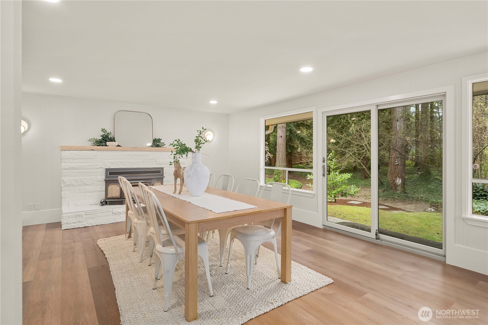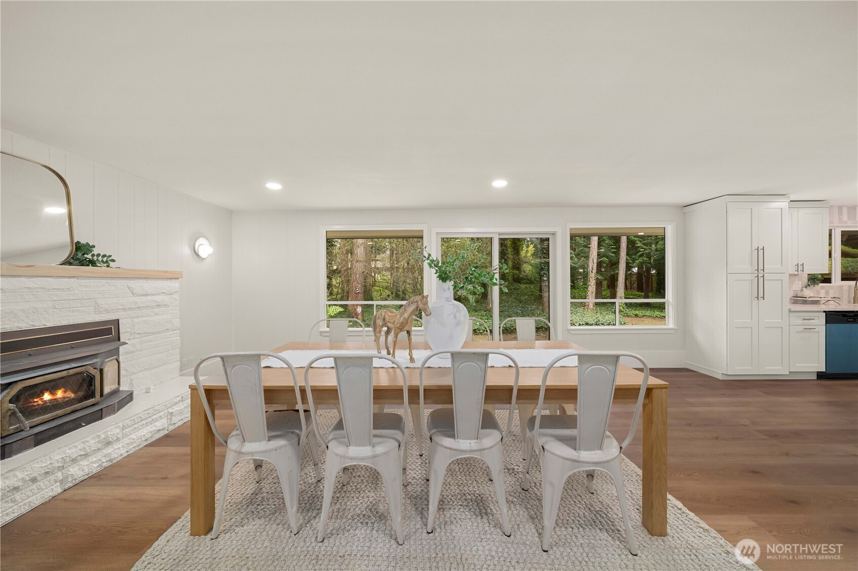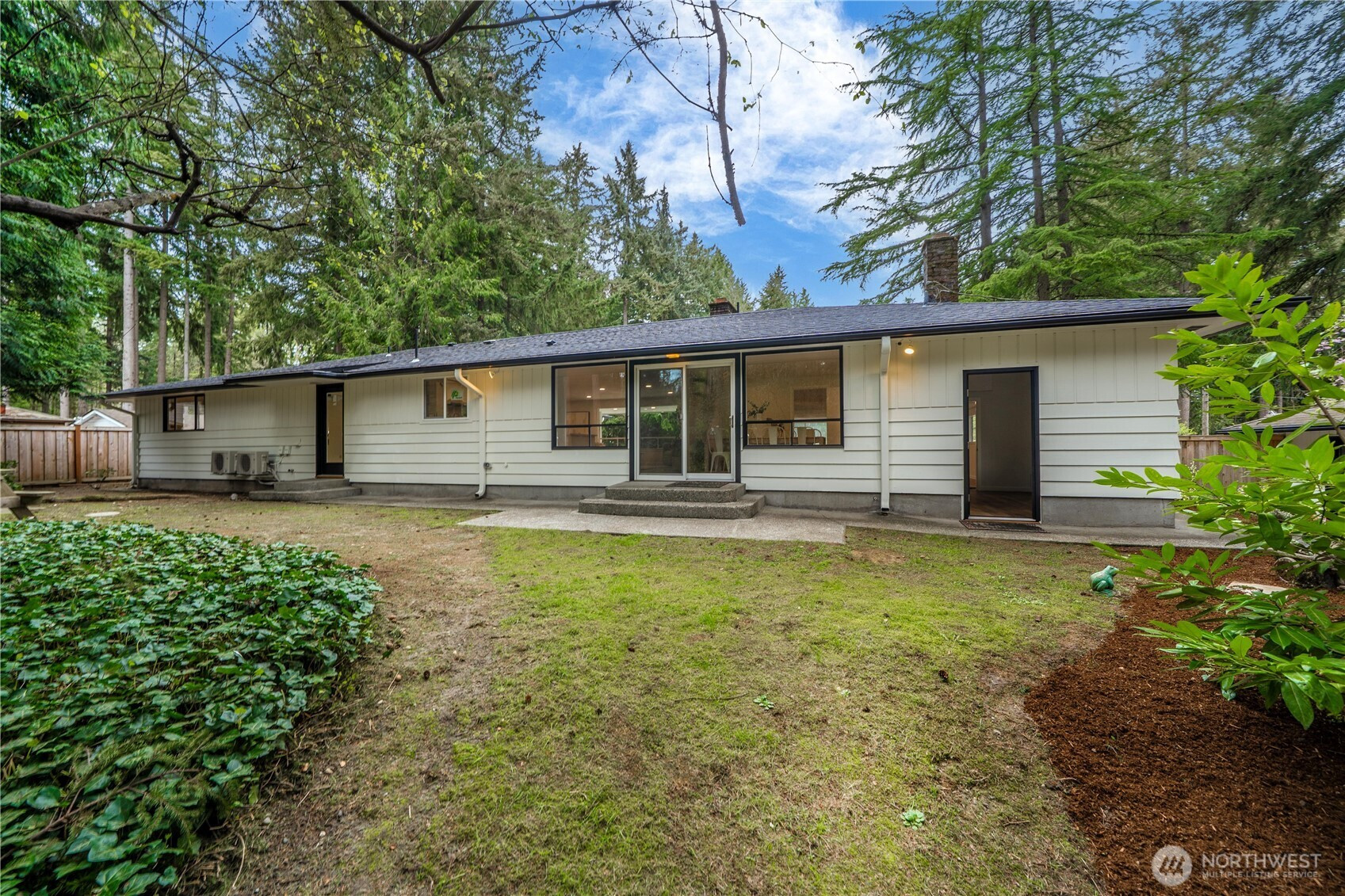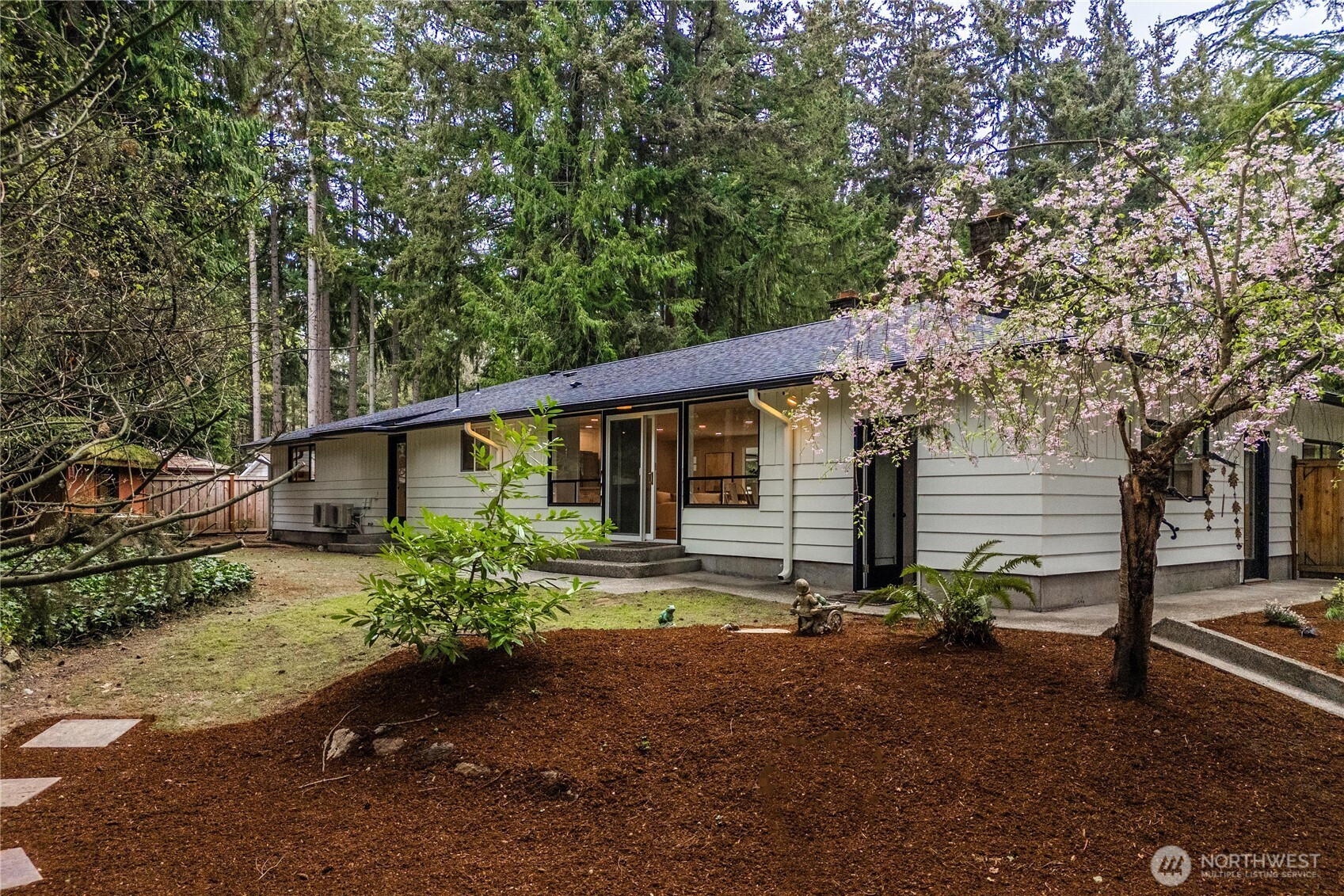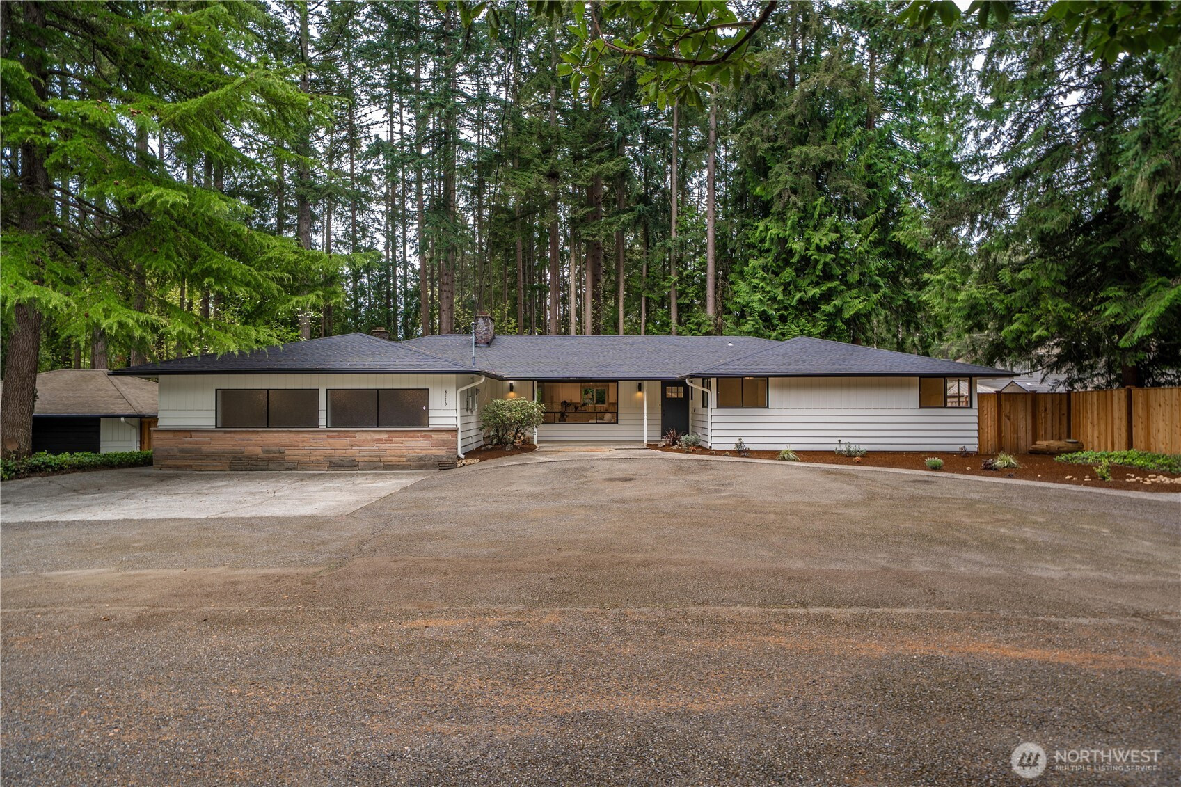 Fully renovated rambler nestled in a peaceful, wooded setting. This home features a new roof, gutters, fresh interior & exterior paint & high-end upgrades throughout. Step into the formal living room showcasing a stunning brick-surround fireplace & expansive windows that fill the space with natural light. The open-concept layout offers seamless sight lines into the spacious kitchen, complete with a center island with additional storage, new stainless steel appliances & a beautiful tile backsplash. The formal dining room features a second fireplace & a sliding glass door leading to the back patio—perfect for indoor-outdoor entertaining. Just steps down from the dining area, a generous family room provides versatile additional living space. The utility/mudroom includes a sink, closet for extra storage & direct access to the backyard. Bedrooms feature original built-ins, adding charm & functional storage. The primary suite offers a spa-like en-suite bath with a large vanity and an oversized walk-in shower adorned with elegant tile work. Outside, enjoy a park-like backyard with mature trees, manicured landscaping, a picnic area, and a concrete pathway leading to the detached two-car garage, which provides ample parking and storage. Situated on just over half an acre, this secluded property offers a tranquil, forest-like atmosphere while remaining just minutes from local amenities and freeway access. Potential opportunity to purchase the adjacent lot for added space or investment.