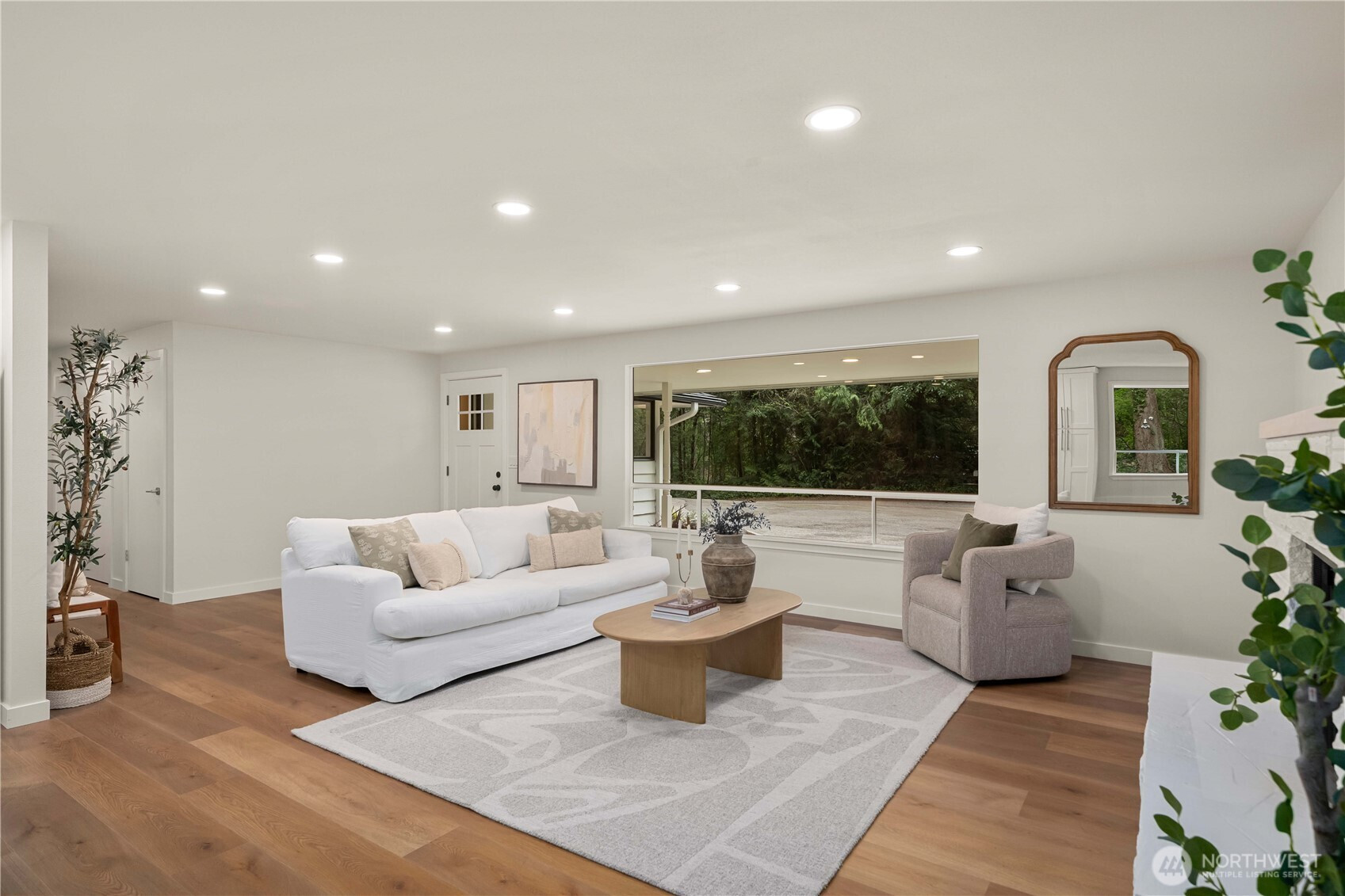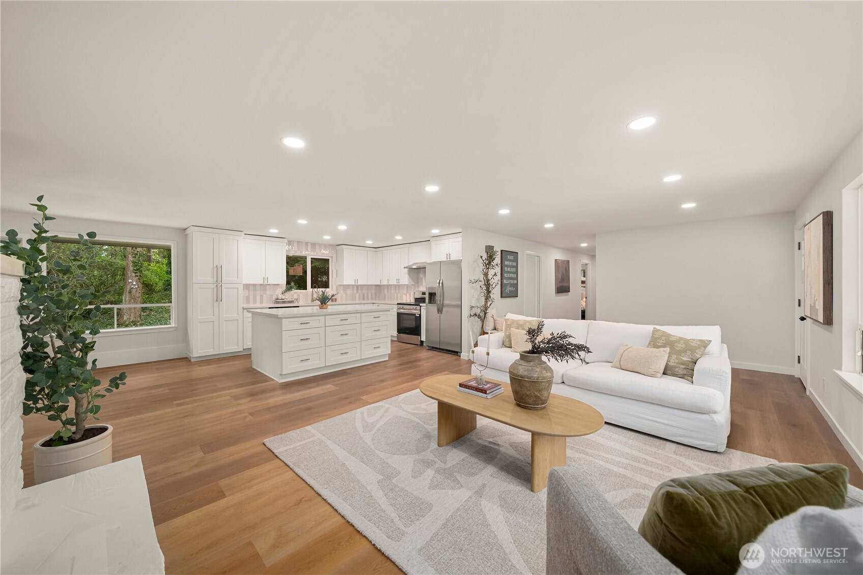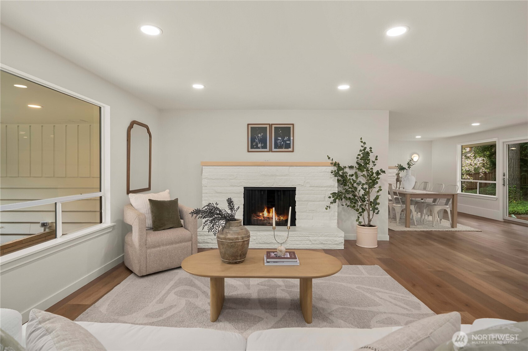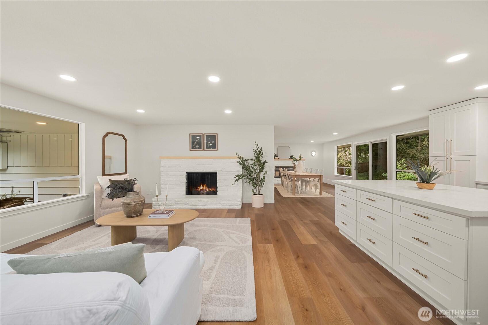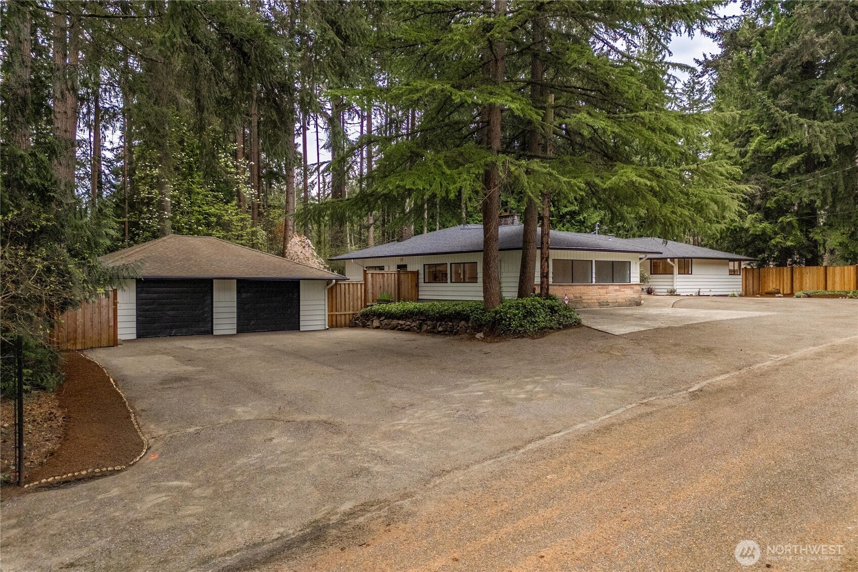 Fully renovated rambler nestled in a peaceful, wooded setting. This home features a new roof, gutters, fresh interior & exterior paint & high-end upgrades throughout. Step into the formal living room showcasing a stunning brick-surround fireplace & expansive windows that fill the space with natural light. The open-concept layout offers seamless sight lines into the spacious kitchen, complete with a center island with additional storage, new stainless steel appliances & a beautiful tile backsplash. The formal dining room features a second fireplace & a sliding glass door leading to the back patio—perfect for indoor-outdoor entertaining. Just steps down from the dining area, a generous family room provides versatile additional living space. The utility/mudroom includes a sink, closet for extra storage & direct access to the backyard. Bedrooms feature original built-ins, adding charm & functional storage. The primary suite offers a spa-like en-suite bath with a large vanity and an oversized walk-in shower adorned with elegant tile work. Outside, enjoy a park-like backyard with mature trees, manicured landscaping, a picnic area, and a concrete pathway leading to the detached two-car garage, which provides ample parking and storage. Situated on just over half an acre, this secluded property offers a tranquil, forest-like atmosphere while remaining just minutes from local amenities and freeway access. Potential opportunity to purchase the adjacent lot for added space or investment.