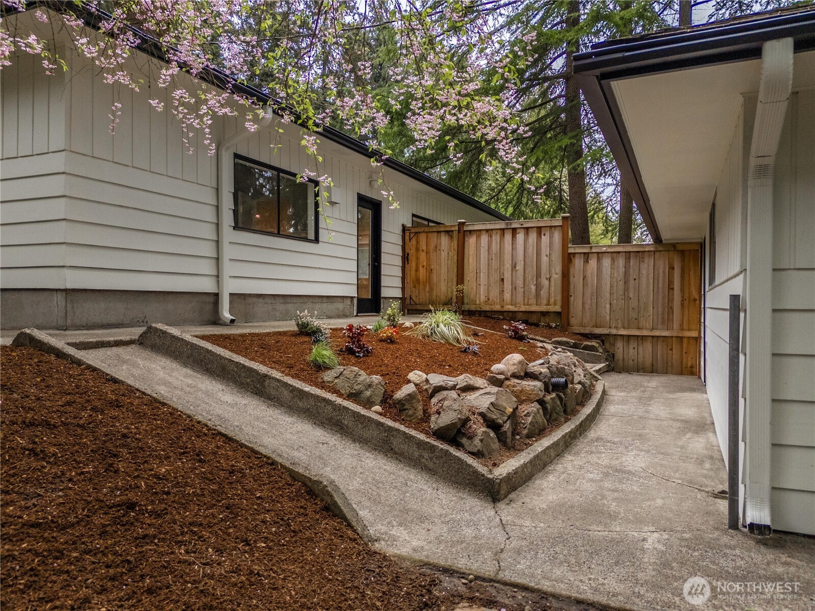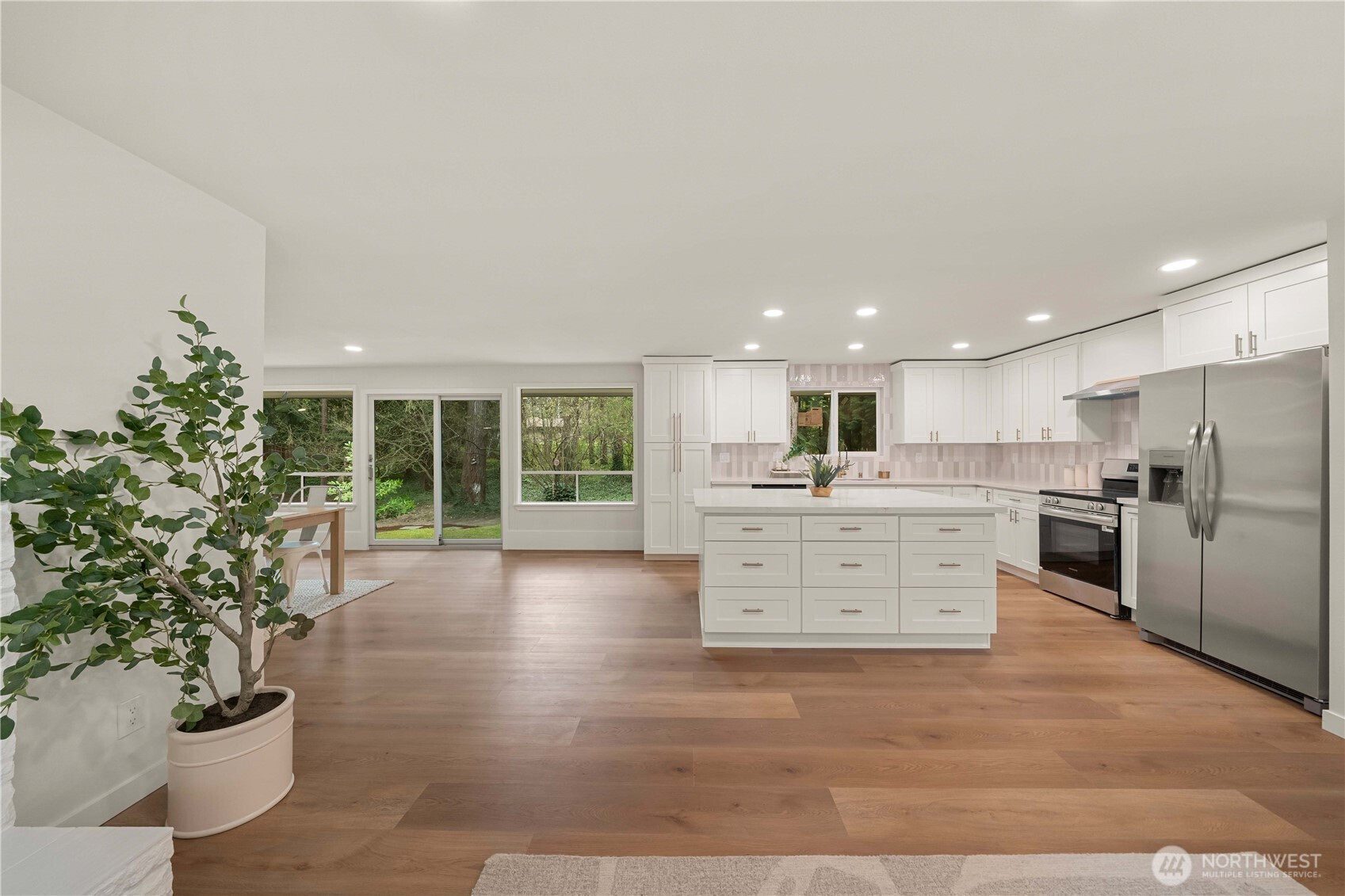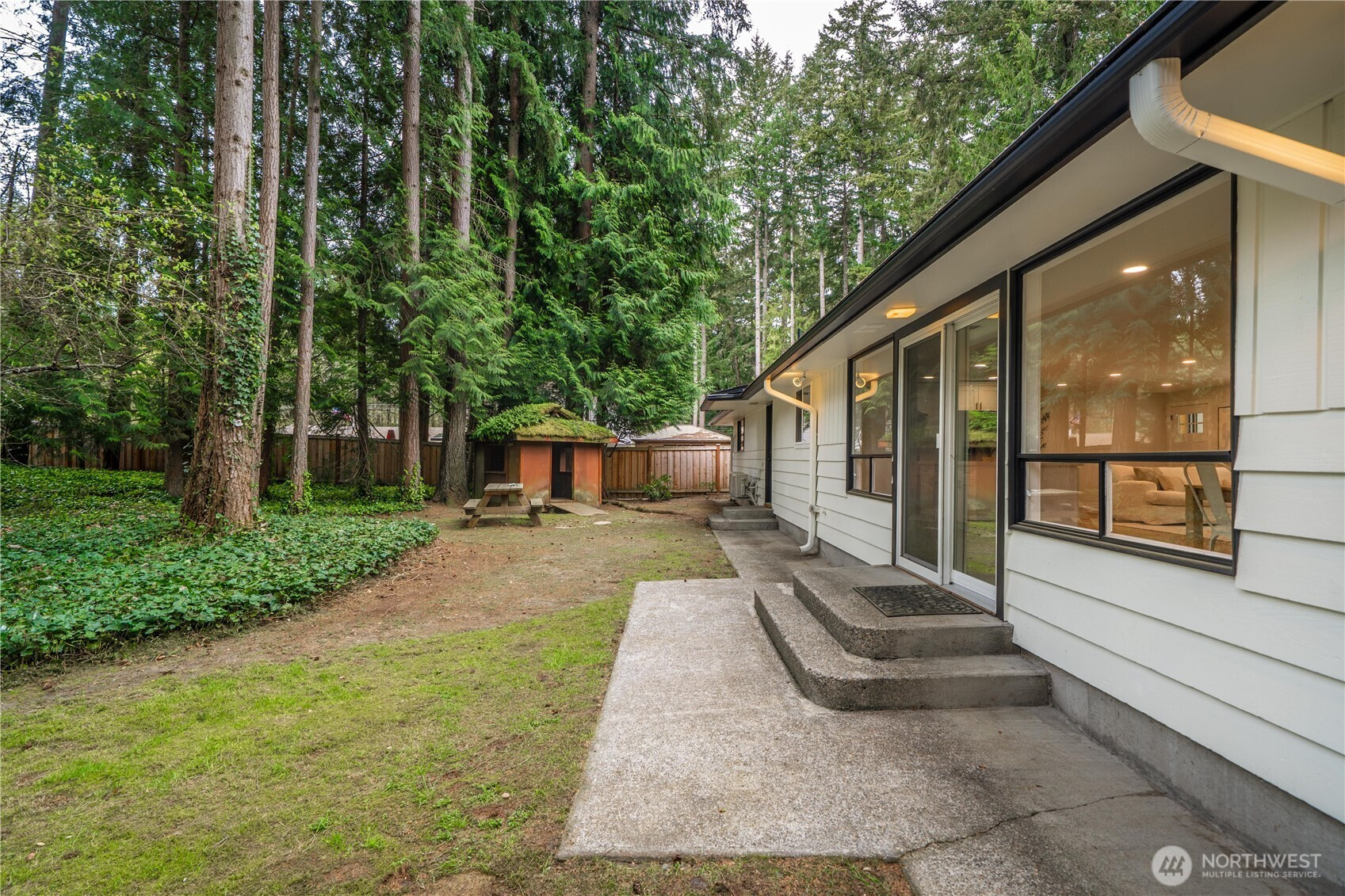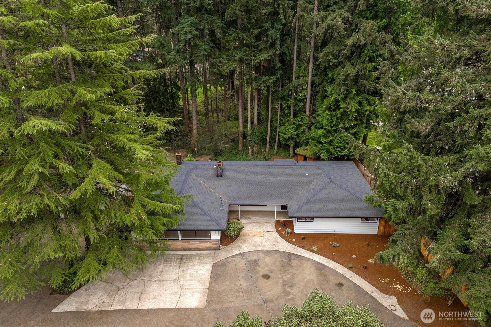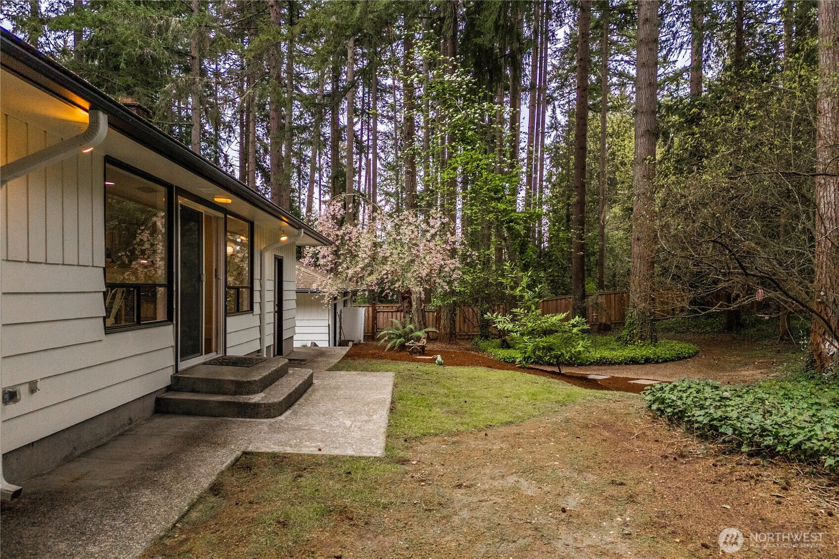 Fully renovated rambler nestled in a peaceful, wooded setting. This home features a new roof, gutters, fresh interior & exterior paint & high-end upgrades throughout. Step into the formal living room showcasing a stunning brick-surround fireplace & expansive windows that fill the space with natural light. The open-concept layout offers seamless sight lines into the spacious kitchen, complete with a center island with additional storage, new stainless steel appliances & a beautiful tile backsplash. The formal dining room features a second fireplace & a sliding glass door leading to the back patio—perfect for indoor-outdoor entertaining. Just steps down from the dining area, a generous family room provides versatile additional living space. The utility/mudroom includes a sink, closet for extra storage & direct access to the backyard. Bedrooms feature original built-ins, adding charm & functional storage. The primary suite offers a spa-like en-suite bath with a large vanity and an oversized walk-in shower adorned with elegant tile work. Outside, enjoy a park-like backyard with mature trees, manicured landscaping, a picnic area, and a concrete pathway leading to the detached two-car garage, which provides ample parking and storage. Situated on just over half an acre, this secluded property offers a tranquil, forest-like atmosphere while remaining just minutes from local amenities and freeway access. Potential opportunity to purchase the adjacent lot for added space or investment.
