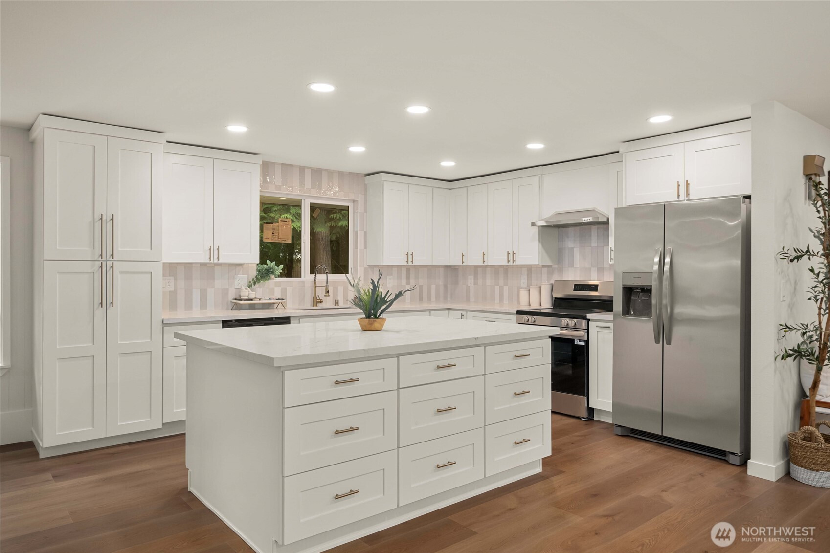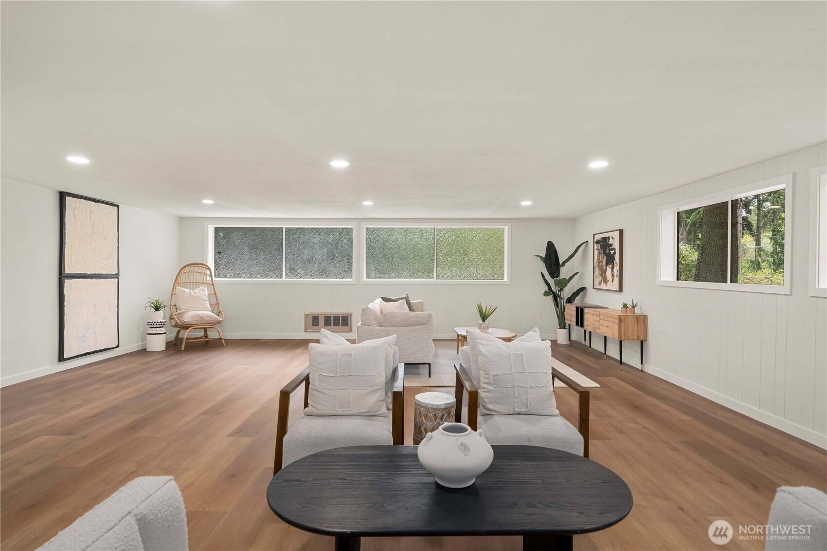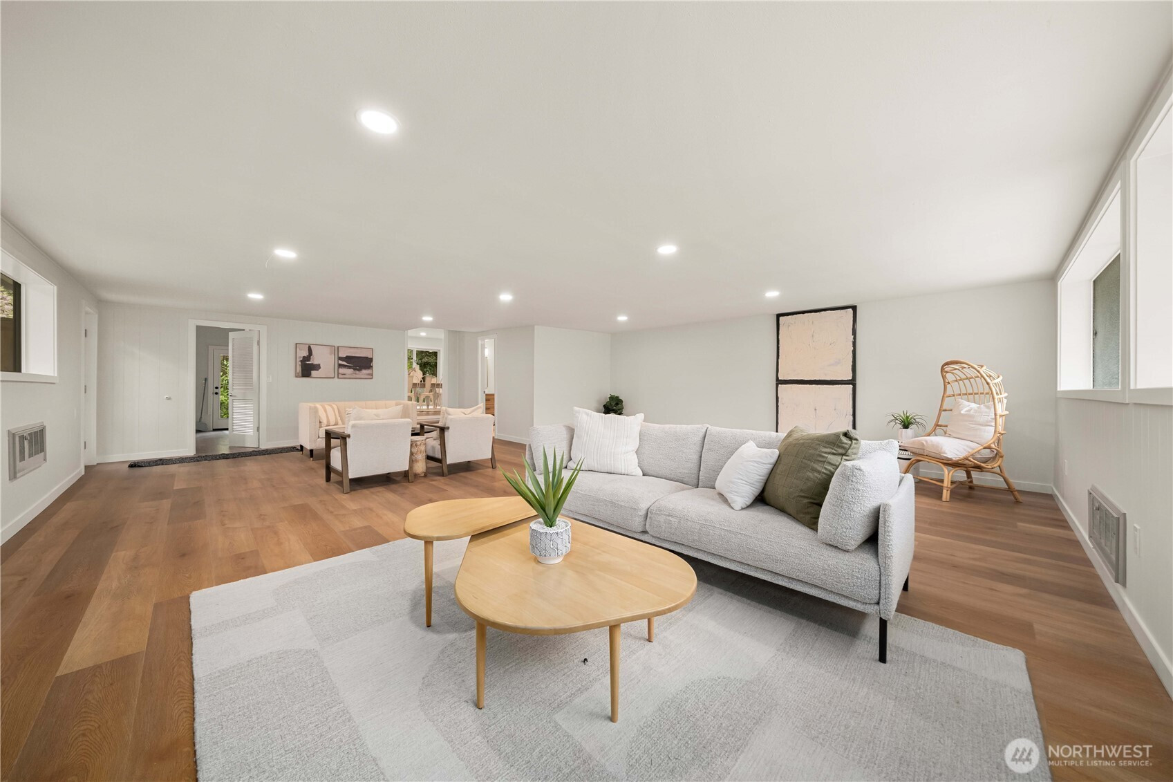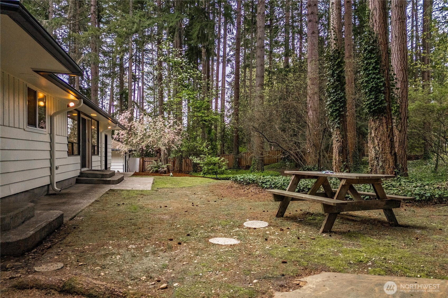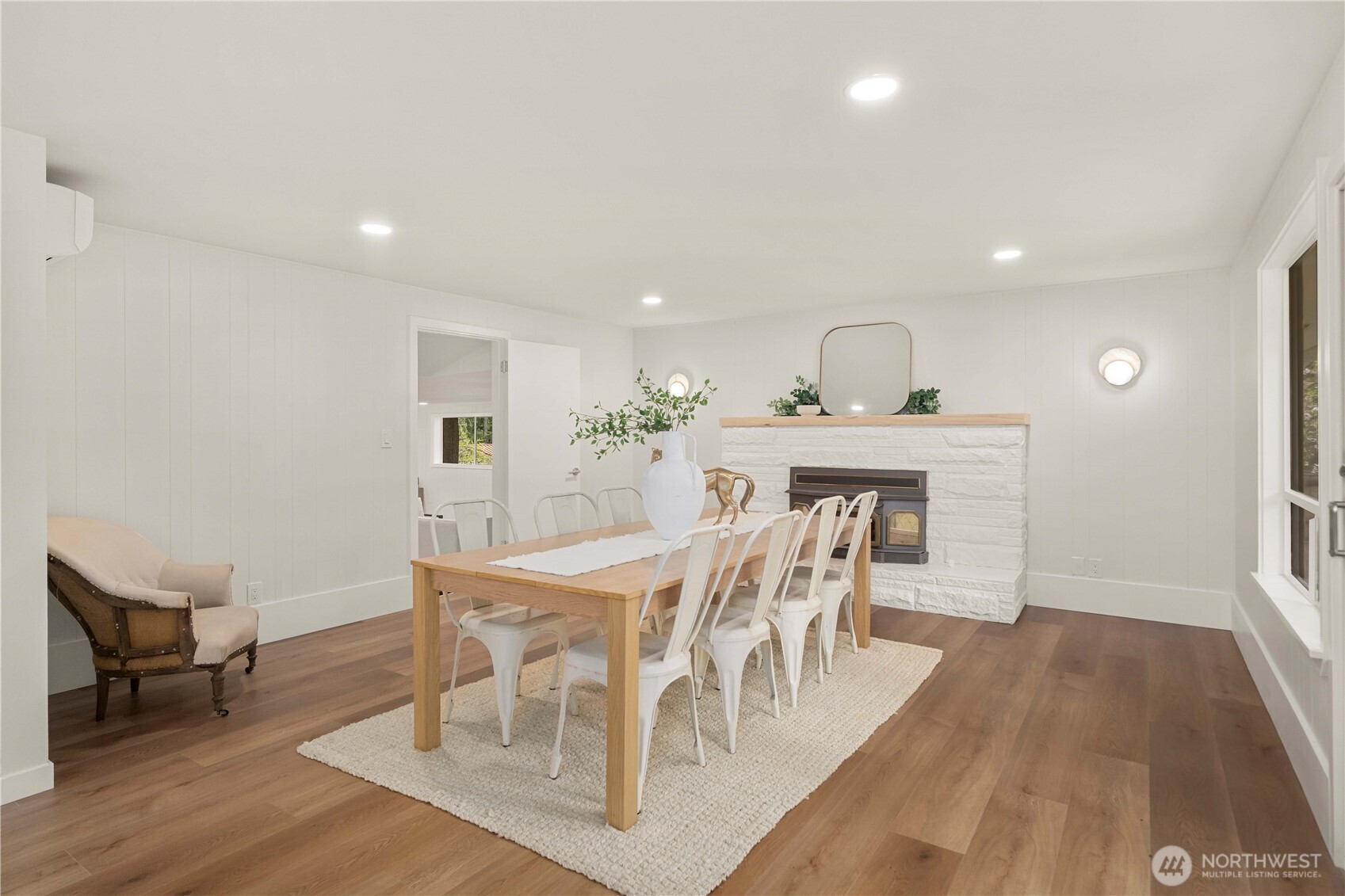 Fully renovated rambler nestled in a peaceful, wooded setting. This home features a new roof, gutters, fresh interior & exterior paint & high-end upgrades throughout. Step into the formal living room showcasing a stunning brick-surround fireplace & expansive windows that fill the space with natural light. The open-concept layout offers seamless sight lines into the spacious kitchen, complete with a center island with additional storage, new stainless steel appliances & a beautiful tile backsplash. The formal dining room features a second fireplace & a sliding glass door leading to the back patio—perfect for indoor-outdoor entertaining. Just steps down from the dining area, a generous family room provides versatile additional living space. The utility/mudroom includes a sink, closet for extra storage & direct access to the backyard. Bedrooms feature original built-ins, adding charm & functional storage. The primary suite offers a spa-like en-suite bath with a large vanity and an oversized walk-in shower adorned with elegant tile work. Outside, enjoy a park-like backyard with mature trees, manicured landscaping, a picnic area, and a concrete pathway leading to the detached two-car garage, which provides ample parking and storage. Situated on just over half an acre, this secluded property offers a tranquil, forest-like atmosphere while remaining just minutes from local amenities and freeway access. Potential opportunity to purchase the adjacent lot for added space or investment.