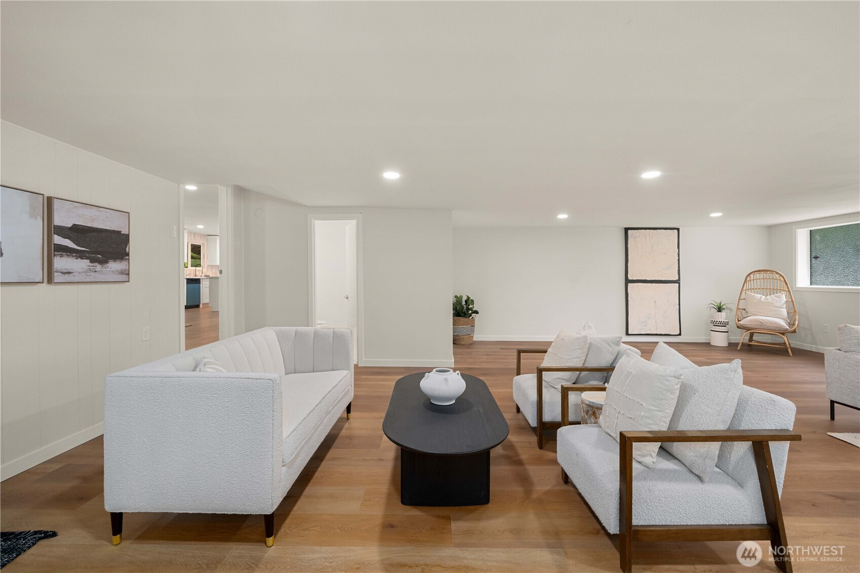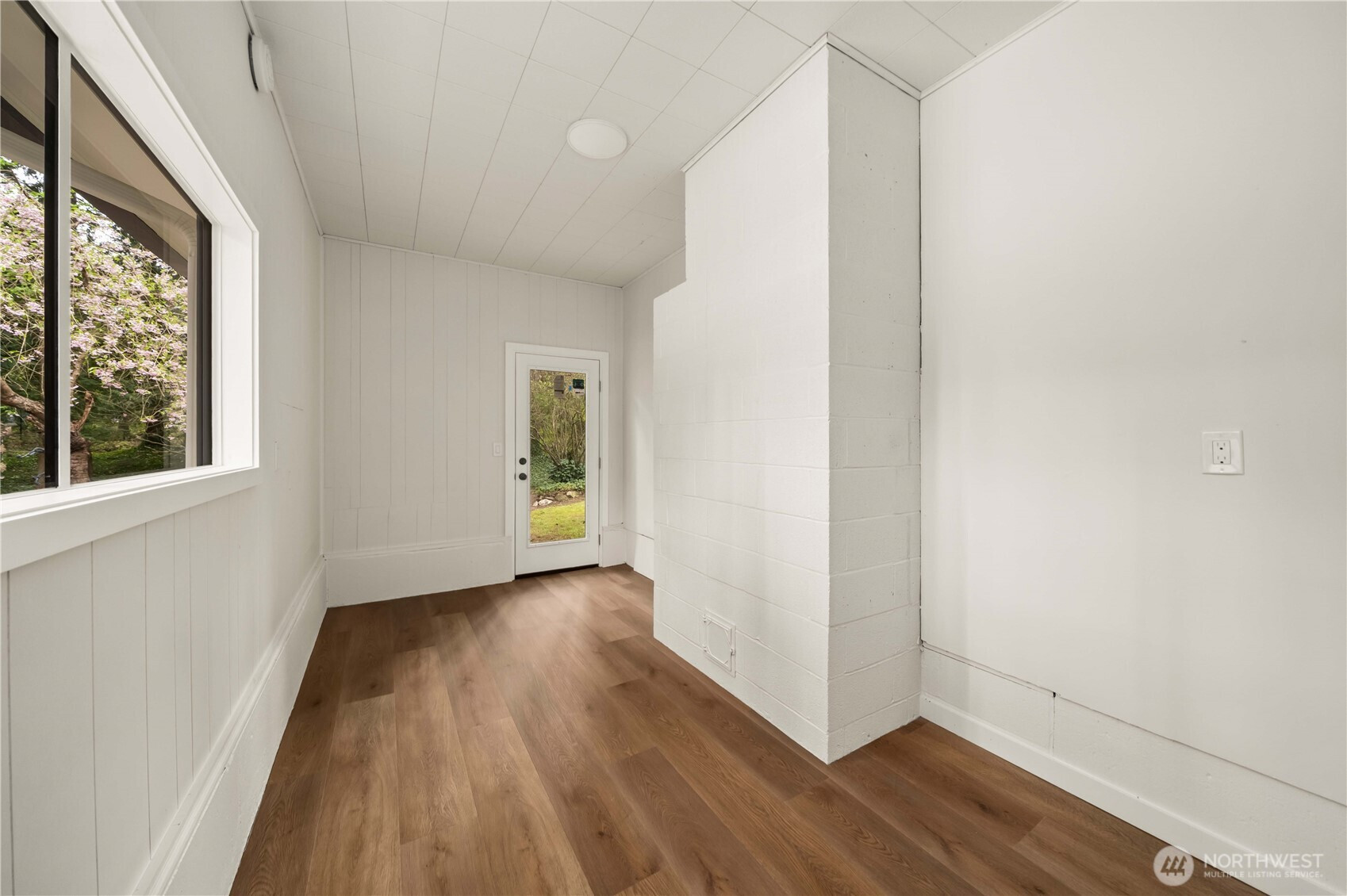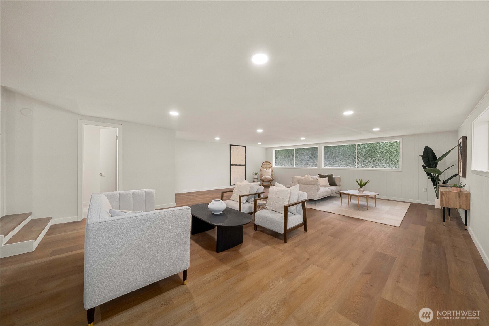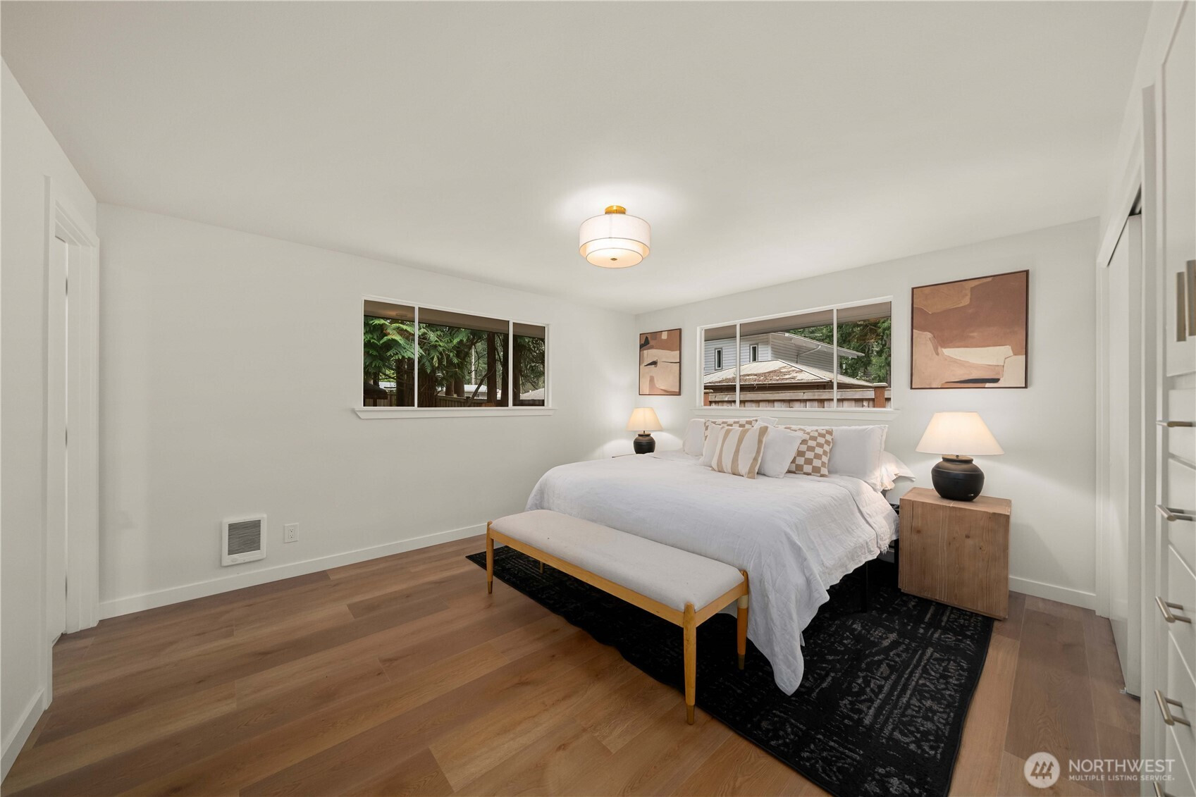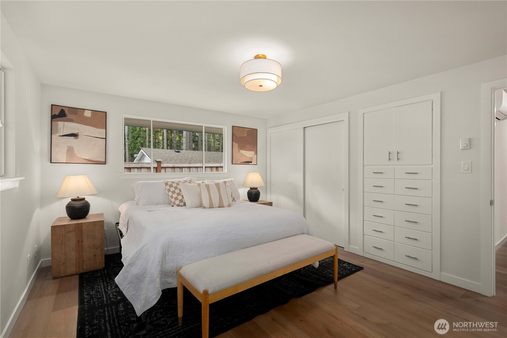 Fully renovated rambler nestled in a peaceful, wooded setting. This home features a new roof, gutters, fresh interior & exterior paint & high-end upgrades throughout. Step into the formal living room showcasing a stunning brick-surround fireplace & expansive windows that fill the space with natural light. The open-concept layout offers seamless sight lines into the spacious kitchen, complete with a center island with additional storage, new stainless steel appliances & a beautiful tile backsplash. The formal dining room features a second fireplace & a sliding glass door leading to the back patio—perfect for indoor-outdoor entertaining. Just steps down from the dining area, a generous family room provides versatile additional living space. The utility/mudroom includes a sink, closet for extra storage & direct access to the backyard. Bedrooms feature original built-ins, adding charm & functional storage. The primary suite offers a spa-like en-suite bath with a large vanity and an oversized walk-in shower adorned with elegant tile work. Outside, enjoy a park-like backyard with mature trees, manicured landscaping, a picnic area, and a concrete pathway leading to the detached two-car garage, which provides ample parking and storage. Situated on just over half an acre, this secluded property offers a tranquil, forest-like atmosphere while remaining just minutes from local amenities and freeway access. Potential opportunity to purchase the adjacent lot for added space or investment.