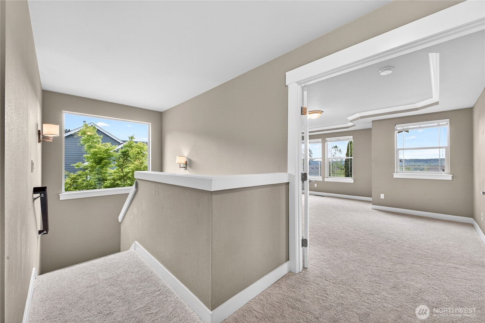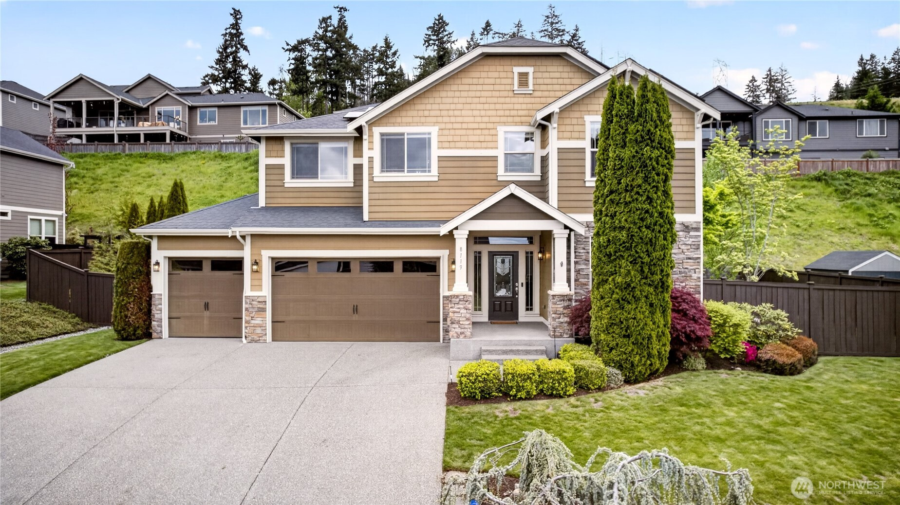 Beautifully and thoughtfully designed, this 3 bedroom, 2.5 bath home welcomes you with a spacious and inviting layout centered around the elegant dining room, well-appointed butler’s pantry, and stunning great room complete with display shelves and gas fireplace —creating the perfect flow for both everyday living and entertaining. The open-concept design continues into the kitchen, featuring a large island, stainless appliances, double oven, a gas range, and abundant cabinet and counter space. Upstairs, you’ll find a versatile bonus/media room, along with the second and third bedrooms, plus a spacious landing and a conveniently located utility room with extra cabinetry and a utility sink. The luxurious primary suite features a coved ceiling, serene views, a private bath with soaking tub, tile-surround shower, double sinks, and a generous walk-in closet with built-in organization. Step outside to enjoy year-round outdoor living on the covered deck with skylight, gas fireplace, and lighting—ideal for relaxing evenings or entertaining guests. An additional brick patio expands your outdoor options; all set within a fully fenced and beautifully landscaped ¼-acre lot with sprinkler system. Additional highlights include new carpet, hardwood floors, air conditioning and solar panels for energy efficiency and long-term savings—adding even more value to this exceptional home. This home truly has it all—space, upgrades, and incredible indoor-outdoor living!