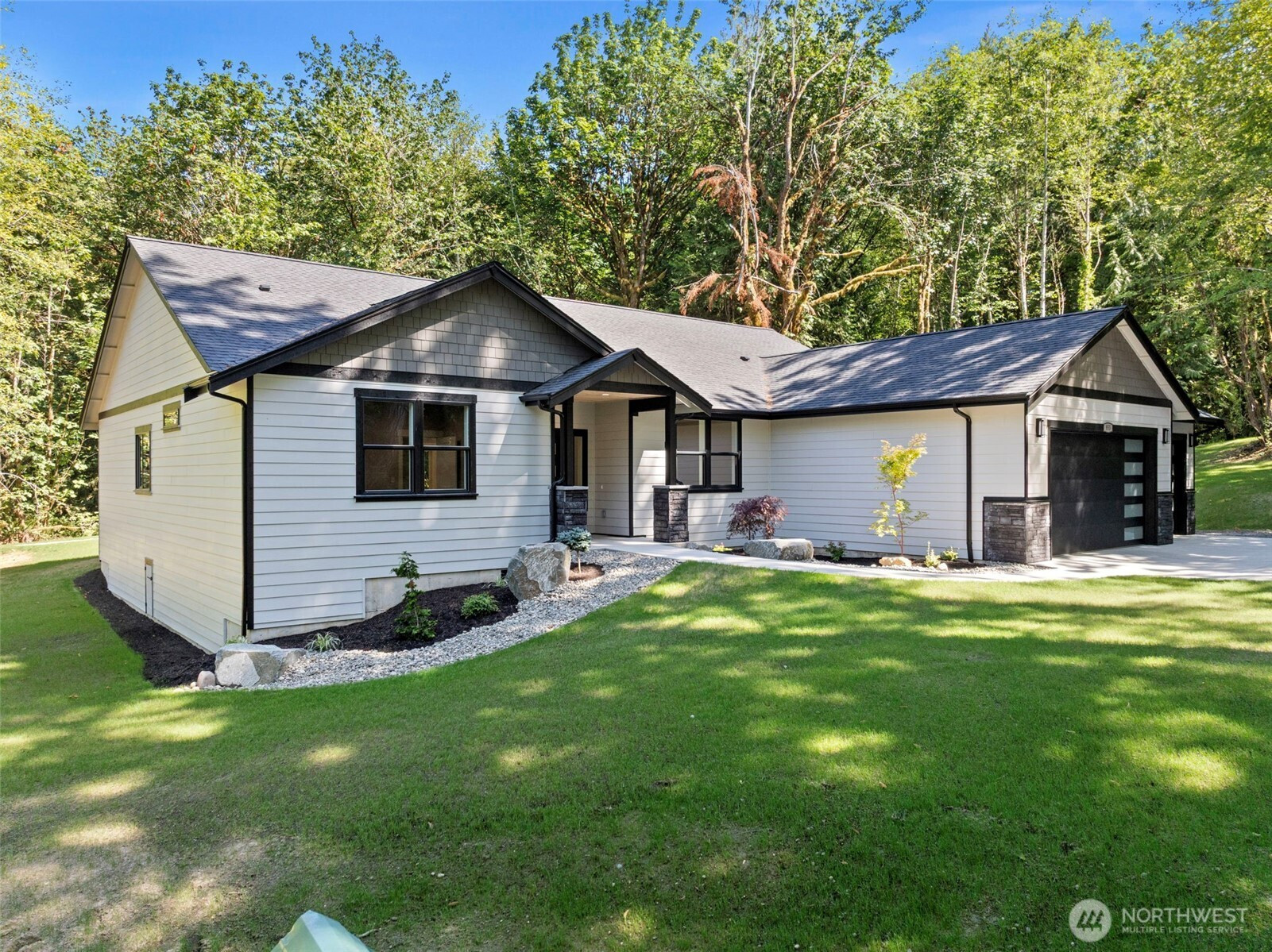 All the amenities you want in a brand new home, without the neighbors or HOA! The build quality of this rambler is top notch with durable LVP floors, all SS appliances, luxury oversized stone in the bathrooms, & vaulted ceilings. The kitchen is massive with a giant island featuring quartz countertops and a walk-in pantry. The spacious master suite has a 5 piece bath with enormous walk-in closet and views of your verdant property when you wake up. Two flex spaces offer endless possibilities. Outside you live in a natural playground with a seasonal creek running through it all. Nature sightings are constant & the beach and boat launch in Von Geldern Cove are literally 1 min away! 1 year builder's warranty included! Fence negotiable.