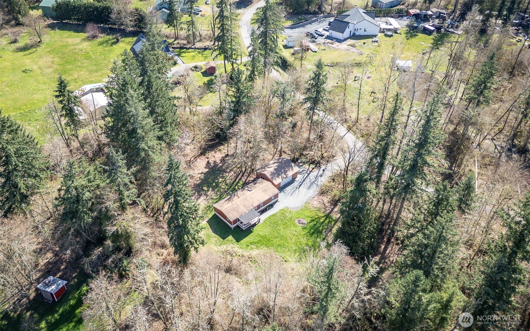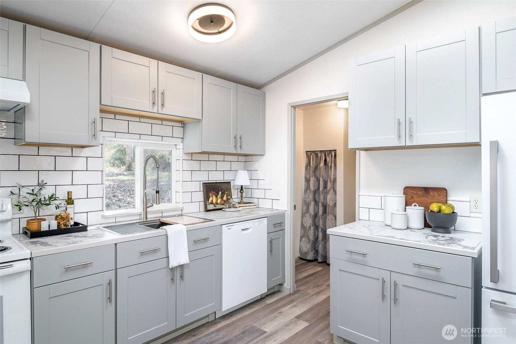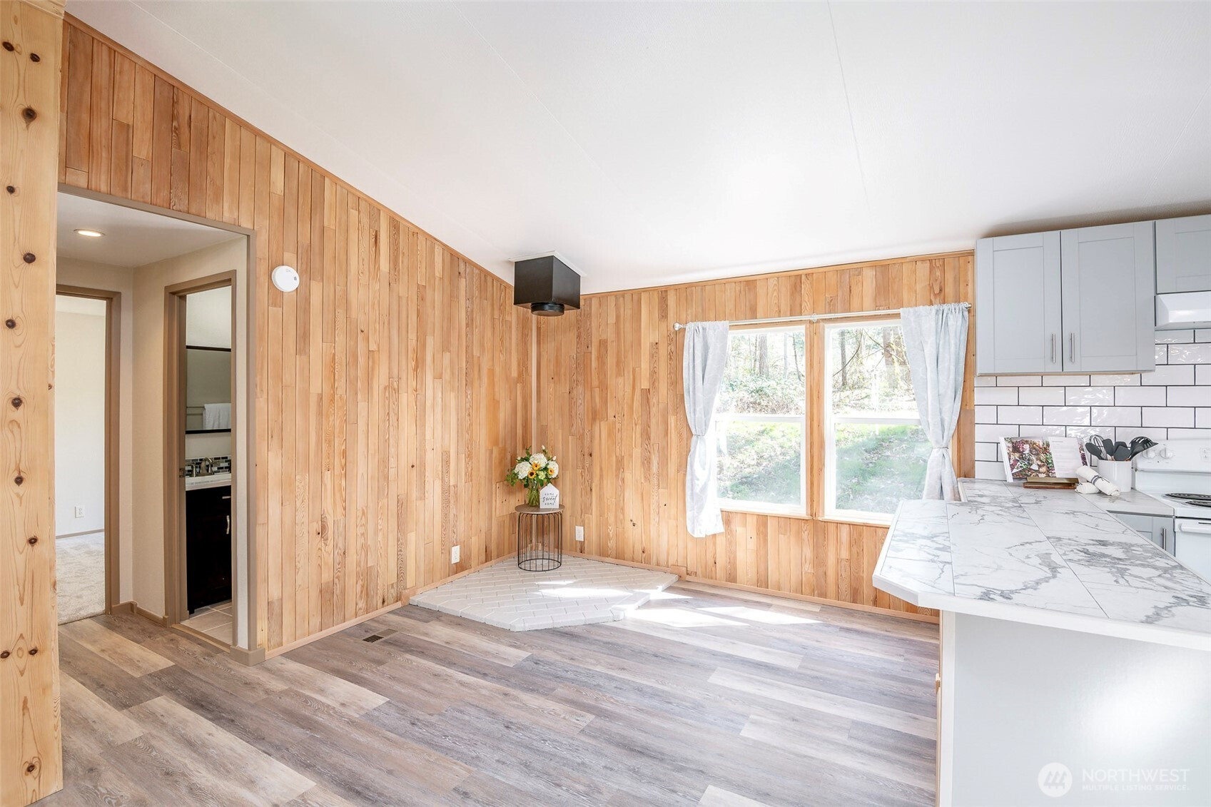 This beautifully updated rambler is nestled on a peaceful 2.5-acre lot in Eatonville, offering both style and comfort. The open-concept great room with its inviting living and dining areas boasts a charming ship-lap wall accent, durable vinyl flooring, and soaring vaulted ceilings featuring a striking wooden beam accent. The chef’s kitchen is a true highlight, with a full-height tile backsplash, sleek grey shaker cabinets, and brand-new appliances—perfect for cooking and entertaining. The spacious master suite features a walk-in closet with a barn door entry, along with a newly remodeled 3/4 en-suite bath, including a tiled walk-in shower and a modern dual-sink vanity. Two additional generously-sized guest rooms provide plenty of space for visitors, along with a stylish full guest bath. Throughout the home, a whole-house stereo system enhances the ambiance. Outside, the large detached 2-car garage offers ample storage, and there’s plenty of space for RV parking. Enjoy the surrounding territorial views and the privacy that comes with a property of this size. This home is the perfect blend of modern updates and serene country living!