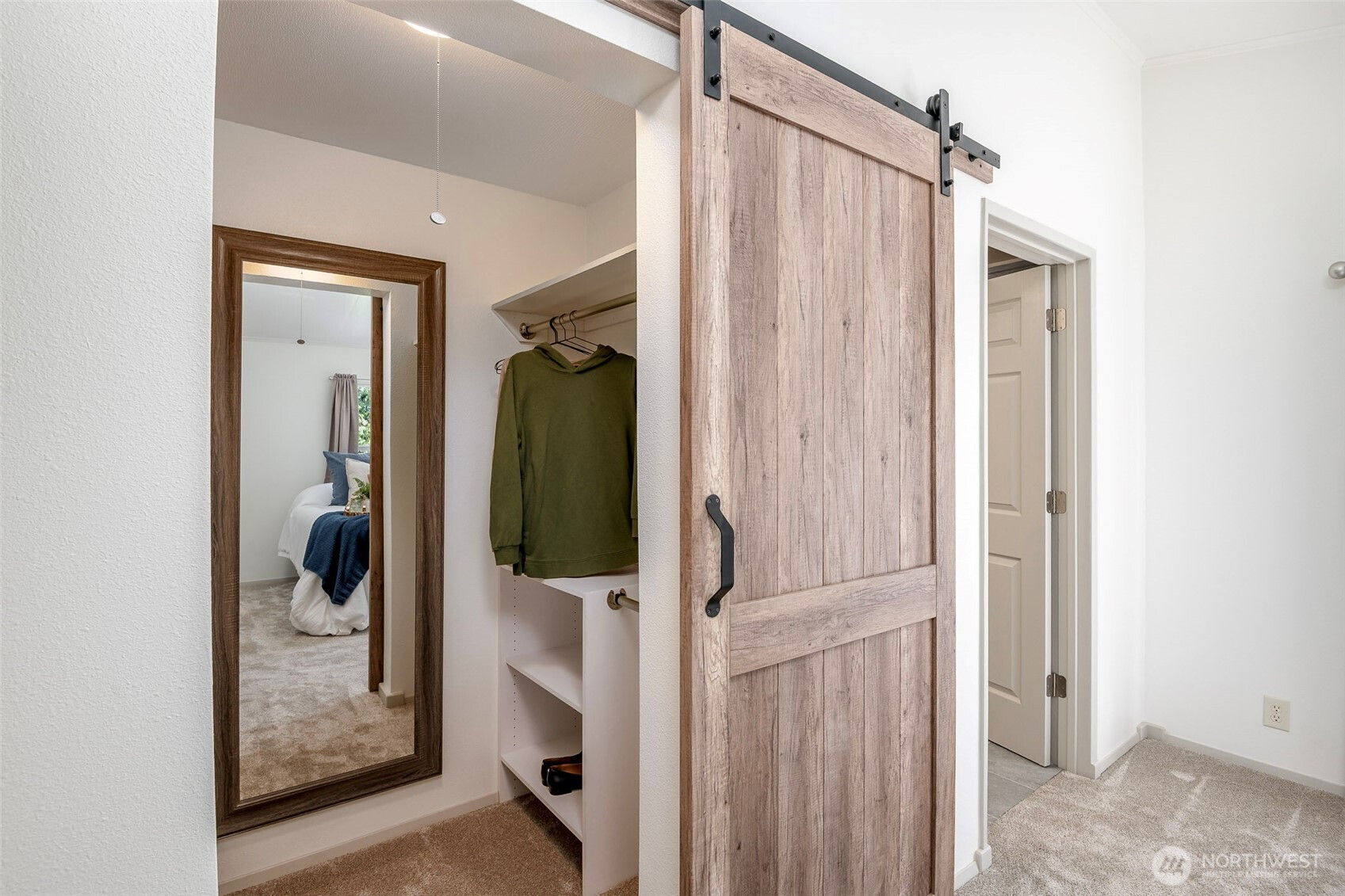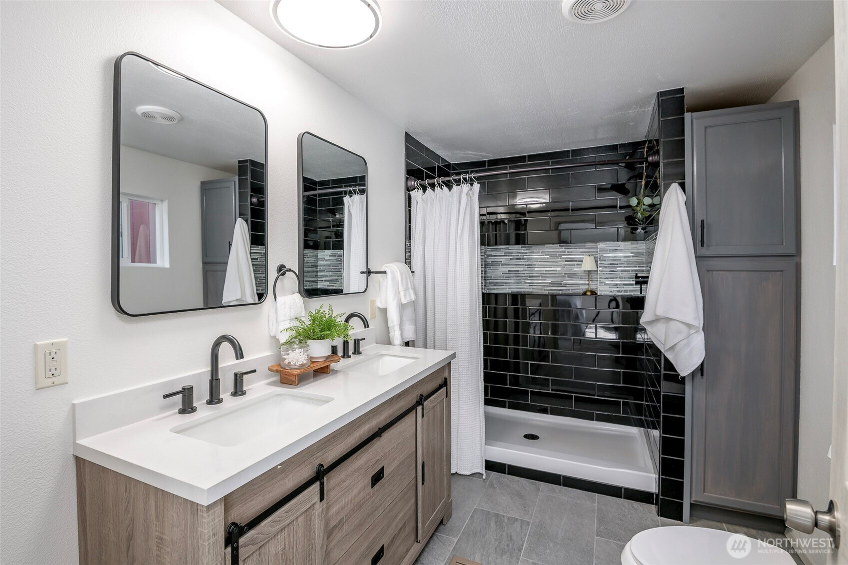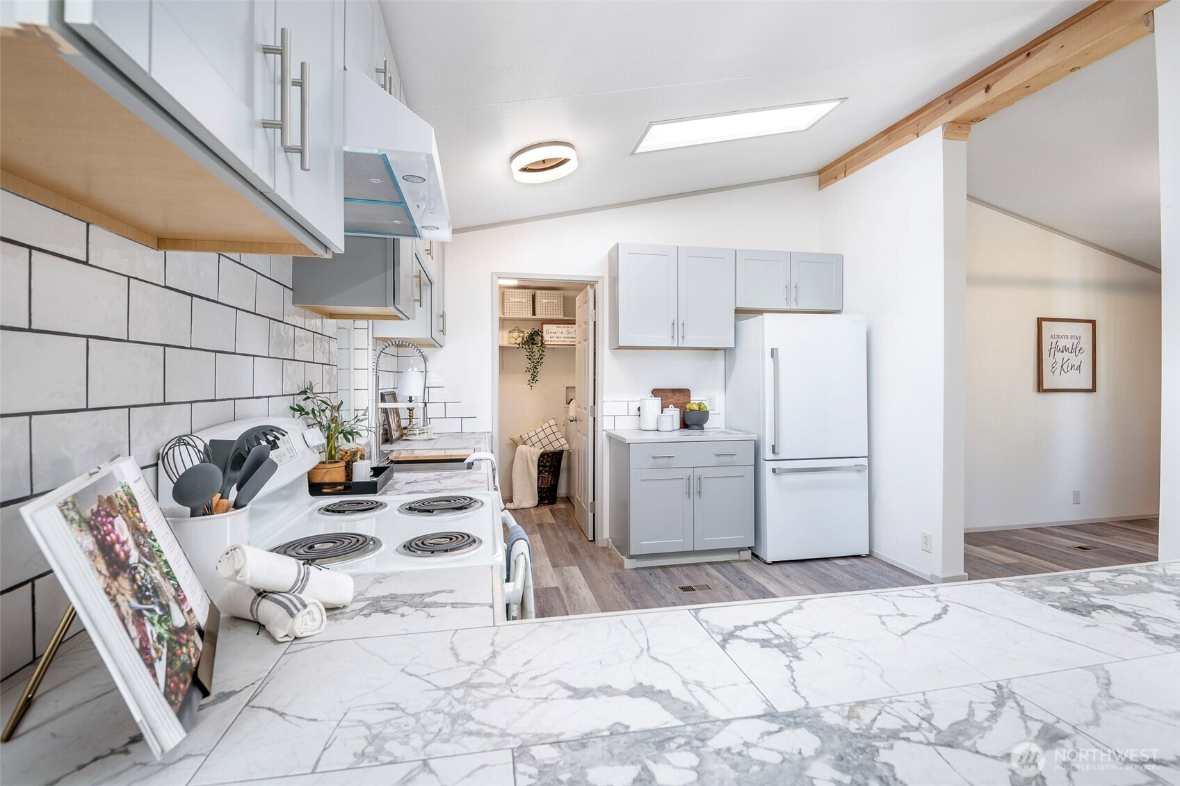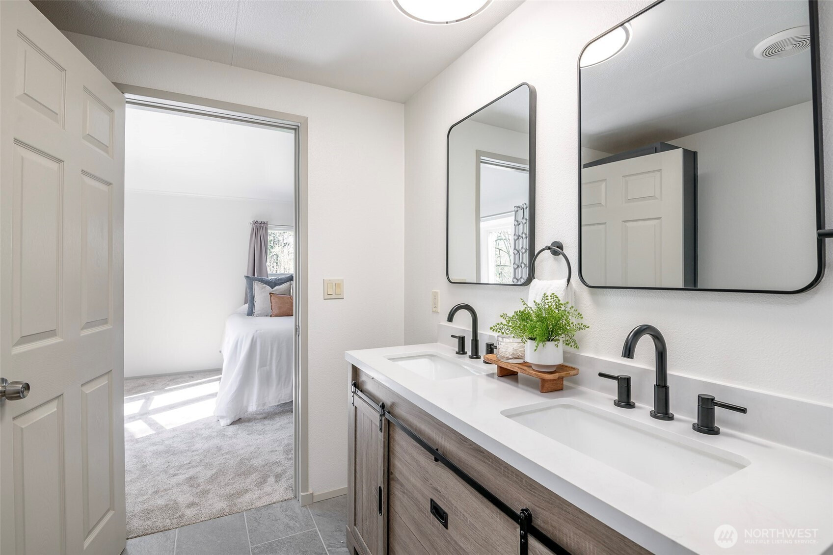 This beautifully updated rambler is nestled on a peaceful 2.5-acre lot in Eatonville, offering both style and comfort. The open-concept great room with its inviting living and dining areas boasts a charming ship-lap wall accent, durable vinyl flooring, and soaring vaulted ceilings featuring a striking wooden beam accent. The chef’s kitchen is a true highlight, with a full-height tile backsplash, sleek grey shaker cabinets, and brand-new appliances—perfect for cooking and entertaining. The spacious master suite features a walk-in closet with a barn door entry, along with a newly remodeled 3/4 en-suite bath, including a tiled walk-in shower and a modern dual-sink vanity. Two additional generously-sized guest rooms provide plenty of space for visitors, along with a stylish full guest bath. Throughout the home, a whole-house stereo system enhances the ambiance. Outside, the large detached 2-car garage offers ample storage, and there’s plenty of space for RV parking. Enjoy the surrounding territorial views and the privacy that comes with a property of this size. This home is the perfect blend of modern updates and serene country living!