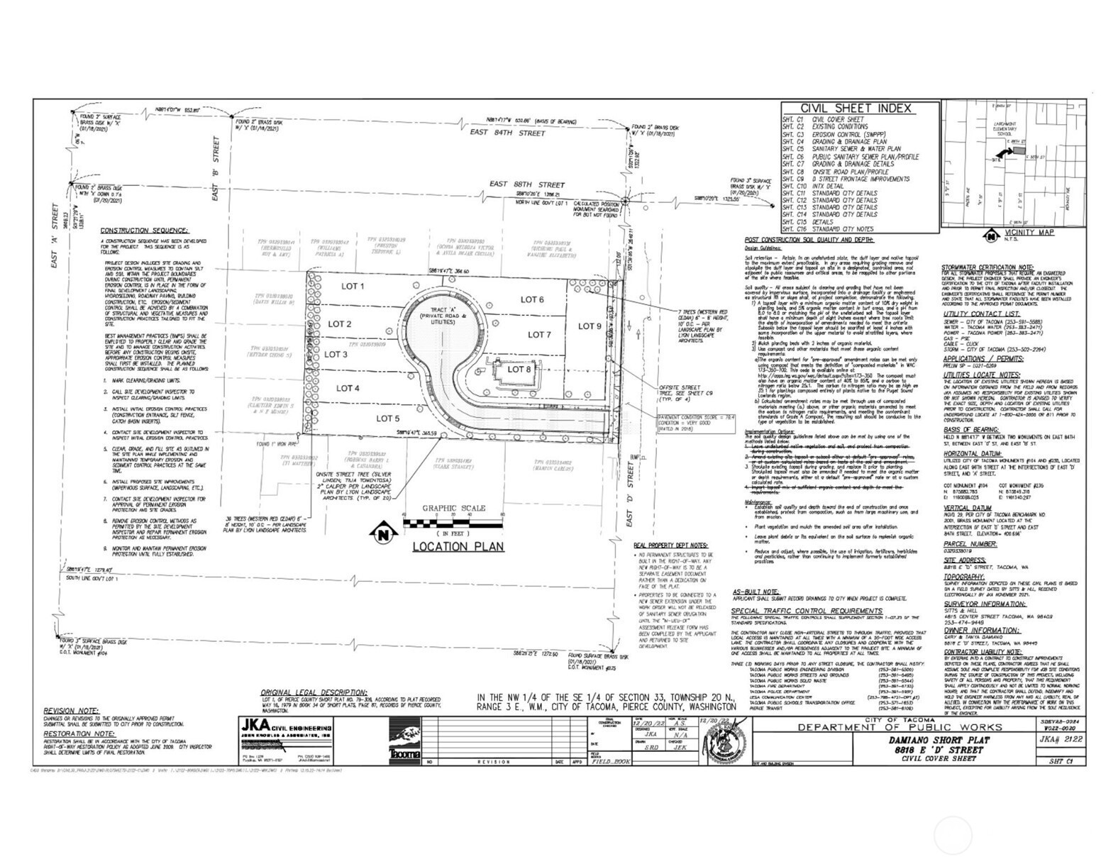 Investors/Builders. Great opportunity for a City-approved short plat of 1.78 acres, creating 9 residential building lots averaging 5,565 sq. ft., including the existing 1,728 sq. ft. house. Located in a quiet residential neighborhood, close to shopping, schools, and minutes to I-5 & 512. Thanks to the Feb 2025 "Home in Tacoma Plan", the property was also rezoned Urban Residential-2 (UR-2) to allow for even more building opportunities. This level property has electric, water, and sewer on-site and is ready to be developed. The existing 4-bedroom, 2-bath house will need updating, but it is in good to fair overall condition.