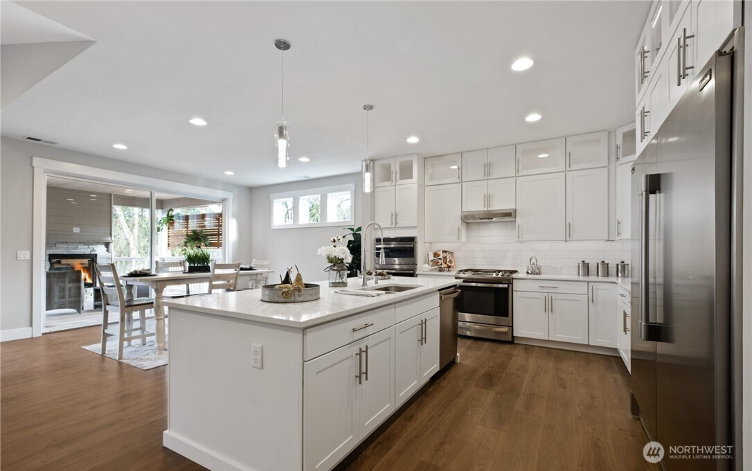 Set among mature trees in desirable Edgewood, this newer luxury home community offers a refined blend of privacy, tranquility, and modern design. Situated on its own spacious lot, this 2,367 square foot modern craftsman home showcases thoughtful craftsmanship and upscale finishes throughout. As you enter into the foyer and then into the living area you'll enjoy custom tray ceilings and intergraded ambient LED cove lighting, crisp white millwork, high vaulted ceilings and a gas fireplace with full-height stone create a warm yet sophisticated ambiance. The chef’s kitchen features quartz countertops, soft-close cabinetry, stainless steel appliances including industrial refrigerator, dual oven and a built-in beverage fridge—perfect for entertaining. The home offers three large bedrooms and 2.5 baths, including a spacious primary suite with an elegant private bath designed as a relaxing retreat with freestanding tub. Enjoy year-round comfort with a newer AC system, along with covered patios equipped with a gas fireplace and TV outlet for seamless indoor-outdoor living which includes a gazebo. Additional highlights include a spacious three-car garage, full front and back landscaping and numerous refined details throughout. A must-see home offering luxury, comfort, and timeless appeal.