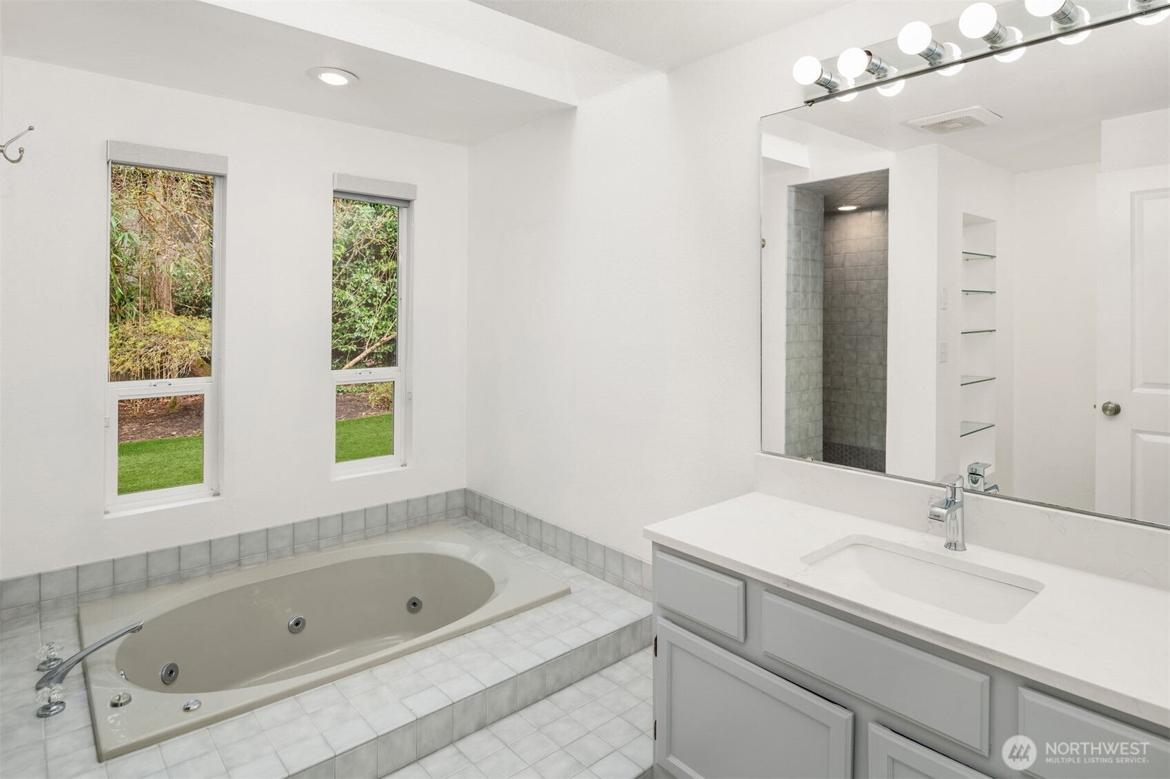 Perched atop a majestically landscaped 1/3 acre dream lot with private evergreens & lush ornamental gardens, this sprawling 2,017sf mid-century rambler is a solid move-in ready gem! Captivating curb appeal with fresh paint, new roof & courtyard entry with extensive brick accents. Loaded with modern updates, the spacious flowing floor plan features tall windows & copius skylights filled with natural light. Hardwood foyer opens to sunken living room with floor-to-ceiling fireplace & bay window. Formal dining with expansive french doors opens to stunning oak kitchen with seamless Corian counters & stainless steel appliances. Massive family room with soaring cathedral ceilings & wet bar opens to impressive laundry room with vaulted ceilings, skylights, abundant cabinetry & luxuriously updated 3/4 bath. Primary suite with grand walk-in closet. Lavish custom bath with sunken jetted tub & oversized walk-in shower. Designer paint, white millwork, new flooring, on-demand hot water & central A/C throughout. An extraordinary outdoor living oasis, the gorgeous backyard features manicured grounds, dual entertainment decks, wrap-around bench seating & patio wired for hot tub!