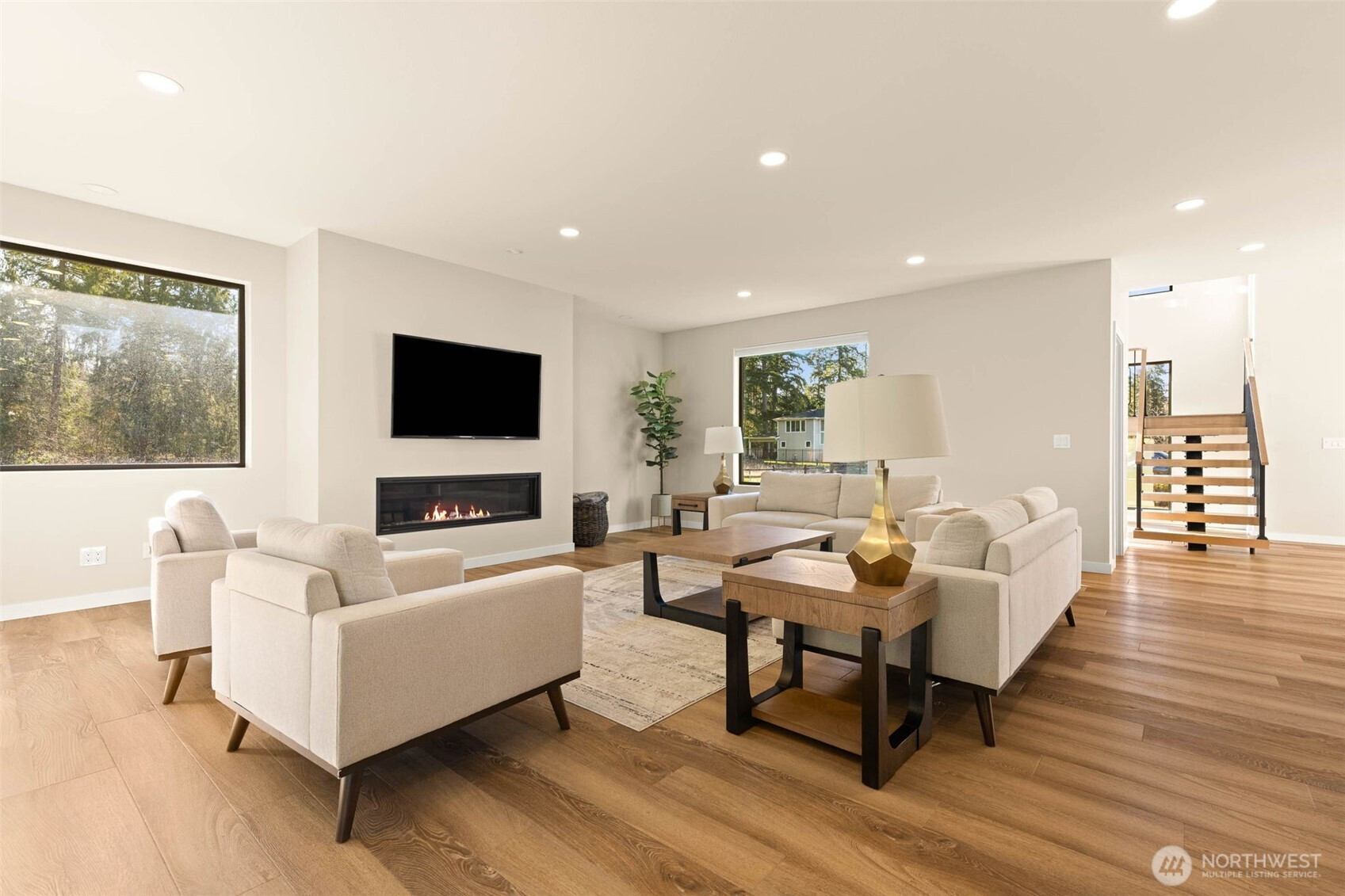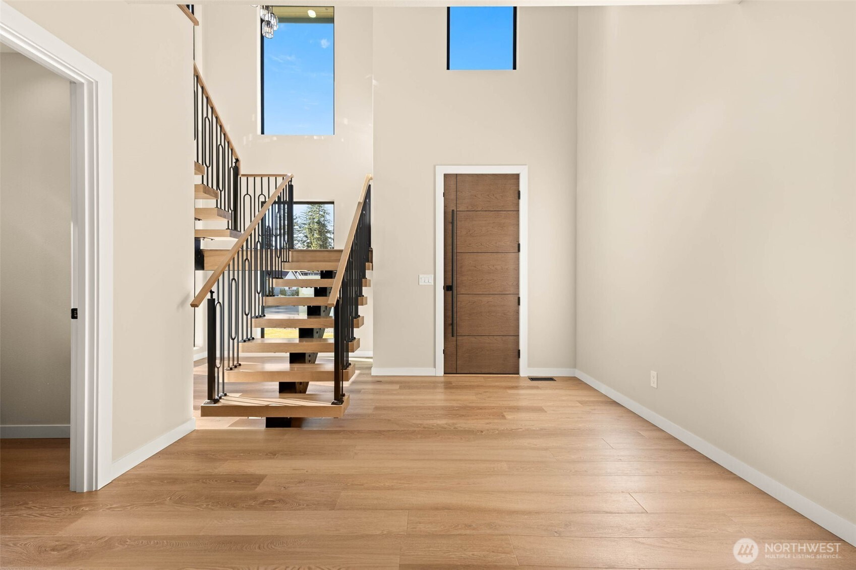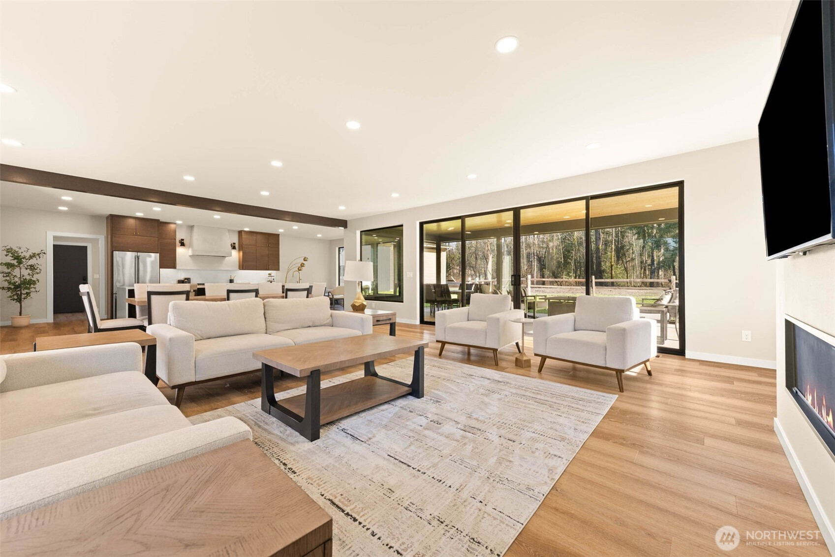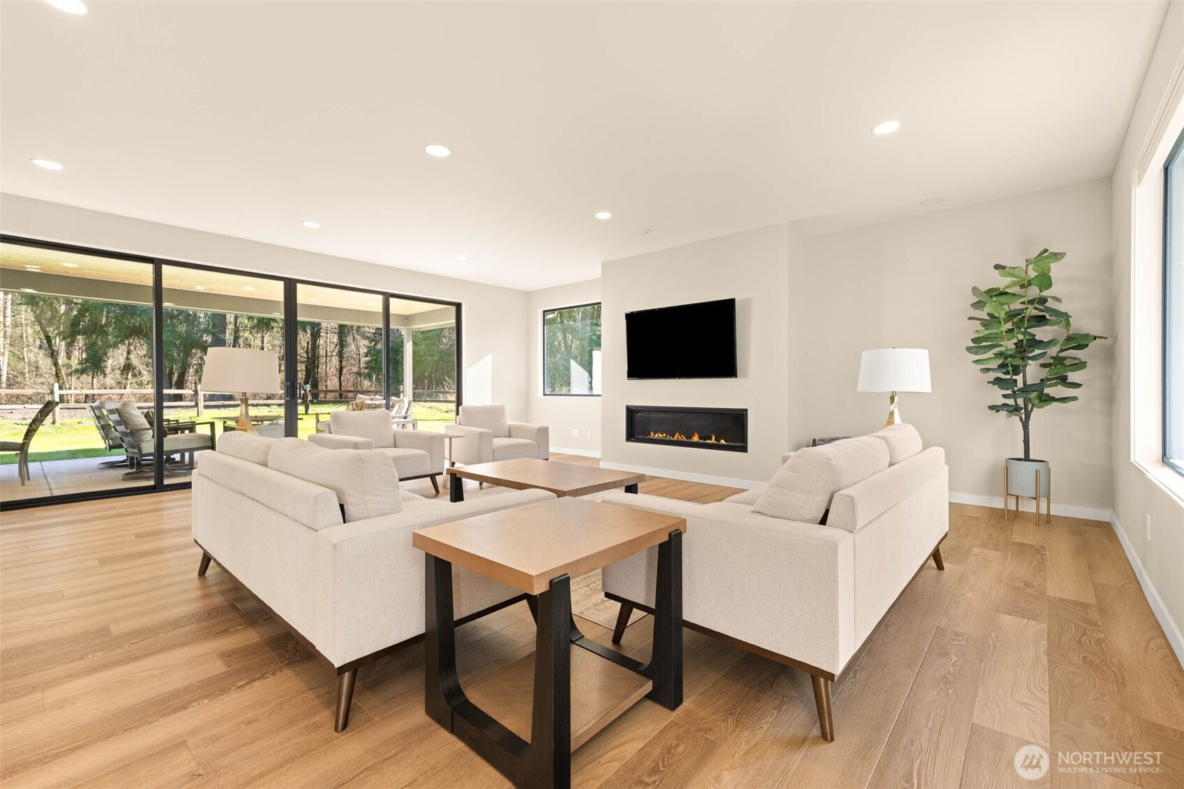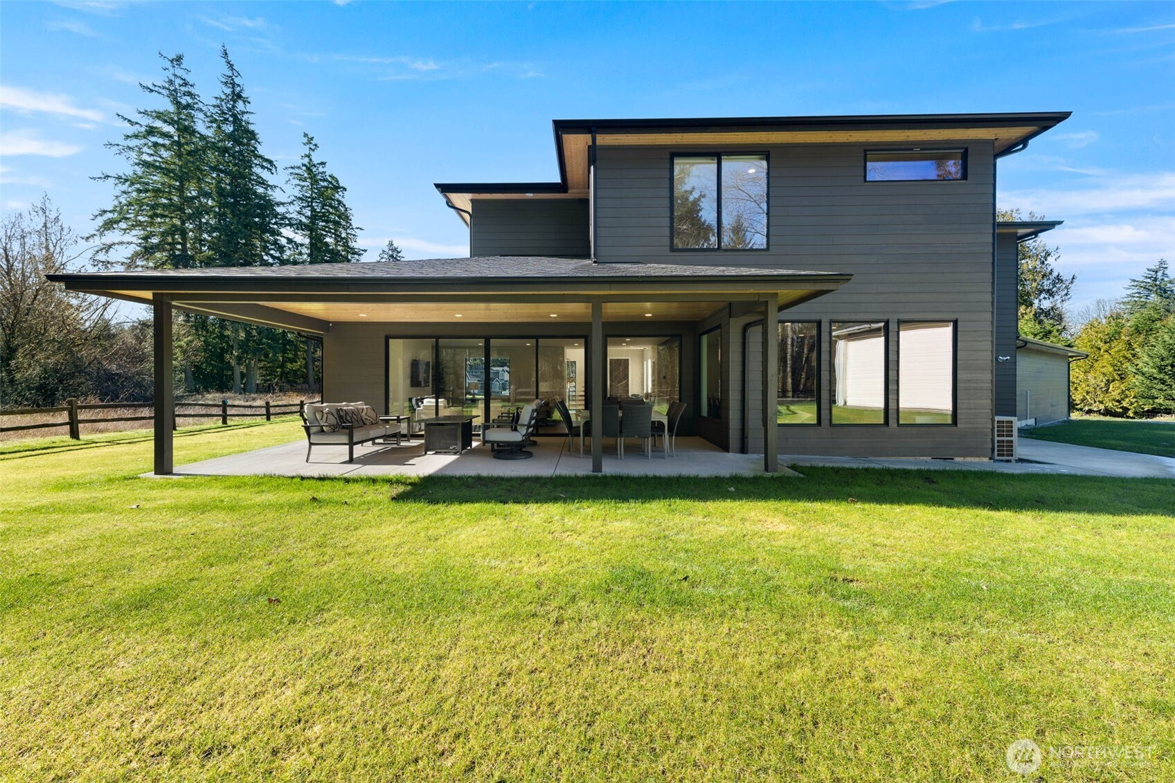 Exceptional Northwest contemporary residence set on 2.5 private, park-like acres, offering modern design, refined finishes, and functional living. Newly built in 2024, the home showcases clean architectural lines, expansive black-framed windows, and wide-plank luxury vinyl flooring throughout, creating a bright interior designed for durability and style. A dramatic two-story entry reveals a floating staircase with custom iron railing and elevated ceilings enhancing the sense of scale. The open-concept great room features a sleek linear fireplace and access to a covered outdoor living area, ideal for year-round entertaining and indoor-outdoor flow. An oversized separate family or media room on the main level provides expansive space for movie nights, game days, or entertaining. The designer kitchen features quartz waterfall countertops, custom cabinetry, an oversized island with seating, professional-grade stainless appliances, statement hood, and brass fixtures. Spa-inspired bathrooms reflect the home’s contemporary style with coordinated finishes and warm wood tones, and abundant storage enhances everyday livability. The exterior offers modern rooflines, a spacious three-car garage, and a detached 1,080 sq ft shop with ADU-ready potential. The 2.5-acre setting offers privacy and tranquility while conveniently located near amenities and commuter routes. Built with intention and finished to an exceptional standard, this is a rare opportunity for refined acreage living.