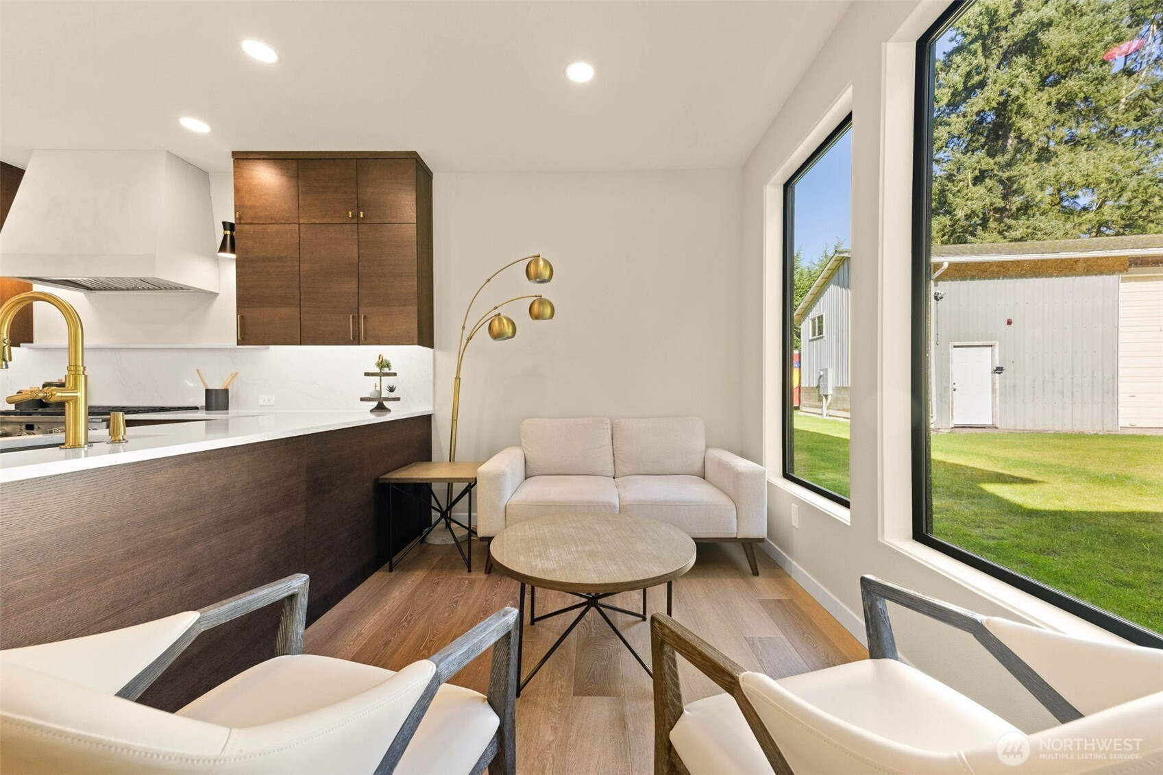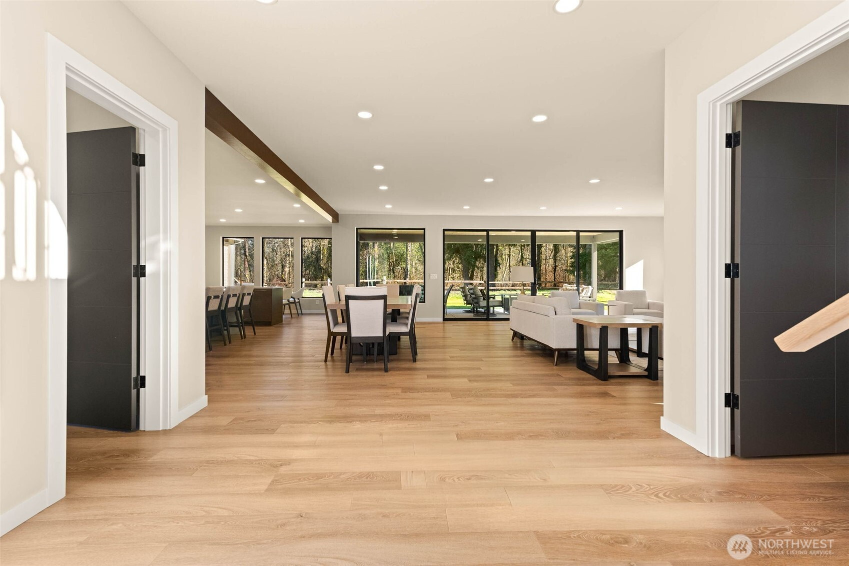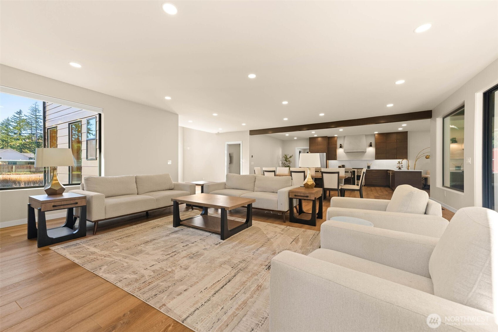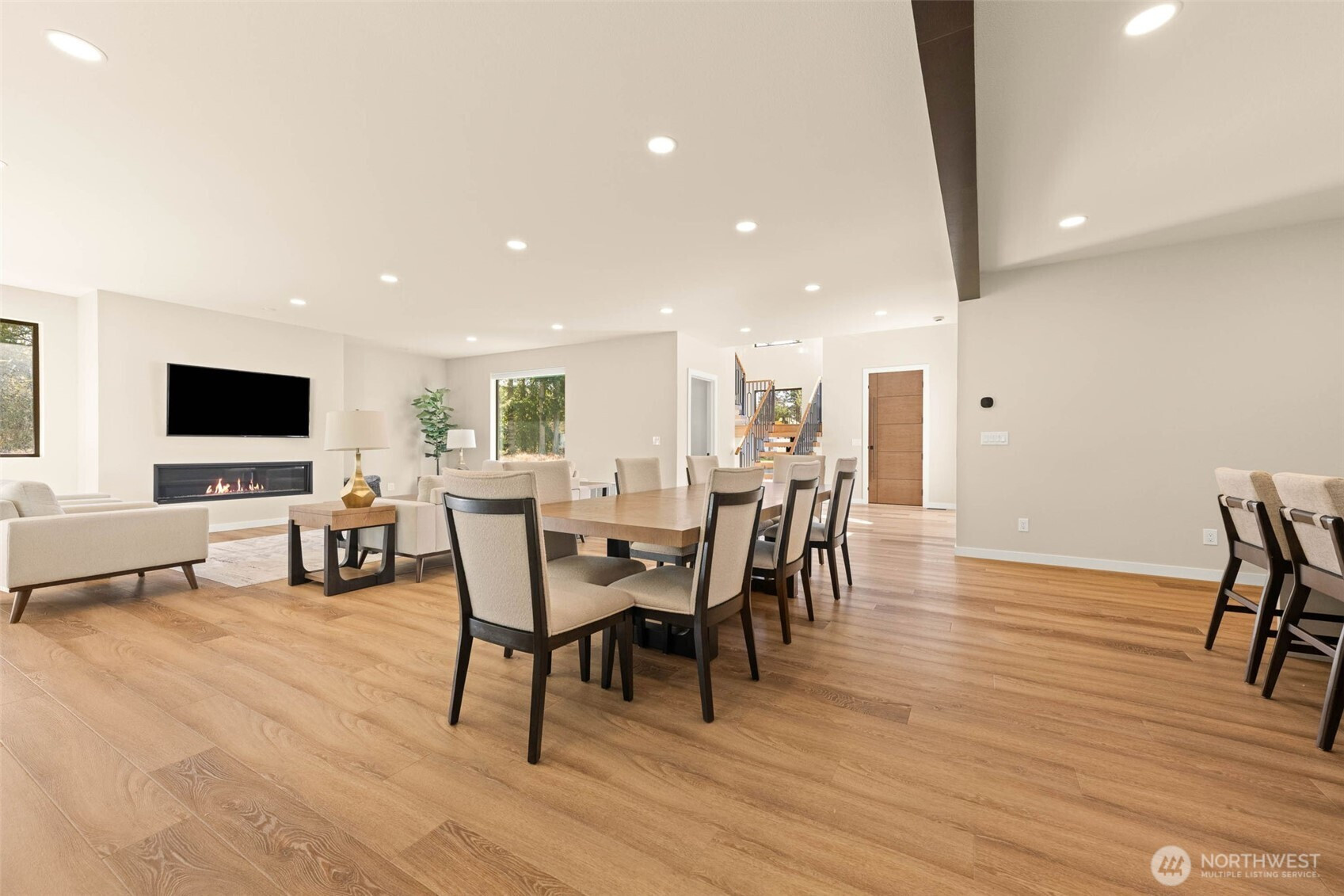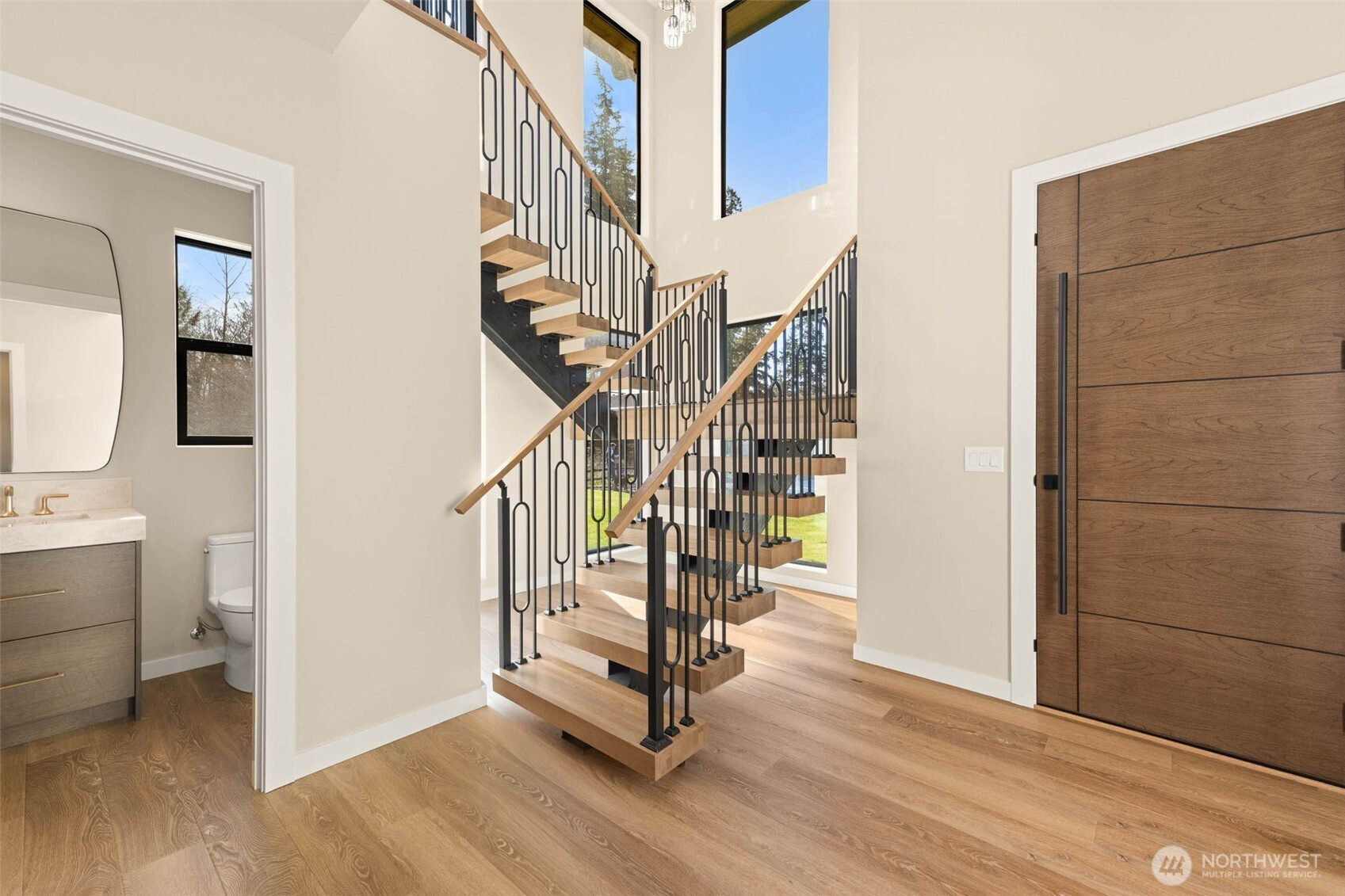 Exceptional Northwest contemporary residence set on 2.5 private, park-like acres, offering modern design, refined finishes, and functional living. Newly built in 2024, the home showcases clean architectural lines, expansive black-framed windows, and wide-plank luxury vinyl flooring throughout, creating a bright interior designed for durability and style. A dramatic two-story entry reveals a floating staircase with custom iron railing and elevated ceilings enhancing the sense of scale. The open-concept great room features a sleek linear fireplace and access to a covered outdoor living area, ideal for year-round entertaining and indoor-outdoor flow. An oversized separate family or media room on the main level provides expansive space for movie nights, game days, or entertaining. The designer kitchen features quartz waterfall countertops, custom cabinetry, an oversized island with seating, professional-grade stainless appliances, statement hood, and brass fixtures. Spa-inspired bathrooms reflect the home’s contemporary style with coordinated finishes and warm wood tones, and abundant storage enhances everyday livability. The exterior offers modern rooflines, a spacious three-car garage, and a detached 1,080 sq ft shop with ADU-ready potential. The 2.5-acre setting offers privacy and tranquility while conveniently located near amenities and commuter routes. Built with intention and finished to an exceptional standard, this is a rare opportunity for refined acreage living.