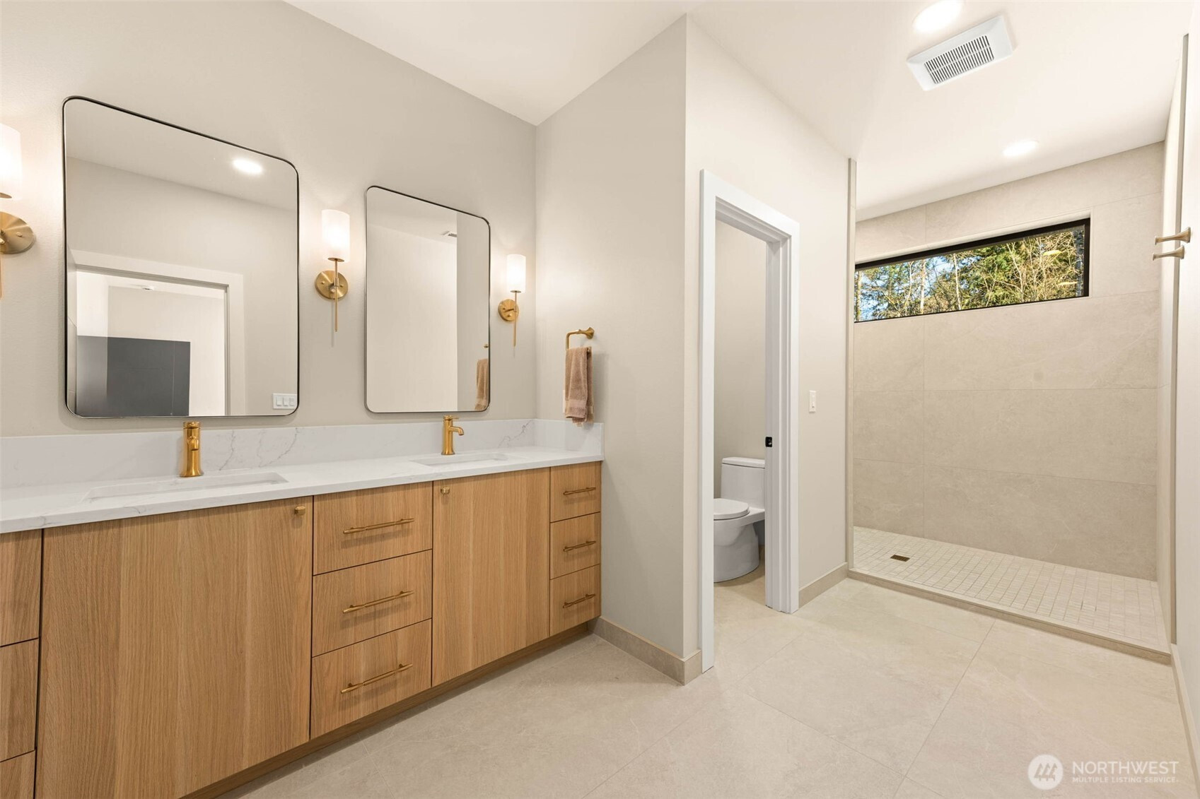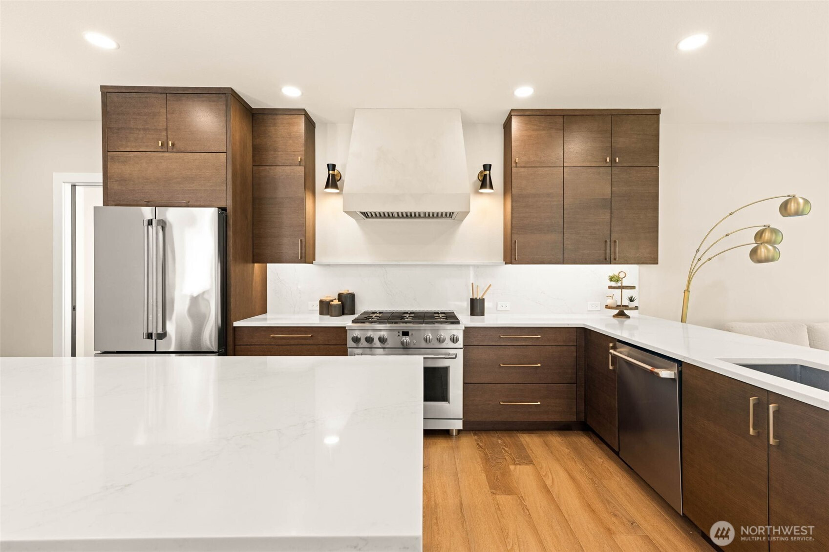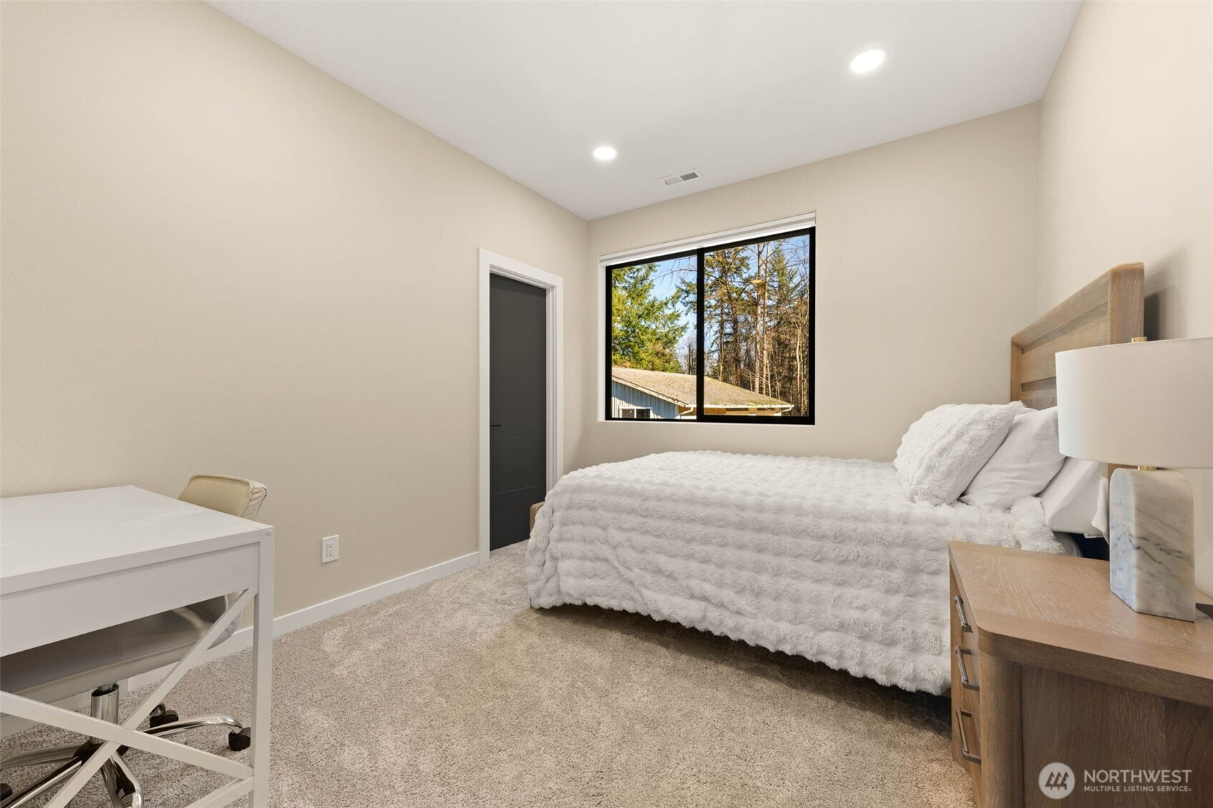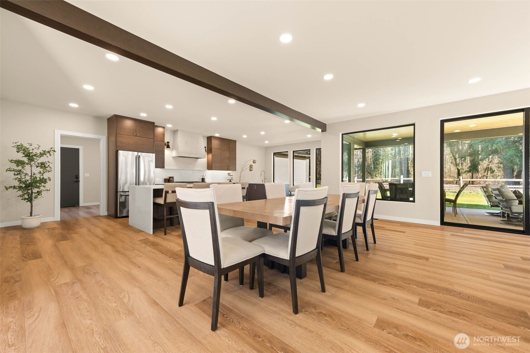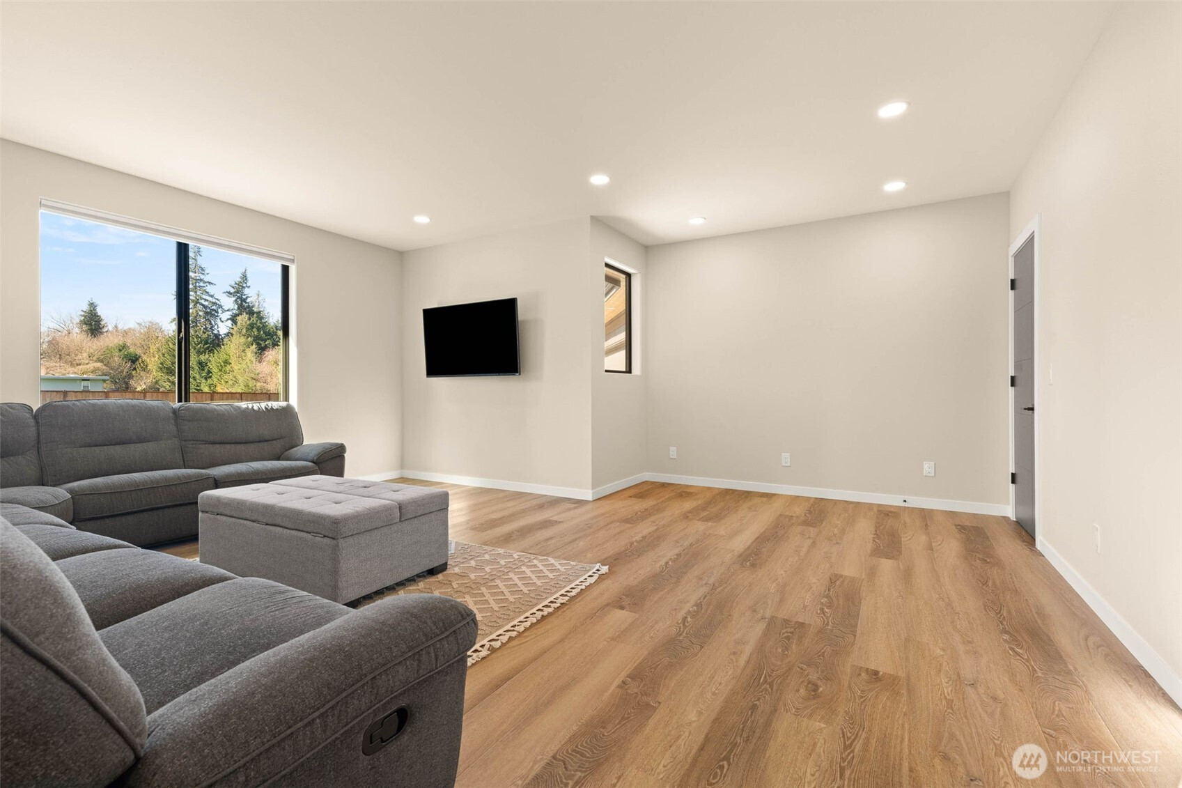 Exceptional Northwest contemporary residence set on 2.5 private, park-like acres, offering modern design, refined finishes, and functional living. Newly built in 2024, the home showcases clean architectural lines, expansive black-framed windows, and wide-plank luxury vinyl flooring throughout, creating a bright interior designed for durability and style. A dramatic two-story entry reveals a floating staircase with custom iron railing and elevated ceilings enhancing the sense of scale. The open-concept great room features a sleek linear fireplace and access to a covered outdoor living area, ideal for year-round entertaining and indoor-outdoor flow. An oversized separate family or media room on the main level provides expansive space for movie nights, game days, or entertaining. The designer kitchen features quartz waterfall countertops, custom cabinetry, an oversized island with seating, professional-grade stainless appliances, statement hood, and brass fixtures. Spa-inspired bathrooms reflect the home’s contemporary style with coordinated finishes and warm wood tones, and abundant storage enhances everyday livability. The exterior offers modern rooflines, a spacious three-car garage, and a detached 1,080 sq ft shop with ADU-ready potential. The 2.5-acre setting offers privacy and tranquility while conveniently located near amenities and commuter routes. Built with intention and finished to an exceptional standard, this is a rare opportunity for refined acreage living.