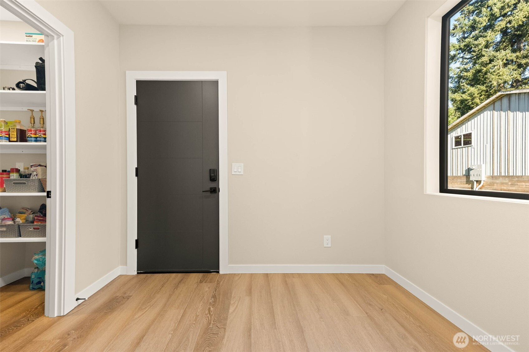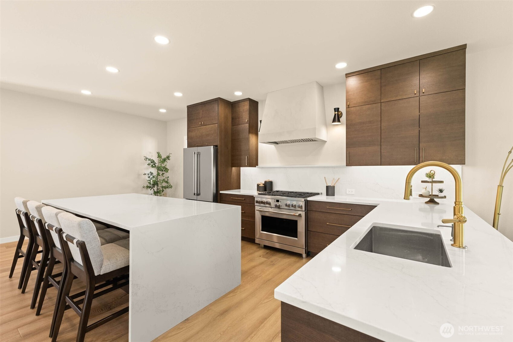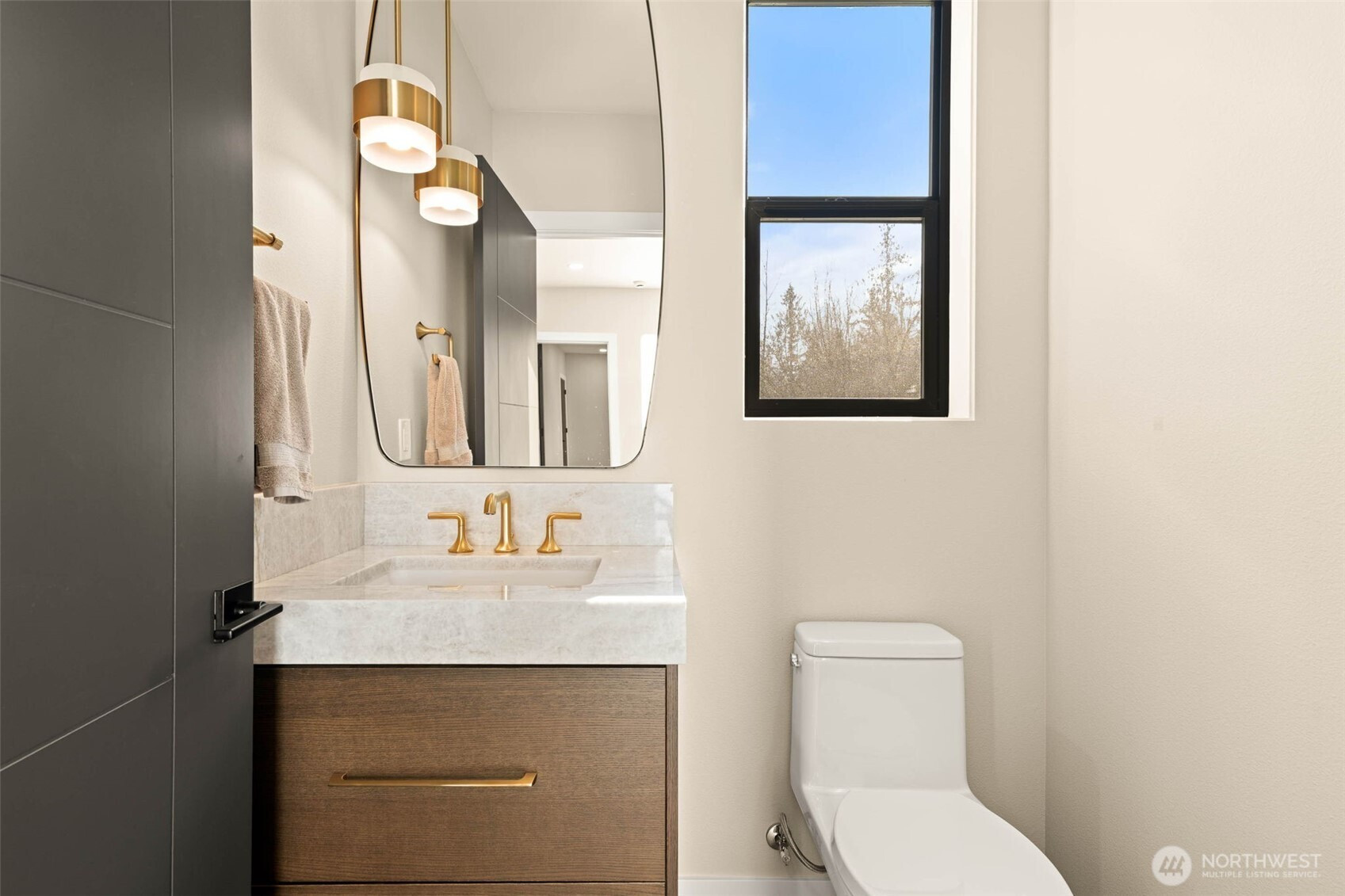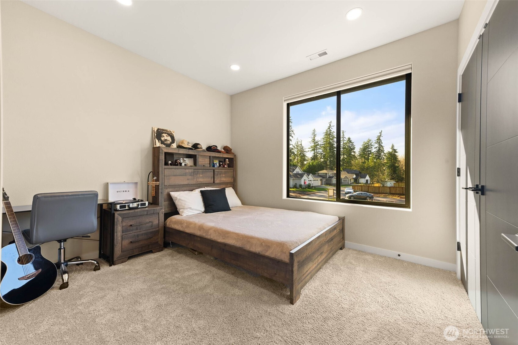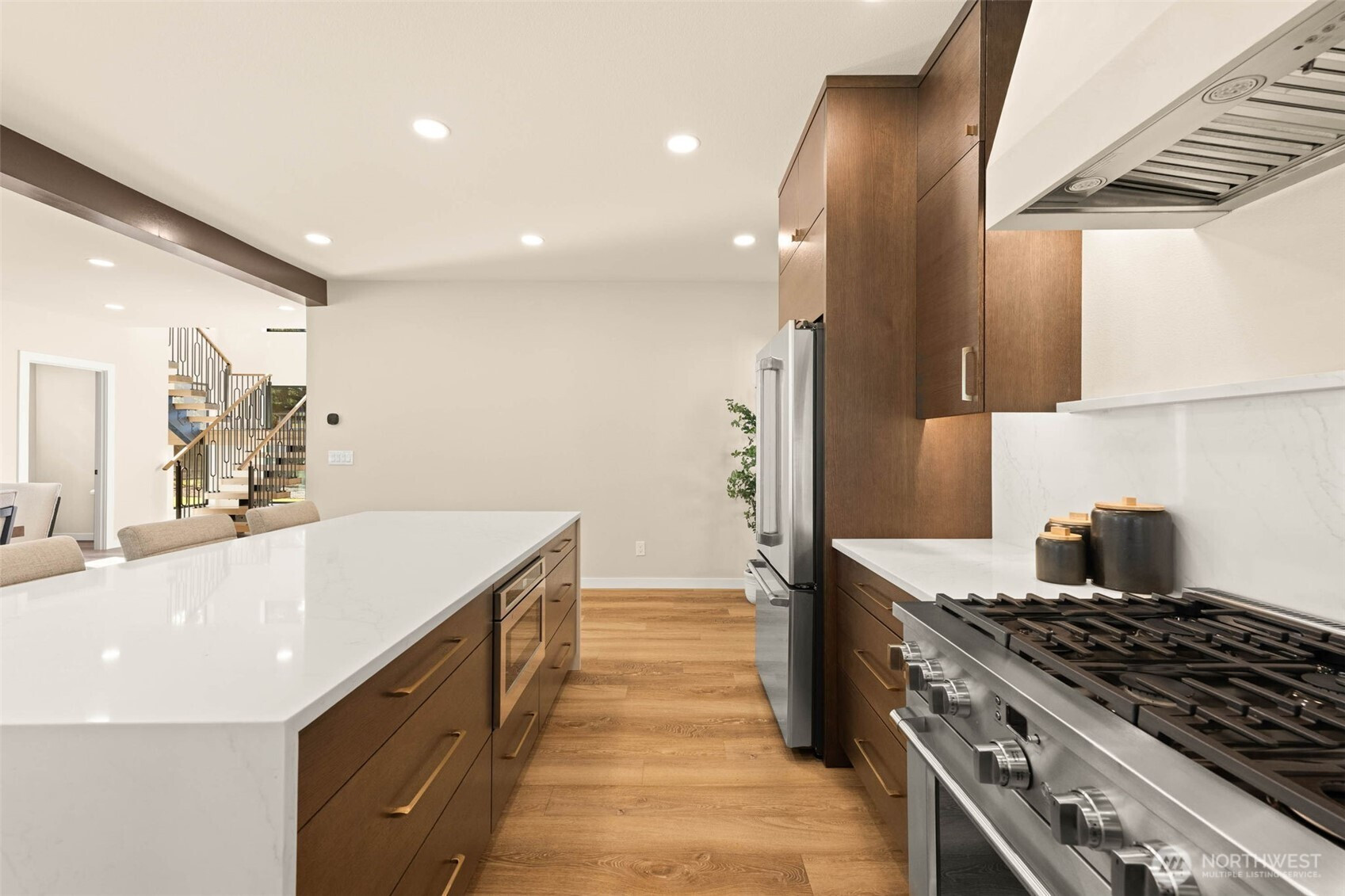 Exceptional Northwest contemporary residence set on 2.5 private, park-like acres, offering modern design, refined finishes, and functional living. Newly built in 2024, the home showcases clean architectural lines, expansive black-framed windows, and wide-plank luxury vinyl flooring throughout, creating a bright interior designed for durability and style. A dramatic two-story entry reveals a floating staircase with custom iron railing and elevated ceilings enhancing the sense of scale. The open-concept great room features a sleek linear fireplace and access to a covered outdoor living area, ideal for year-round entertaining and indoor-outdoor flow. An oversized separate family or media room on the main level provides expansive space for movie nights, game days, or entertaining. The designer kitchen features quartz waterfall countertops, custom cabinetry, an oversized island with seating, professional-grade stainless appliances, statement hood, and brass fixtures. Spa-inspired bathrooms reflect the home’s contemporary style with coordinated finishes and warm wood tones, and abundant storage enhances everyday livability. The exterior offers modern rooflines, a spacious three-car garage, and a detached 1,080 sq ft shop with ADU-ready potential. The 2.5-acre setting offers privacy and tranquility while conveniently located near amenities and commuter routes. Built with intention and finished to an exceptional standard, this is a rare opportunity for refined acreage living.