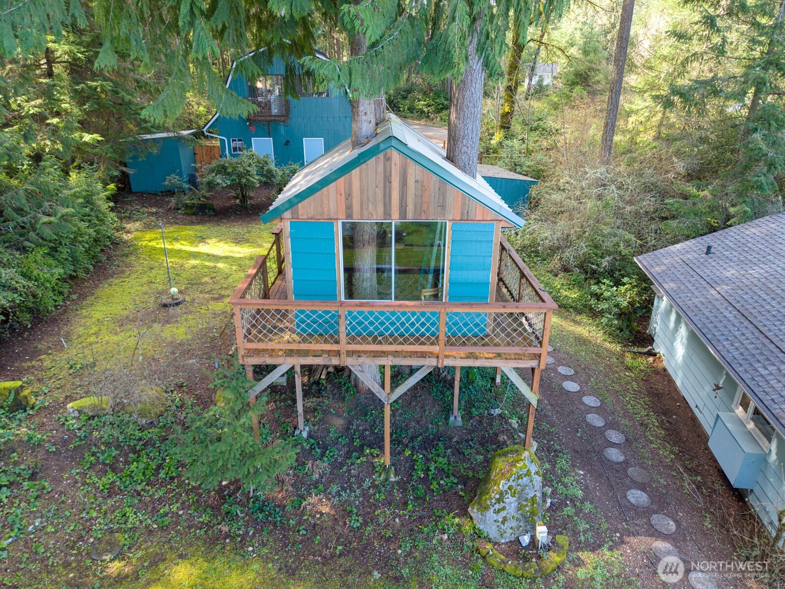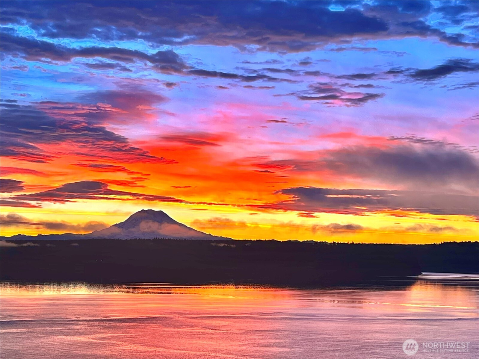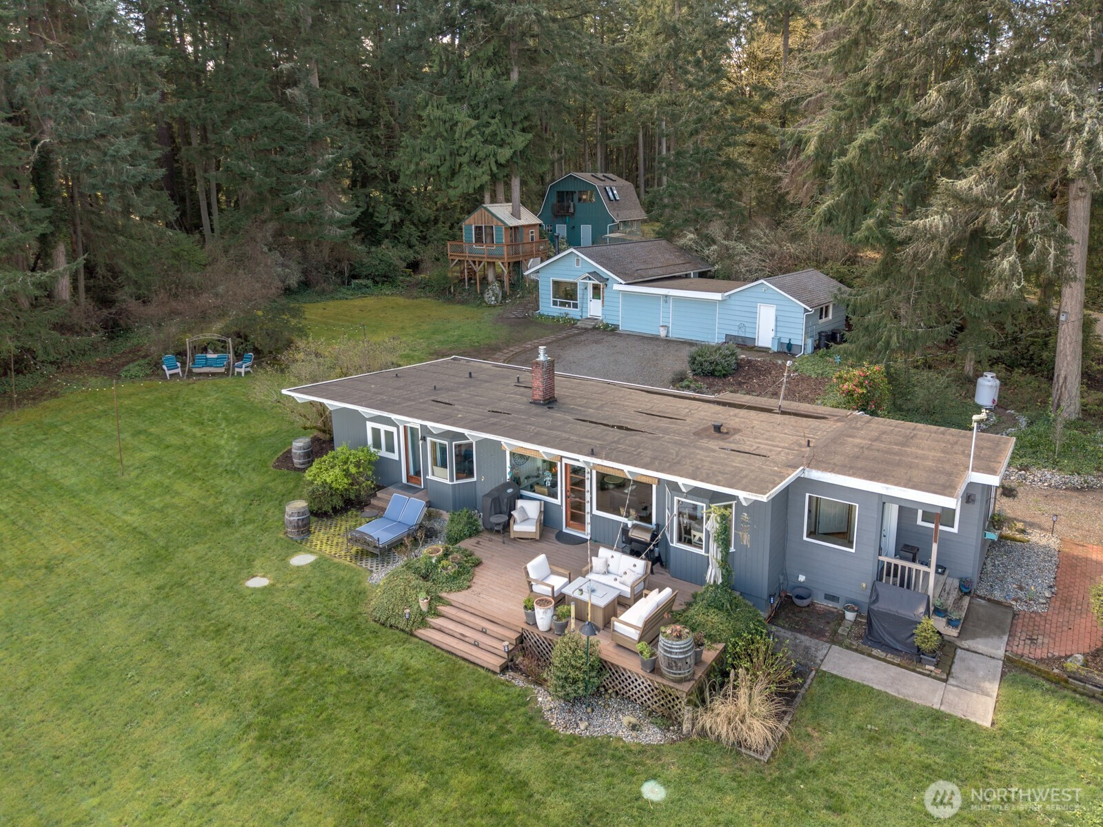 Unobstructed views of Mount Rainier over Puget Sound with stunning sunrises—set on private acreage offering seclusion—surrounded by nature rather than neighboring homes. Just a short walk to the ferry. The main home features hardwood floors, shiplap walls, and beamed ceilings. The living room features a fireplace and connects to the dining area - and opens to the view deck. The primary suite hosts two walk-in closets and en-suite bath with soaking tub and separate shower. The barn features a finished loft with kitchenette and Juliet-style balcony—an inspiring, private space with beautiful views, ideal for a studio, office, or creative retreat—along with a partial bath and two horse stalls. The detached guest home features an open living space with wood stove, kitchen, and full bath—well-suited for guests or potential vacation rental use. A charming, rustic treehouse adds a whimsical touch.