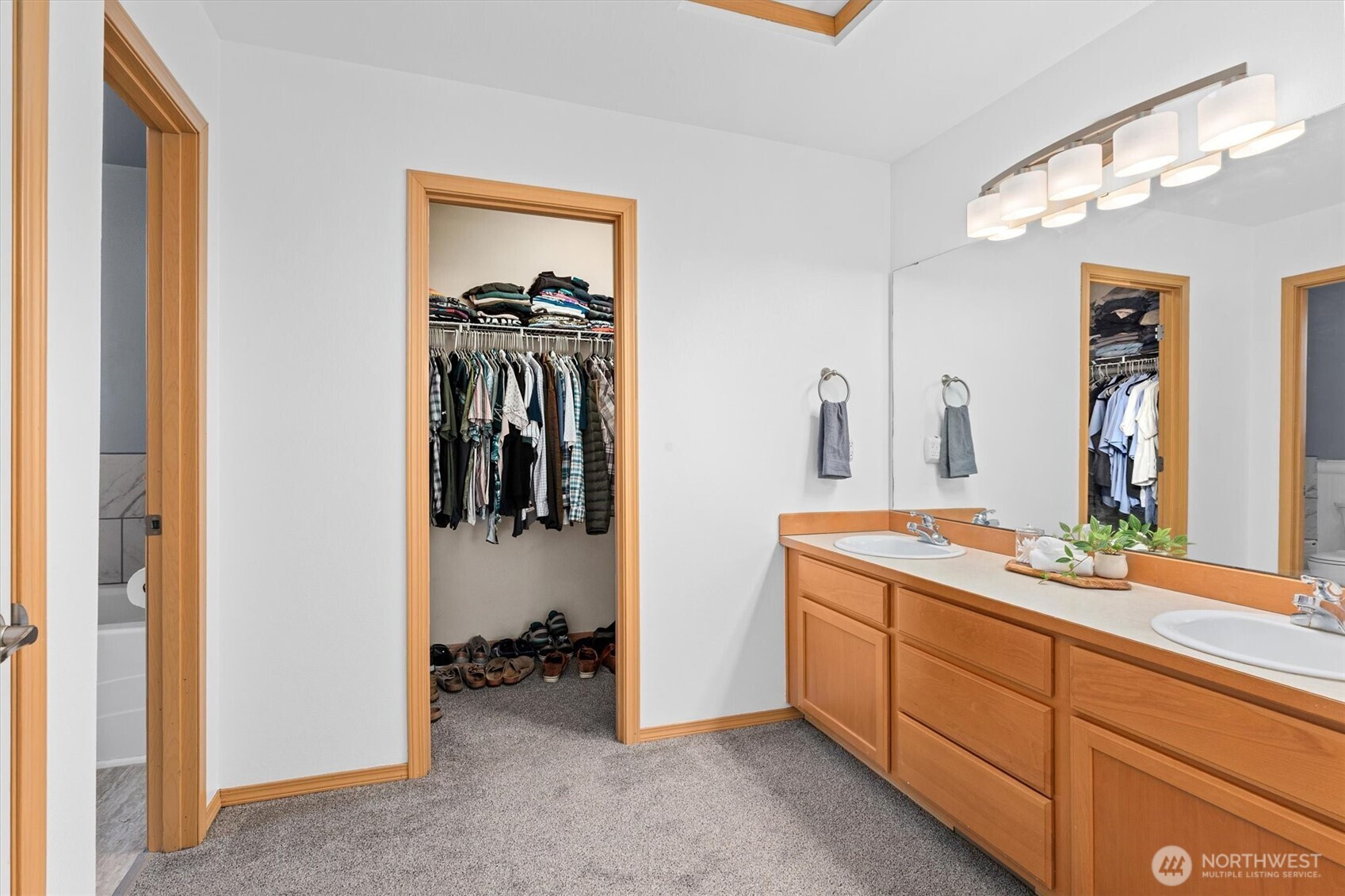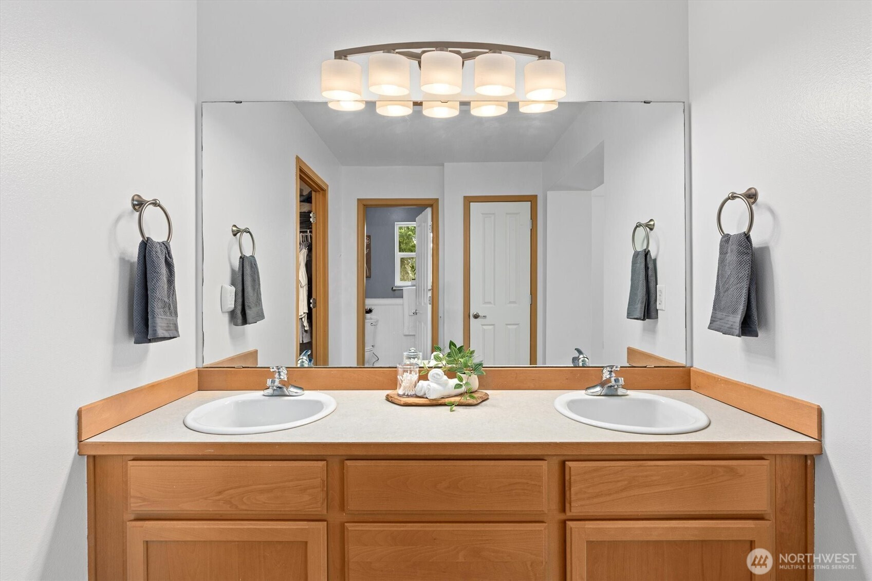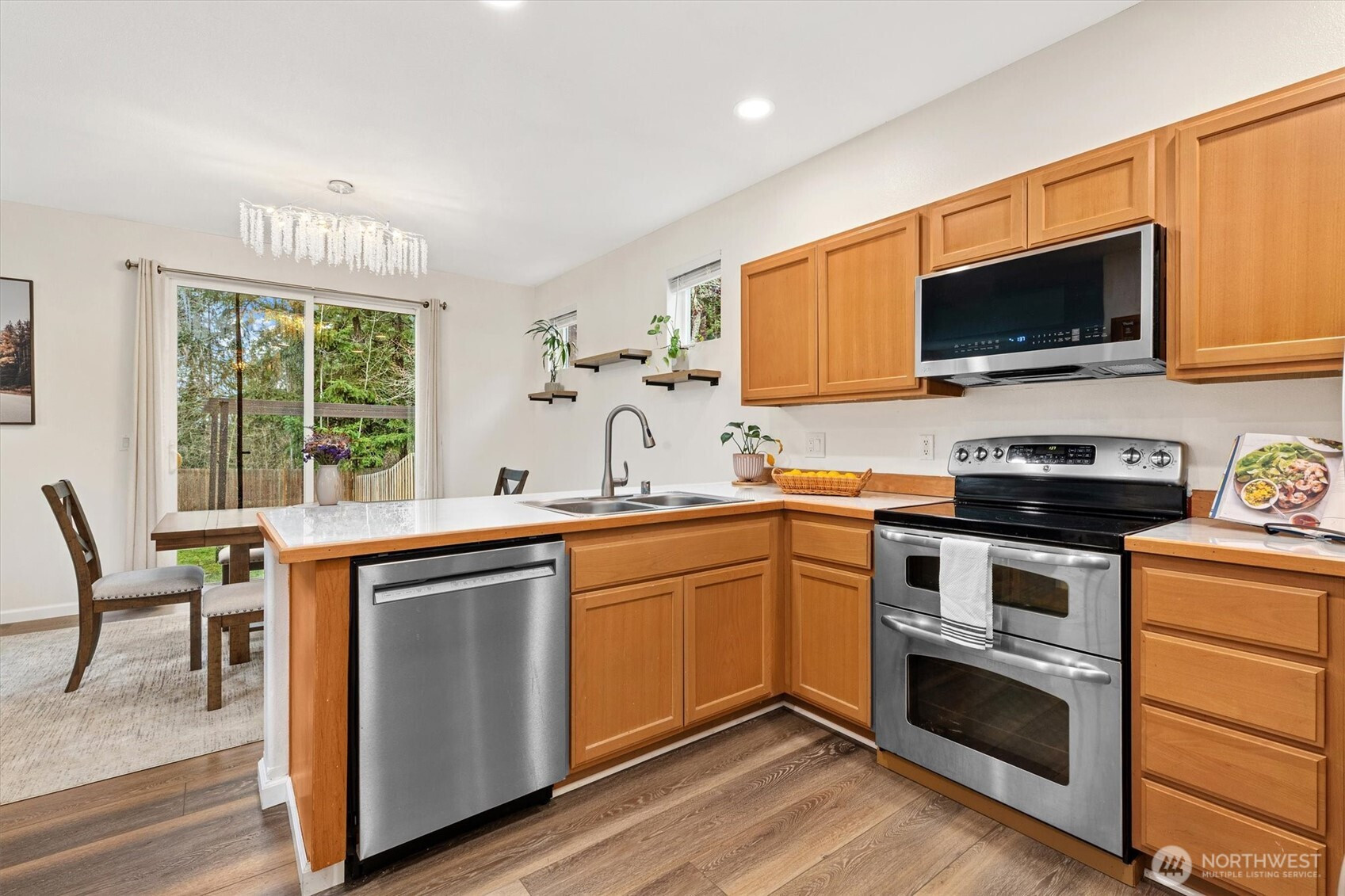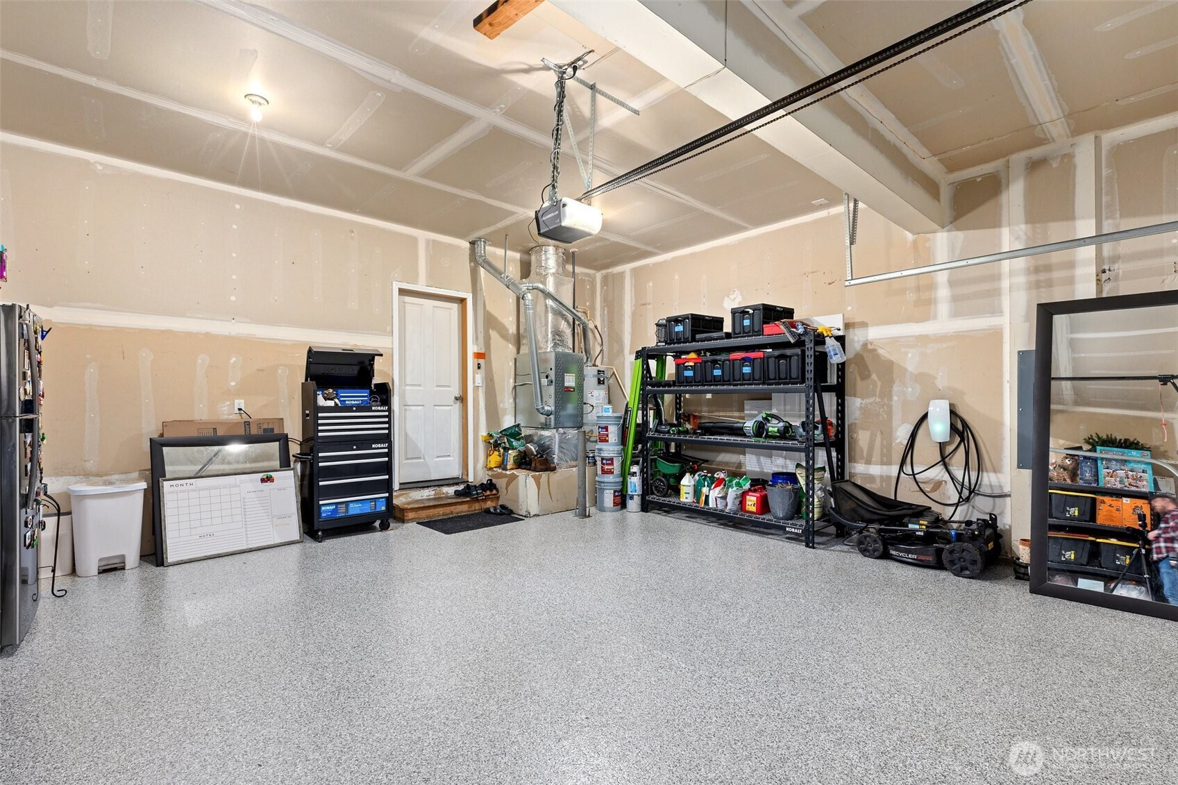Welcome to Sterling Ridge at Silver Creek, where privacy and thoughtful updates shine in this beautifully maintained 3-bedroom, 2.5-bath home backing to a peaceful lush greenbelt. The open-concept layout seamlessly connects the kitchen, dining, and living areas, creating an inviting space for everyday living and entertaining. New durable vinyl plank flooring spans the main level, offering modern style and easy maintenance. An abundance of windows fill the home with natural light and showcase the tranquil wooded backdrop. The kitchen features new stainless steel appliances, double oven, generous counter space, and a spacious pantry designed for both function and style. Upstairs, the oversized primary suite offers a relaxing retreat with ample closet space and a well-appointed en suite bath complete with a soaking tub. Two additional bedrooms provide flexibility for guests or household needs and the versatile den makes an ideal reading nook or home office. A finished two-car garage with brand-new epoxy flooring, newer 2024 furnace, tesla charger and shelving adds convenience, while the expansive backyard offers room to garden, play, or unwind in a private setting. Located near parks, Puyallup schools, shopping, and commuter routes. This home blends comfort, functionality, and peaceful surroundings in one exceptional package.
