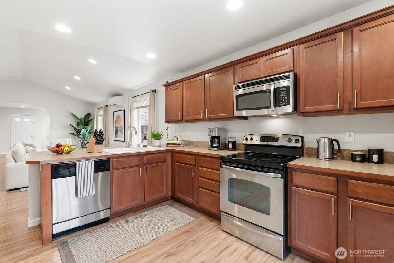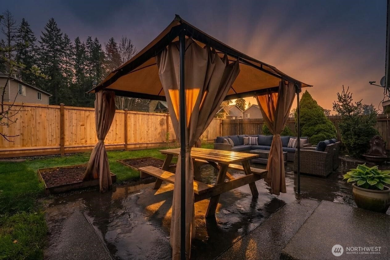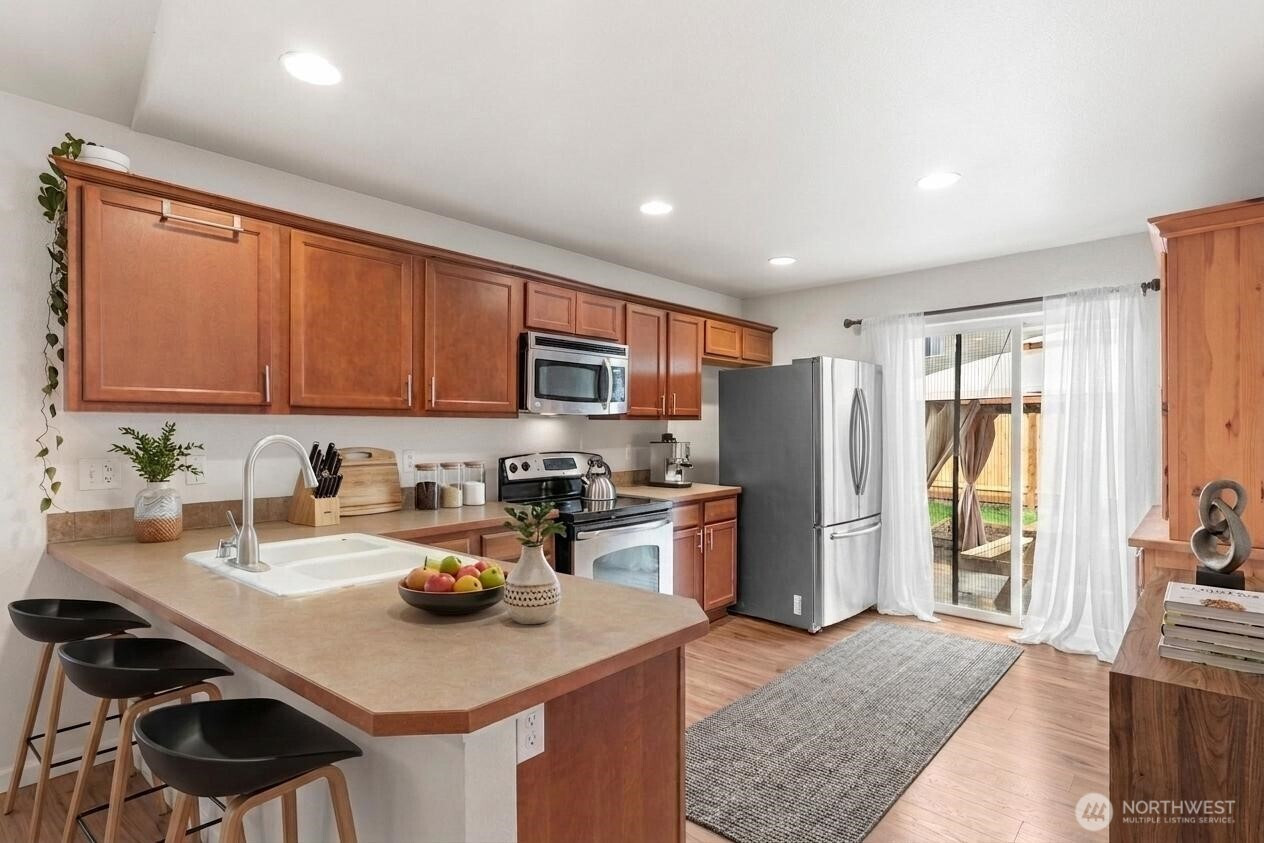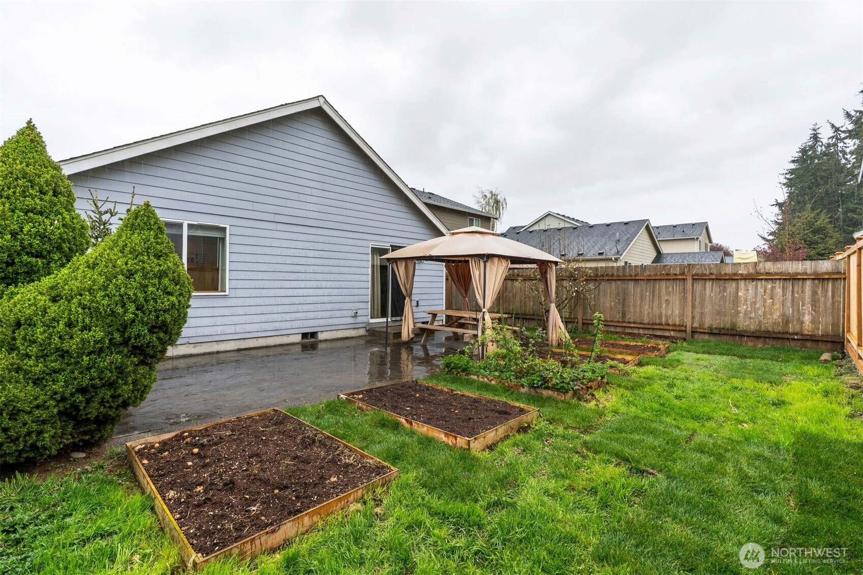 Single-level home in Graham offering 3 bedrooms, 2 bathrooms, and approximately 1,276 sq ft of living space. Built in 2009, this rambler home features a functional layout with open living and dining areas designed for efficient everyday use. Interior updates include new paint and new flooring (2026). Kitchen offers ample cabinetry and workspace with adjacent dining area for easy flow.Primary bedroom includes attached bath and 2 additional bedrooms provide flexibility for guest rooms, home office, or other uses.Exterior features a fully fenced yard with raised garden beds, situated on approximately 4,500 sq ft lot with driveway and garage parking.Located approximately 0.5 mi to Meridian Ave E, ~1.5–2.0 mi to Graham Town Center, and ~2.0 mi to Frontier Park, with access to Bethel School District schools.