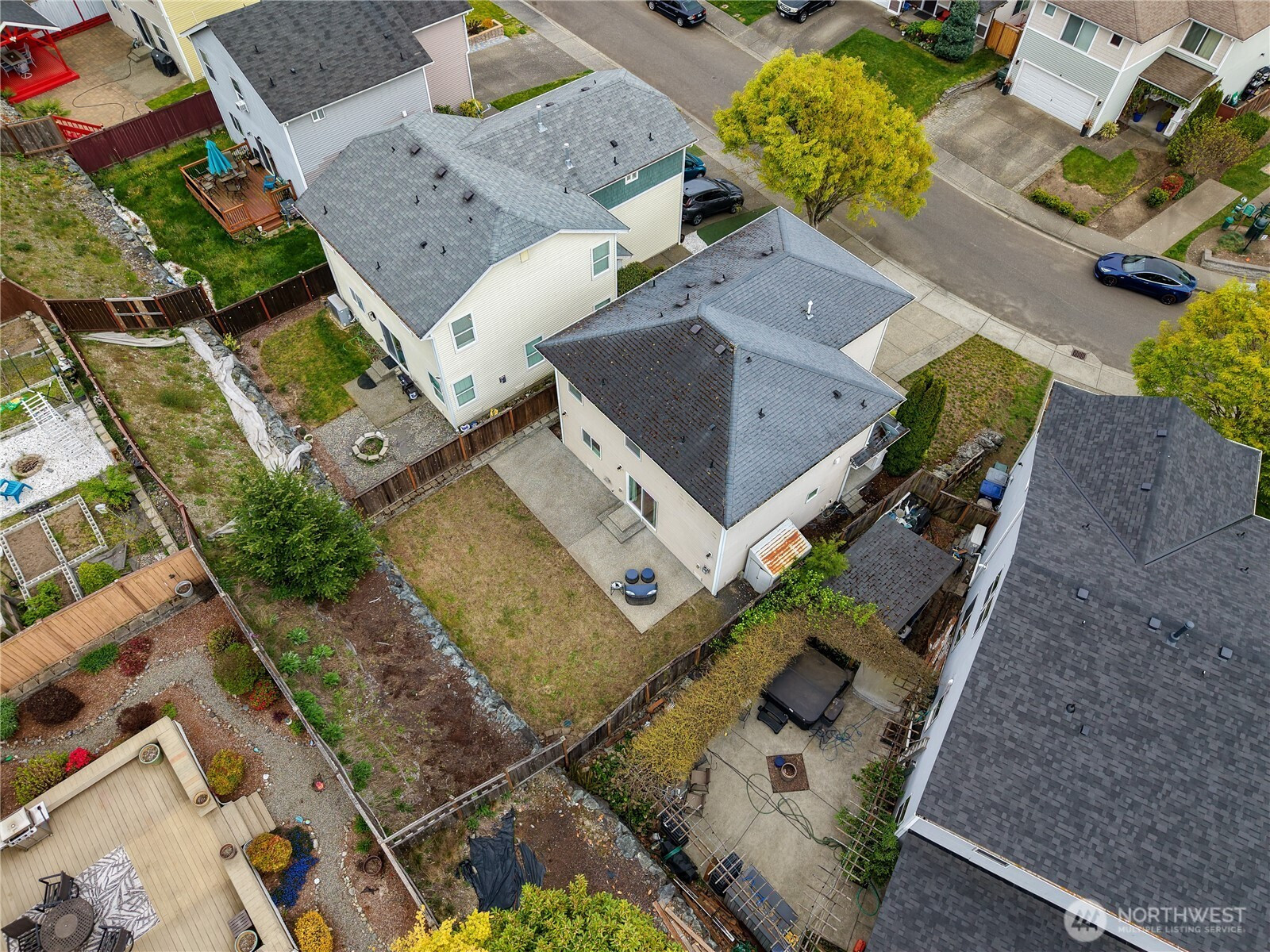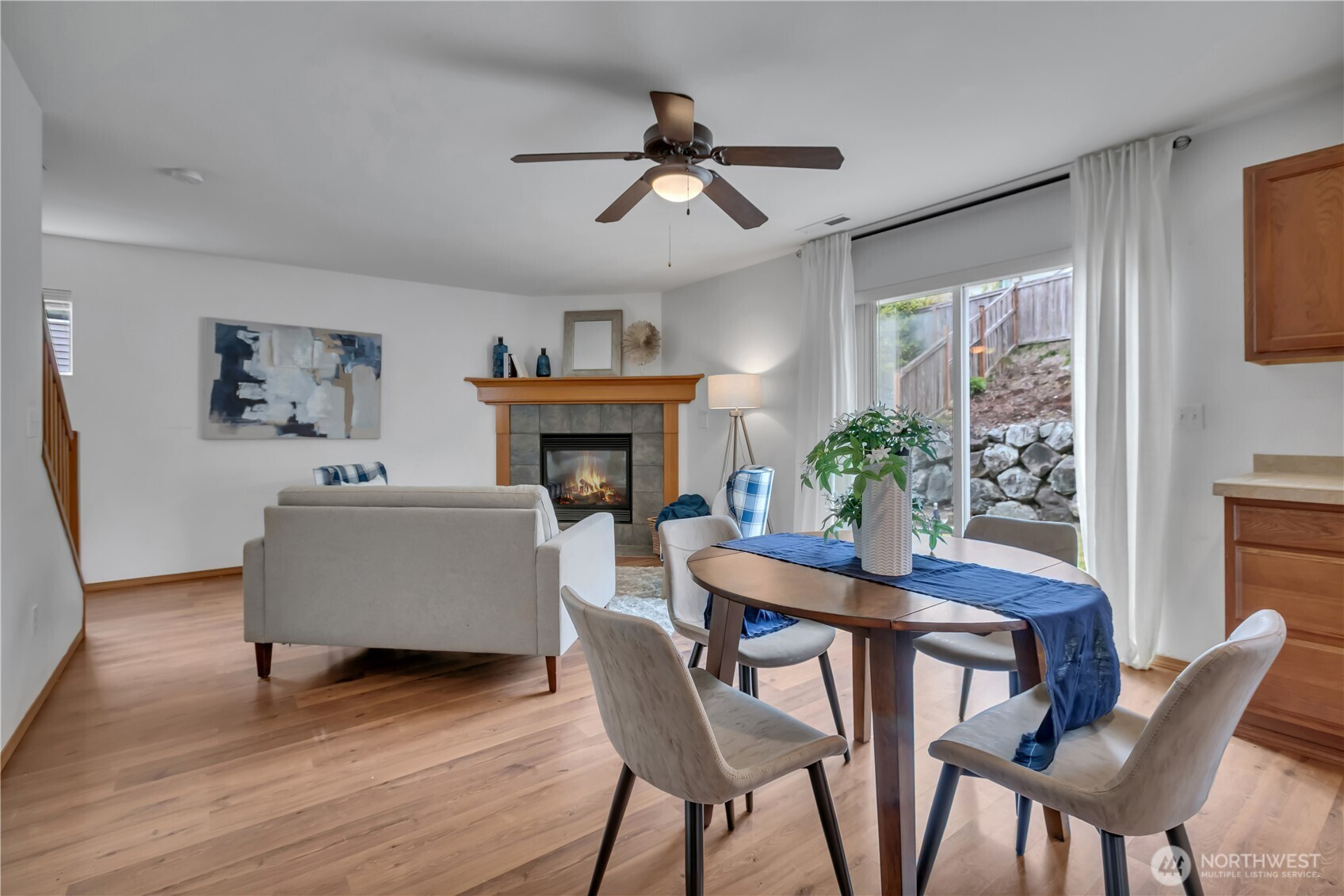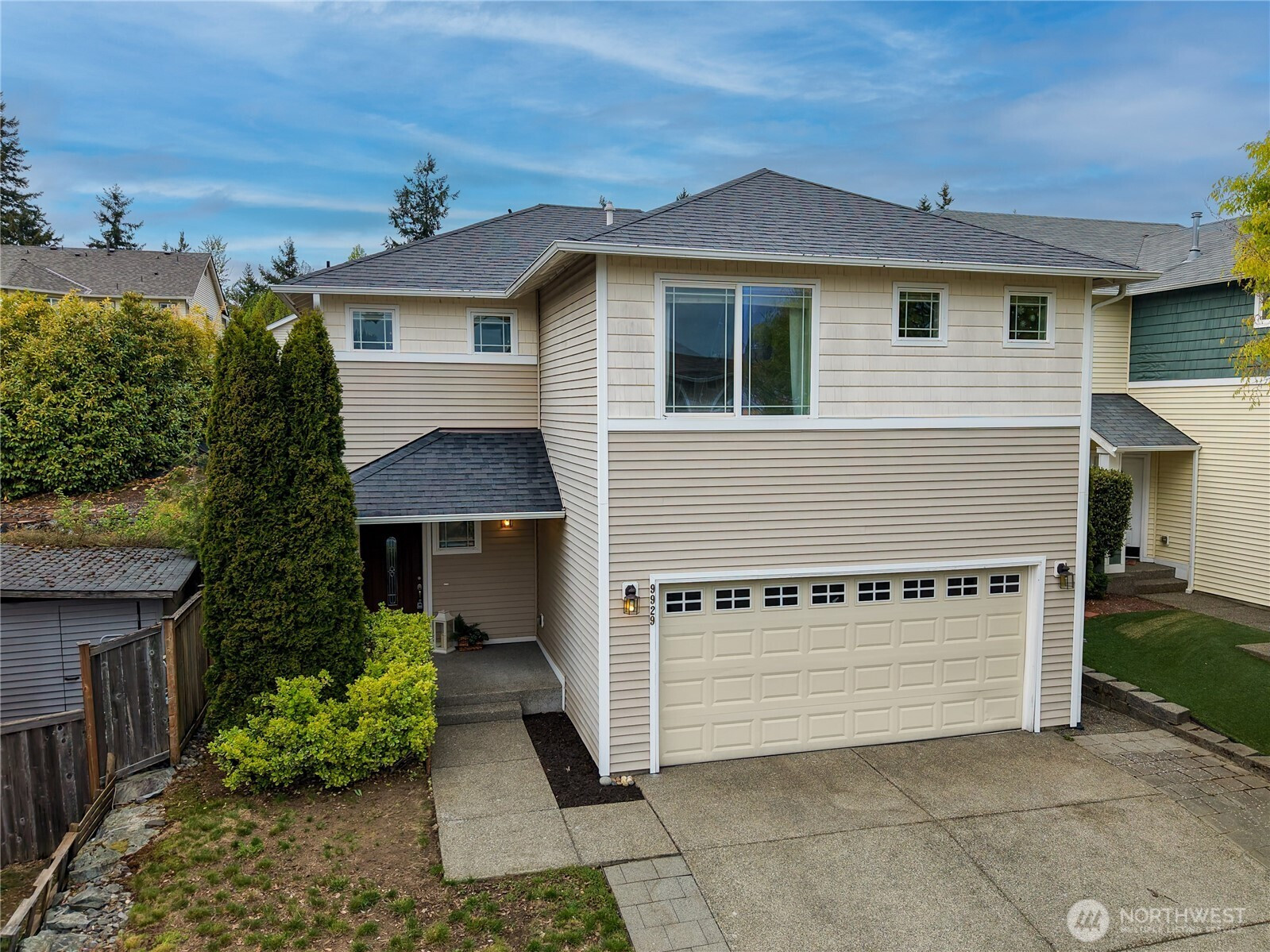 Welcome to this well-maintained two-story Brookside home offering 1,580 sq ft of bright, open living in the award-winning Sumner-Bonney Lake School District. The inviting covered front porch sets the tone for the warm, open concept interior where the living room features a cozy corner gas fireplace, ceiling fan, and a large sliding glass door leading to the backyard. The open L-shaped kitchen is designed for easy everyday living with recessed lighting, a large window overlooking the yard, a walk-in pantry with room for a second refrigerator, double basin stainless steel sink, and a full appliance package including a Maytag double oven electric range, Kenmore refrigerator, and KitchenAid dishwasher. Upstairs, the generous primary suite boasts bright windows, a ceiling fan, oversized walk-in closet, soaking tub, and a large vanity with ample counterspace. Two additional bedrooms and a conveniently located upstairs laundry round out the upper level. The tiered, fenced backyard offers added privacy, an expansive patio perfect for summer entertaining, and a utility shed for garden tools/storage. Additional highlights include a tankless gas water heater, high-efficiency gas furnace, and a 2-car attached garage. The low HOA covers two community parks, athletic courts, playgrounds, and trails just around the corner. Easy access to shopping, dining, and major commuting highways, and Bonney Lake Park & Ride to Sumner's Sounder Station.