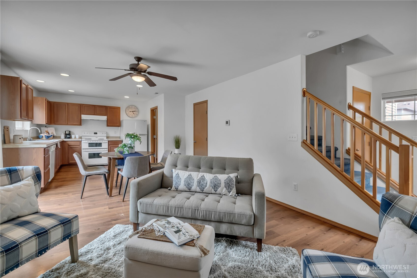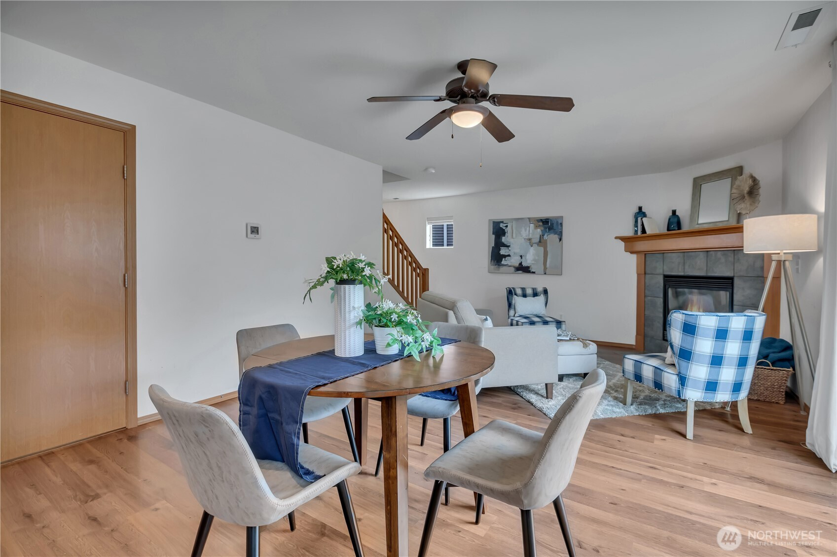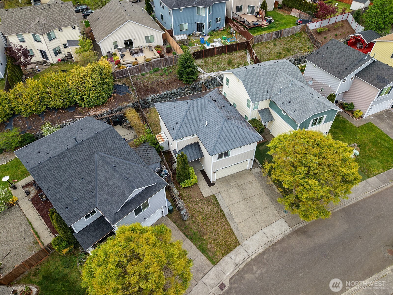 Welcome to this well-maintained two-story Brookside home offering 1,580 sq ft of bright, open living in the award-winning Sumner-Bonney Lake School District. The inviting covered front porch sets the tone for the warm, open concept interior where the living room features a cozy corner gas fireplace, ceiling fan, and a large sliding glass door leading to the backyard. The open L-shaped kitchen is designed for easy everyday living with recessed lighting, a large window overlooking the yard, a walk-in pantry with room for a second refrigerator, double basin stainless steel sink, and a full appliance package including a Maytag double oven electric range, Kenmore refrigerator, and KitchenAid dishwasher. Upstairs, the generous primary suite boasts bright windows, a ceiling fan, oversized walk-in closet, soaking tub, and a large vanity with ample counterspace. Two additional bedrooms and a conveniently located upstairs laundry round out the upper level. The tiered, fenced backyard offers added privacy, an expansive patio perfect for summer entertaining, and a utility shed for garden tools/storage. Additional highlights include a tankless gas water heater, high-efficiency gas furnace, and a 2-car attached garage. The low HOA covers two community parks, athletic courts, playgrounds, and trails just around the corner. Easy access to shopping, dining, and major commuting highways, and Bonney Lake Park & Ride to Sumner's Sounder Station.