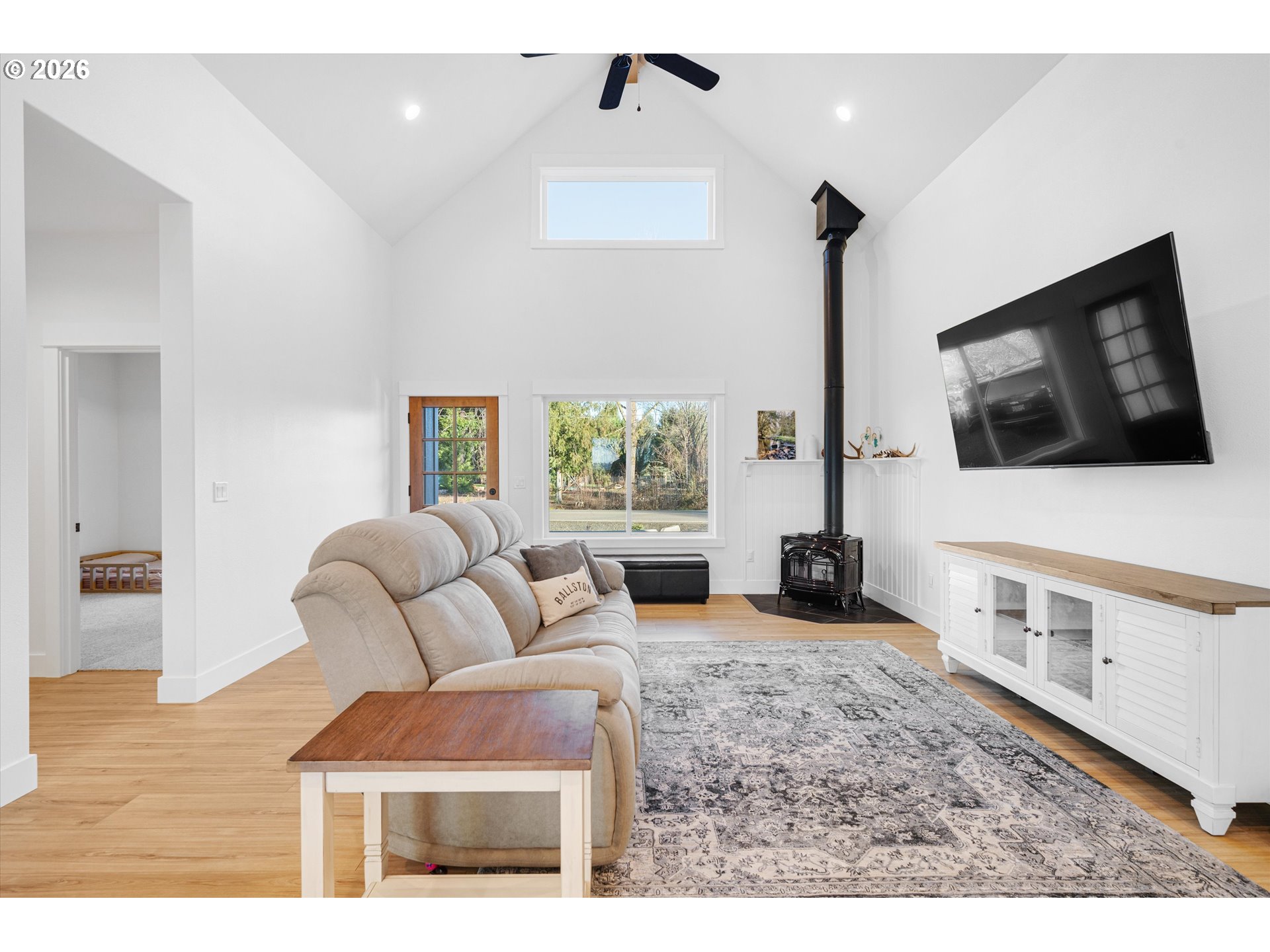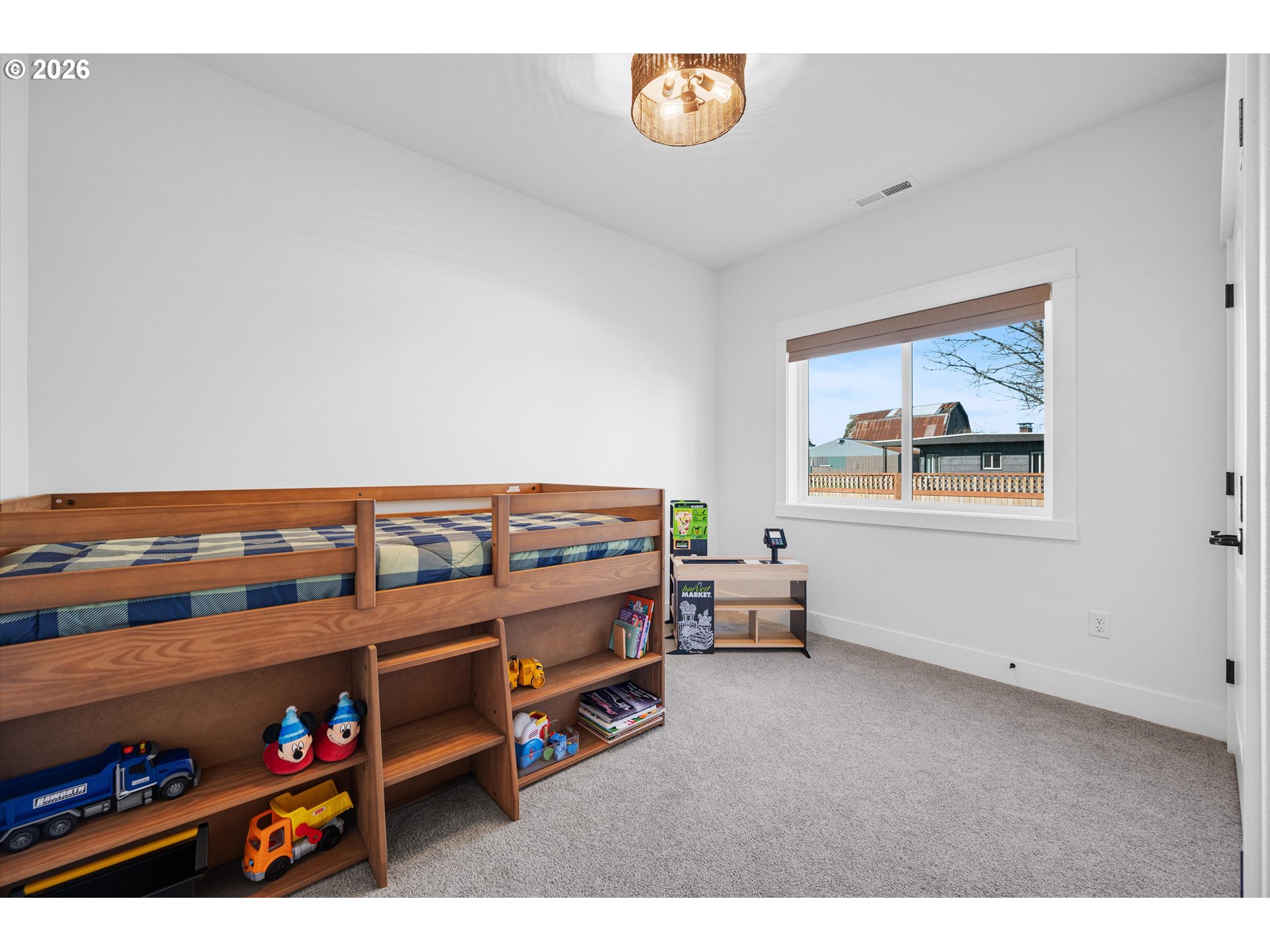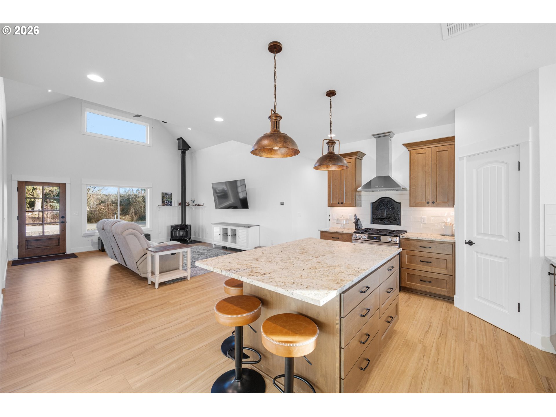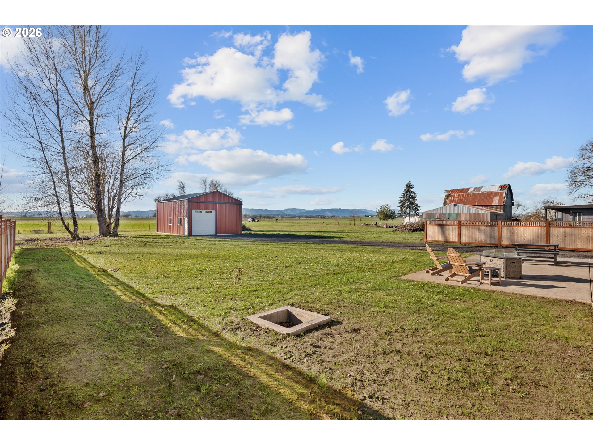 Nestled on a peaceful half-acre with beautiful valley views, this nearly new, single-level home blends easy country living with modern comfort and style. Vaulted ceilings and a light-filled great room create a welcoming, open feel, while tasteful, on-trend finishes carry throughout the home. The heart of the home is the stunning kitchen, featuring granite countertops, a generous island for gathering, and a convenient pantry—perfect for both everyday living and entertaining.The spacious primary suite offers a quiet retreat with a well-sized walk-in closet and a beautifully finished bath, complete with dual sinks and a large tiled walk-in shower. Two additional bedrooms are thoughtfully situated on the opposite side of the home, providing privacy and flexibility for guests, office space, or hobbies.Step outside and enjoy the calm of country surroundings without the maintenance of acreage. The large patio space provides an abundance of room for entertaining and a brand-new pole barn offers ideal space for RV storage, a workshop, or creative pursuits. The circular driveway provides for easy access and additional parking. With room to garden, grow, and spread out, this property offers the charm of rural living just minutes to Mac and is located in the Amity School District. Immaculately maintained and well crafted by a renowned builder—this is a special opportunity for comfortable, well-planned country living with modern finishes.