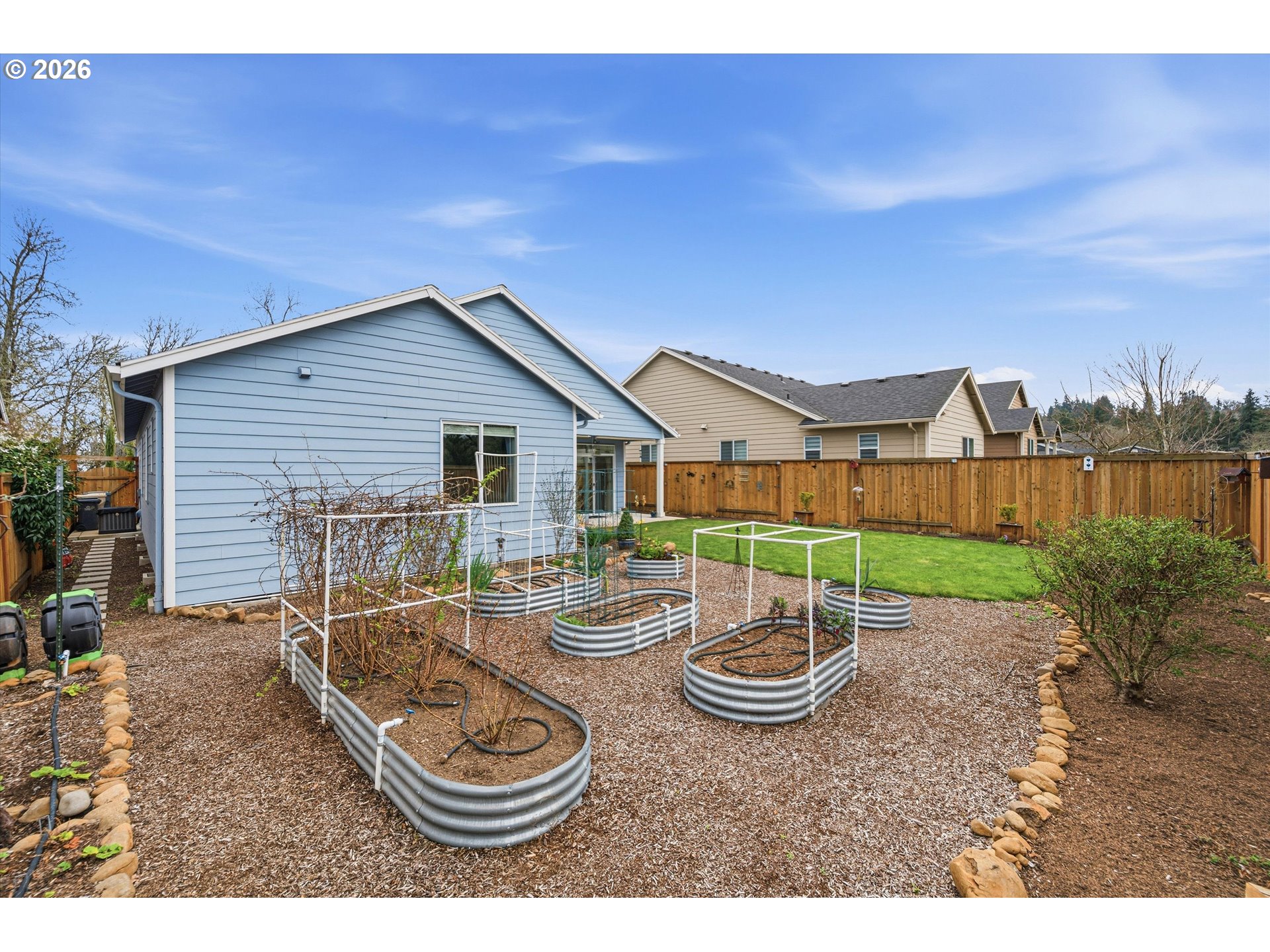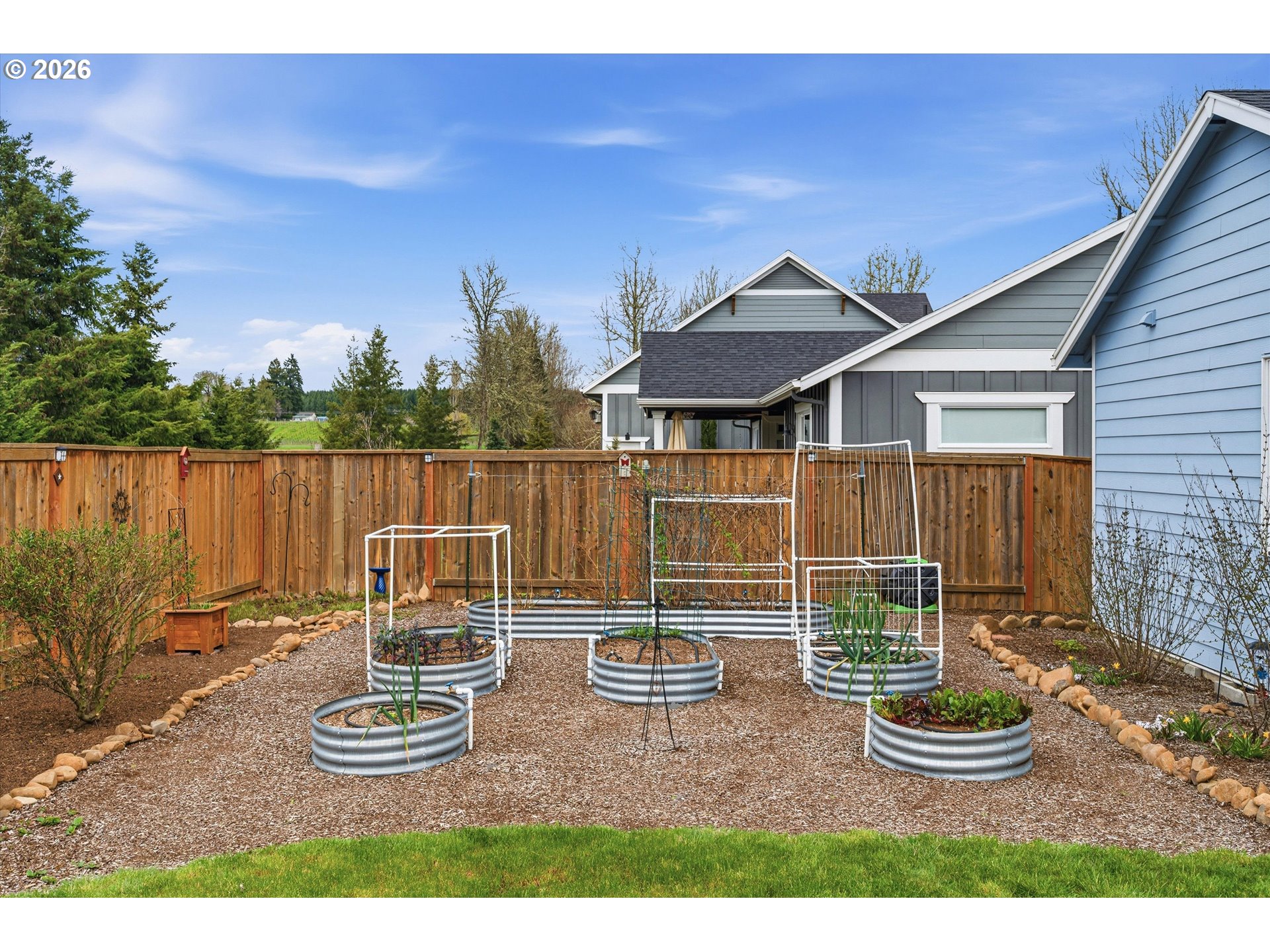 A perfect single story plan! Just the right size with luxury throughout! Gorgeous, well thought out kitchen complete with upscale counters, stainless appliances with an upgraded gas stove, wall pantry & LVP flooring. Vaulted greatroom provides wonderful light and is accented with charming gas fireplace! Lovely primary suite with double sinks & a tray ceiling. No steps and 3' doorways, perfect to age in place. Step out to the large covered patio and enjoy the extra large lot that provides ample room with raised beds for all your gardening joy. Tucked into a corner and backing up to farmland!