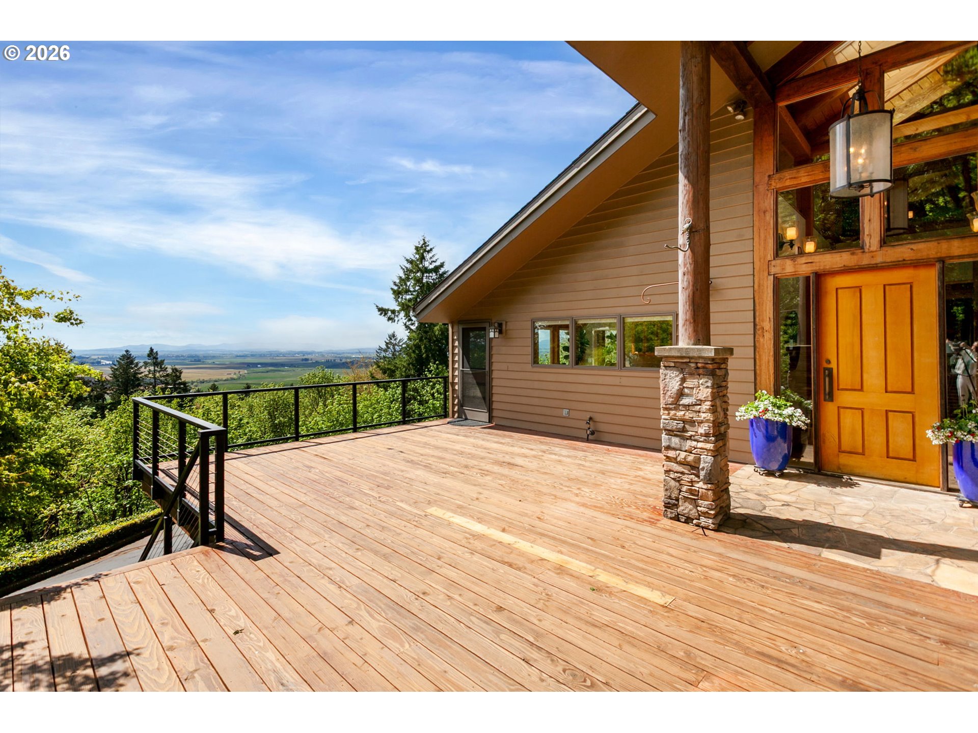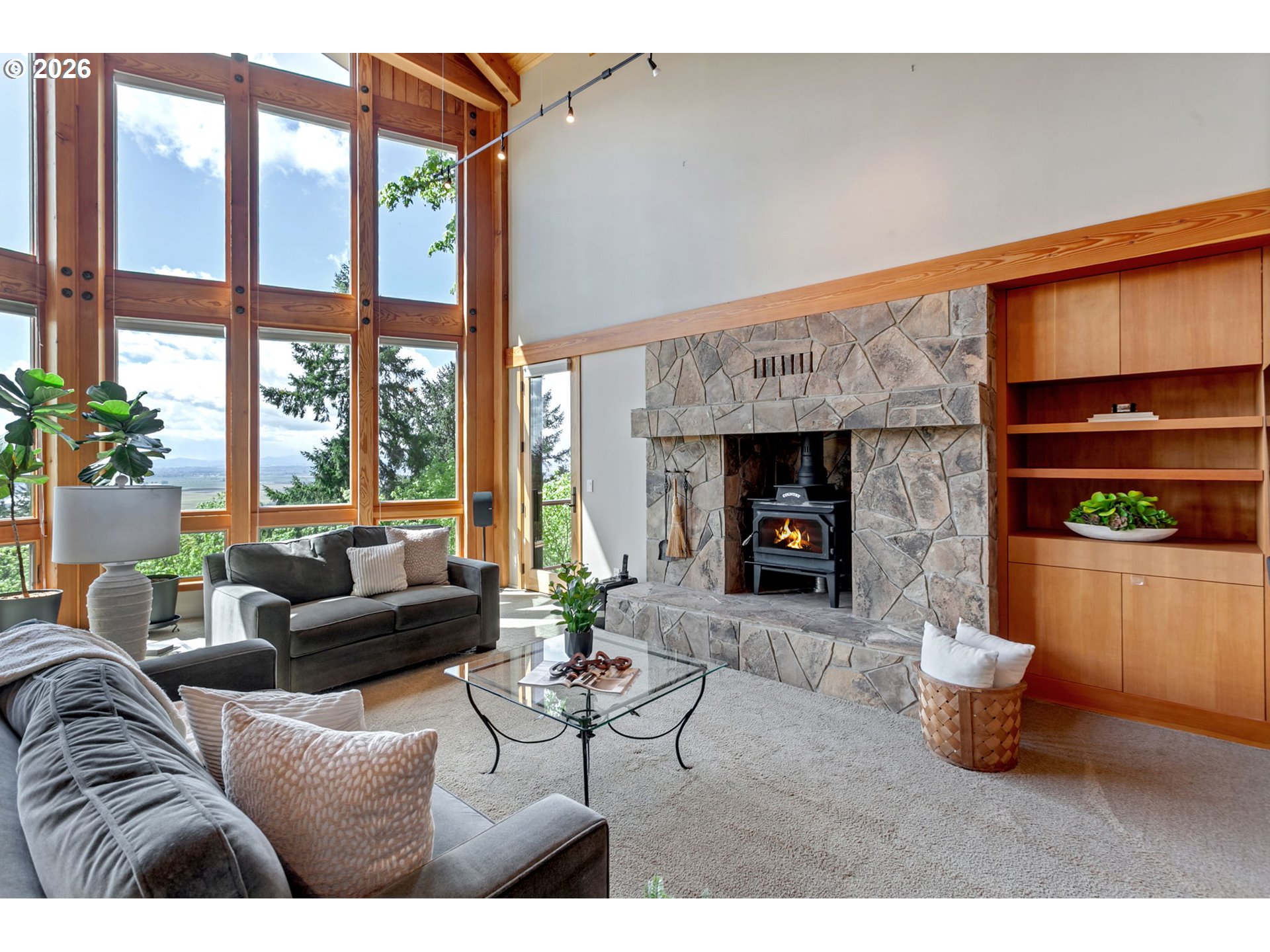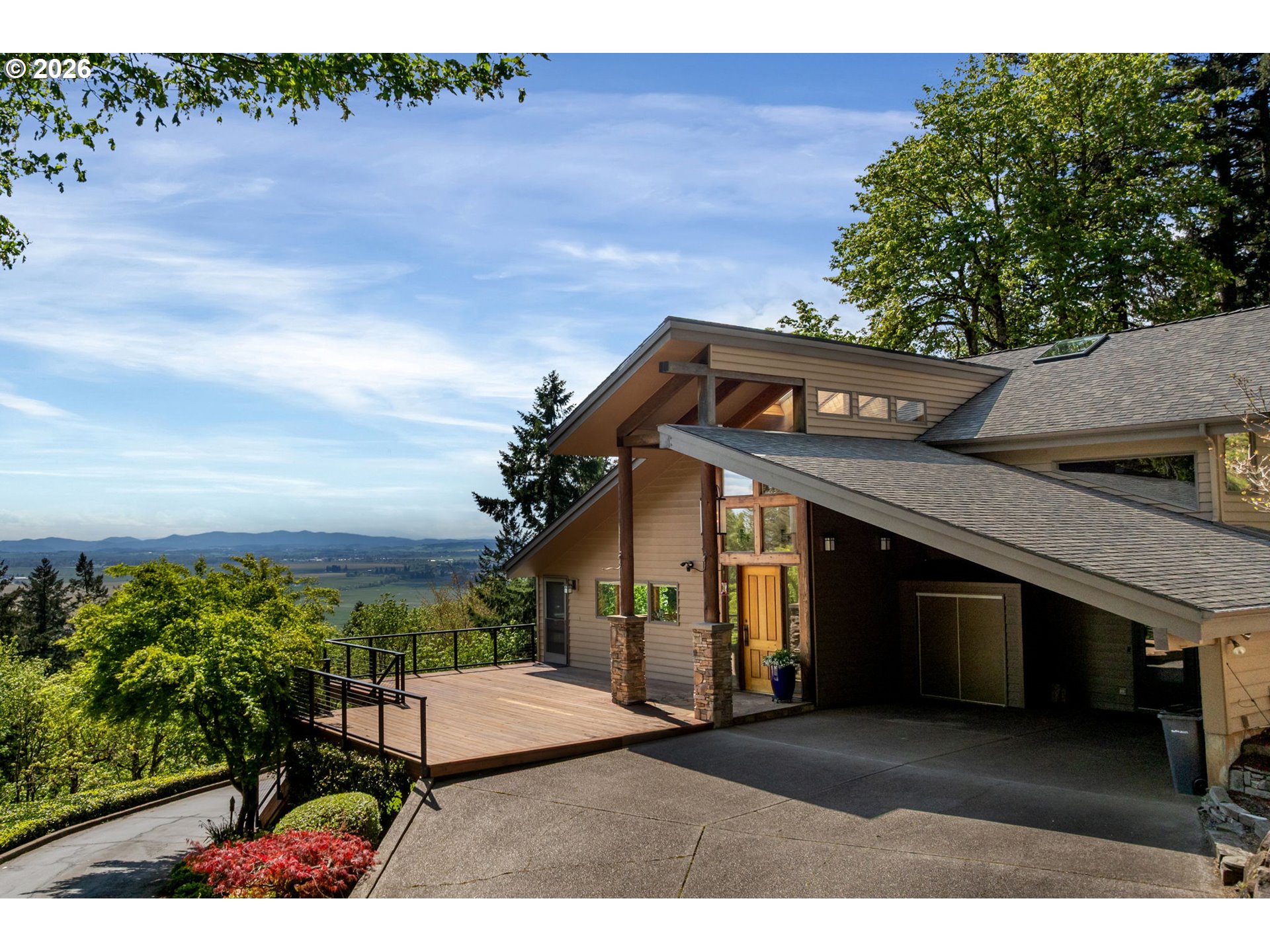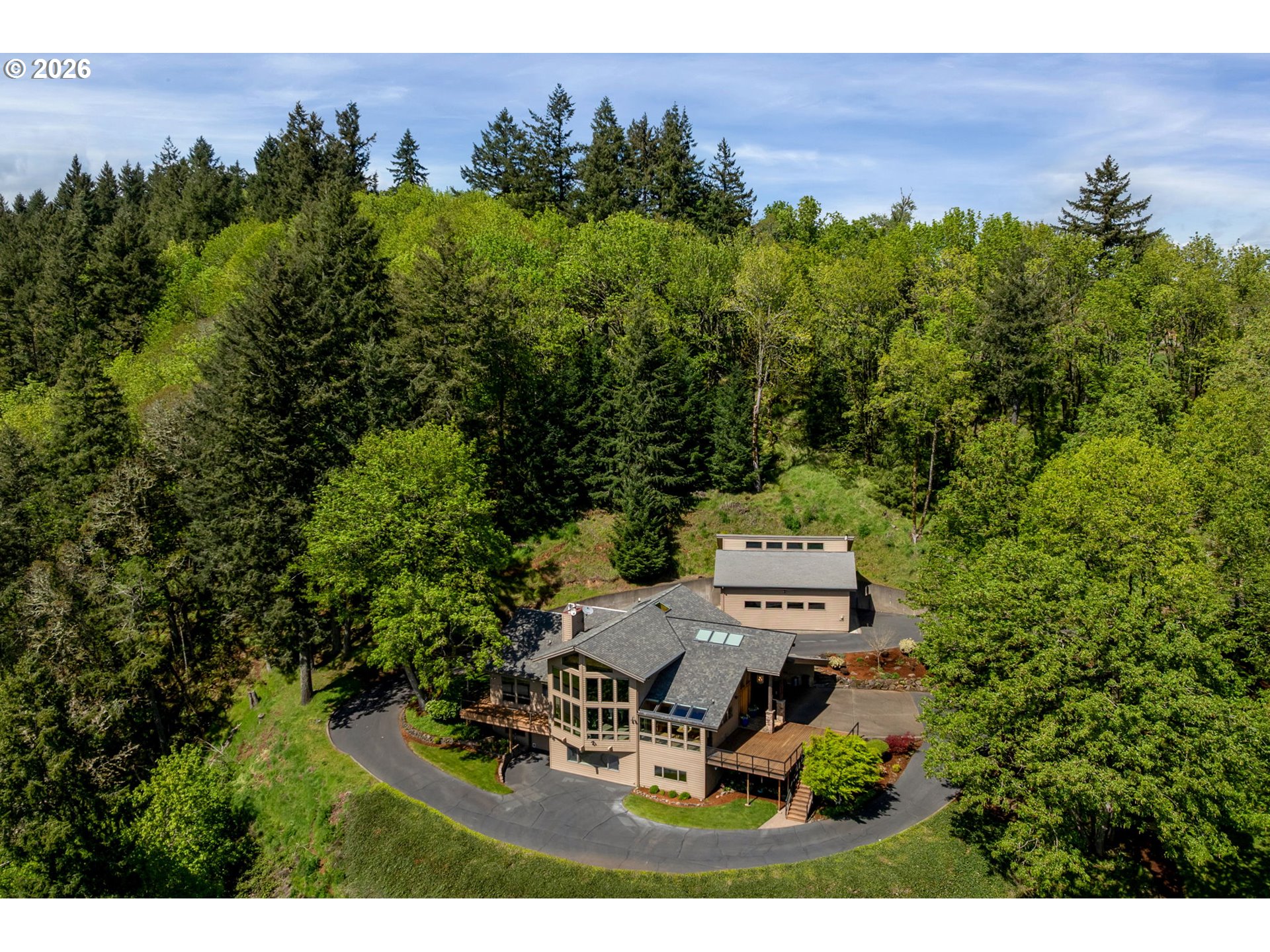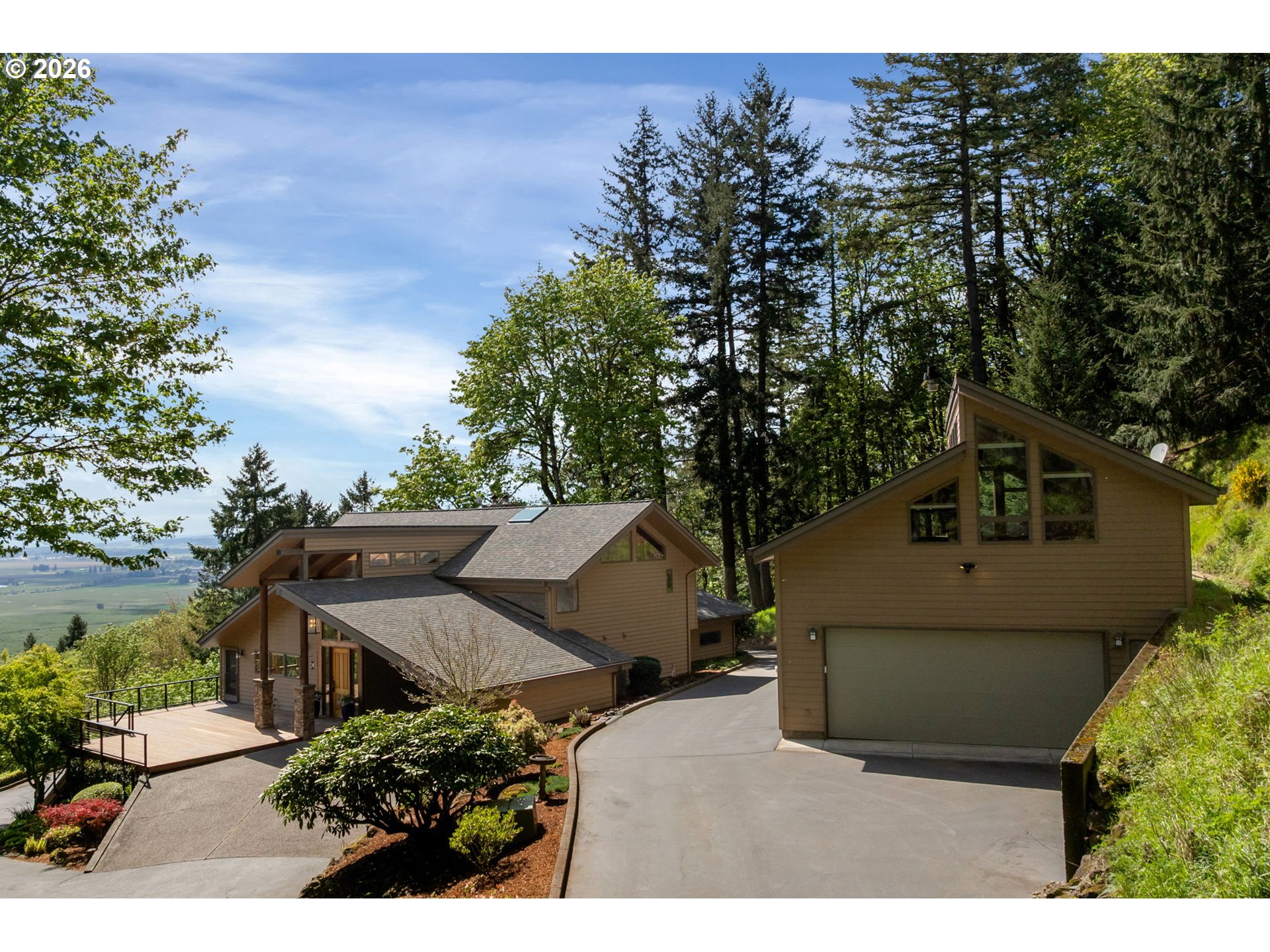 (503) 893-8874Architecturally designed NW-style home with sweeping views of the South Willamette Valley and river, offered for the first time on the market. This one-of-a-kind property showcases exceptional craftsmanship, including solid Douglas fir beams, hemlock tongue-and-groove ceilings, oak floors, and an impressive 8’ solid cherry front door.The vaulted living and dining areas are designed to maximize natural light and views, centered around a striking Ochoco Fawn stone fireplace with wood stove. The kitchen features cherry cabinetry, oak flooring, induction cooktop, French door refrigerator, updated dishwasher, and a large island ideal for entertaining.Primary suite offers expansive views, private deck access with new membrane, Hunter Douglas window coverings, sound-dampening features, walk-in California Closet system, and flexible bonus space. The ensuite bath includes heated tile floors, walk-in tile shower, double sinks, and custom finishes.Additional bedrooms include two on the main level with a remodeled hall bath featuring soaking tub, cherry cabinetry, and heated tile floors. Lower-level bedroom offers valley views and access to a remodeled full bath with tile shower.Lower level includes an oversized rec room with heated concrete floors, plus a climate-controlled wine cellar. Extensive storage throughout with custom built-ins.Exterior features cedar siding, Anderson windows and doors, irrigation via Rain Bird system, and a 500-gallon water holding tank with pressure system and softener (Rickreall Community Water).Garage and shop amenities include a 4-car drive-through garage with 220 power, Tesla charger, and 24x35 heated flex space (currently used as a gym), plus a separate 24x24 workshop with wood stove. Detached garage built in 2008.Additional features: Lennox HVAC system (2011), new water heater (2026), alarm system, crawlspace vapor barrier with air circulation system, surround sound, and multiple updated systems throughout.