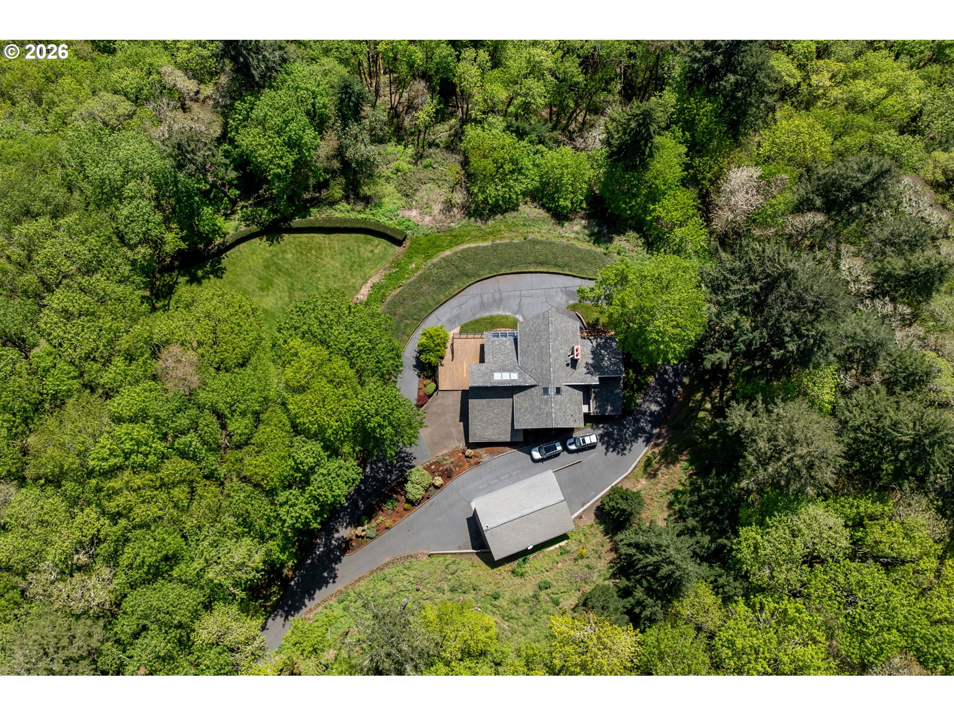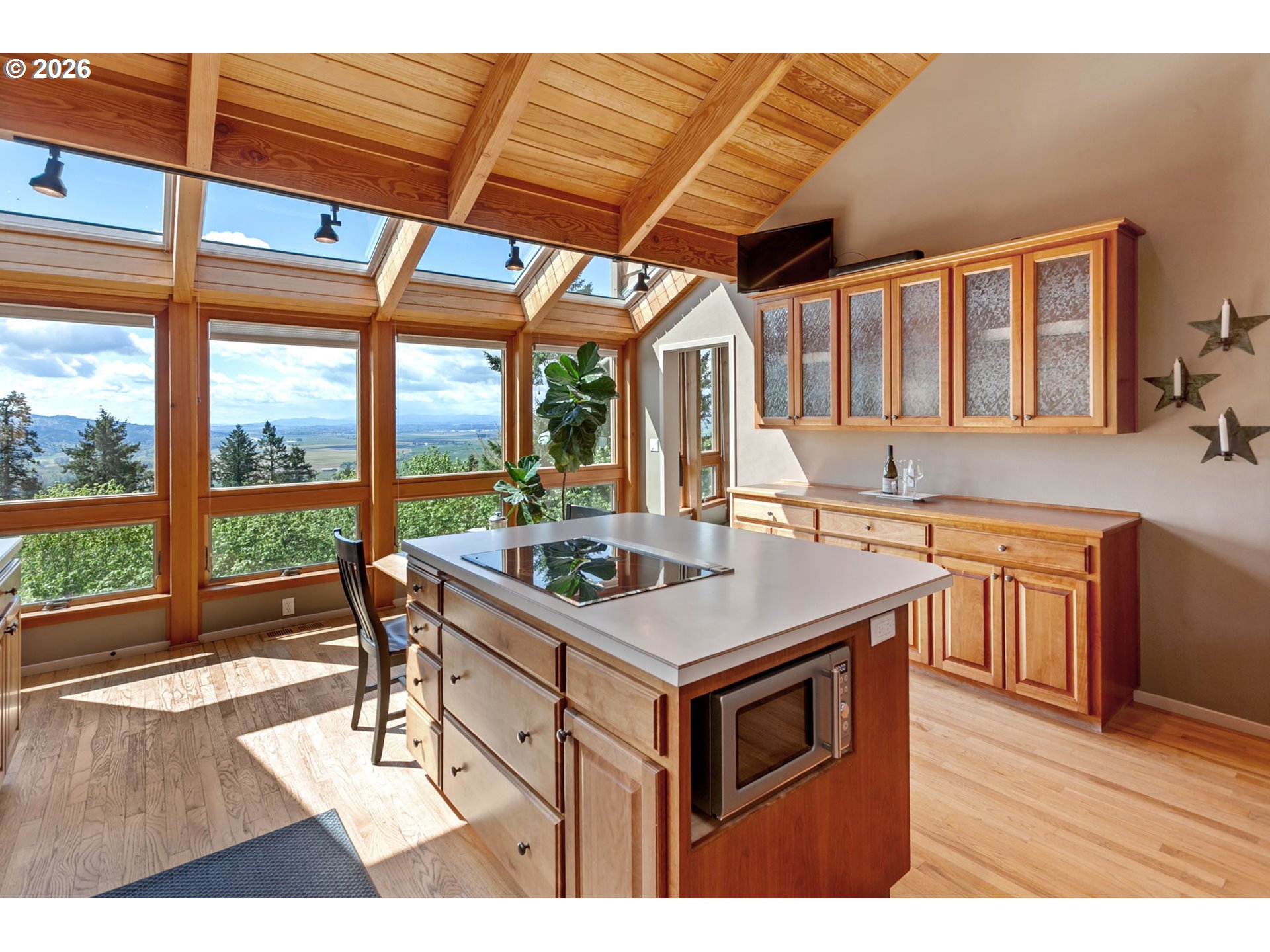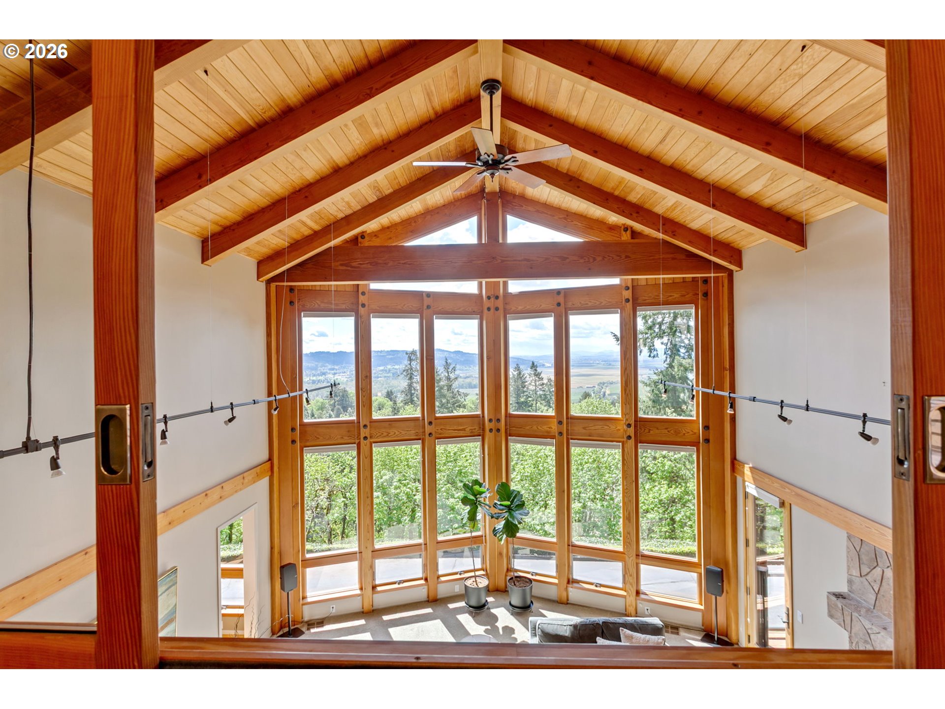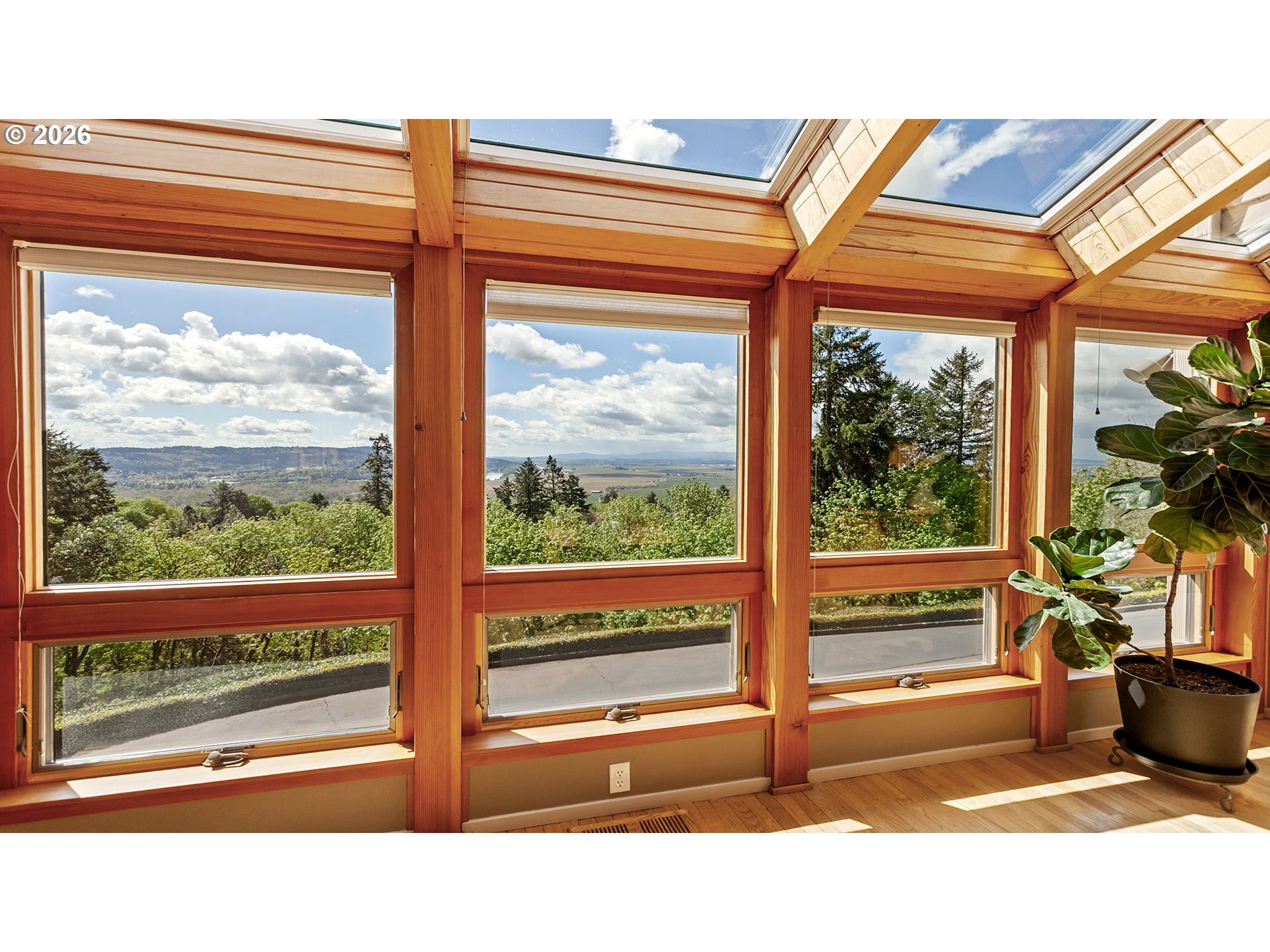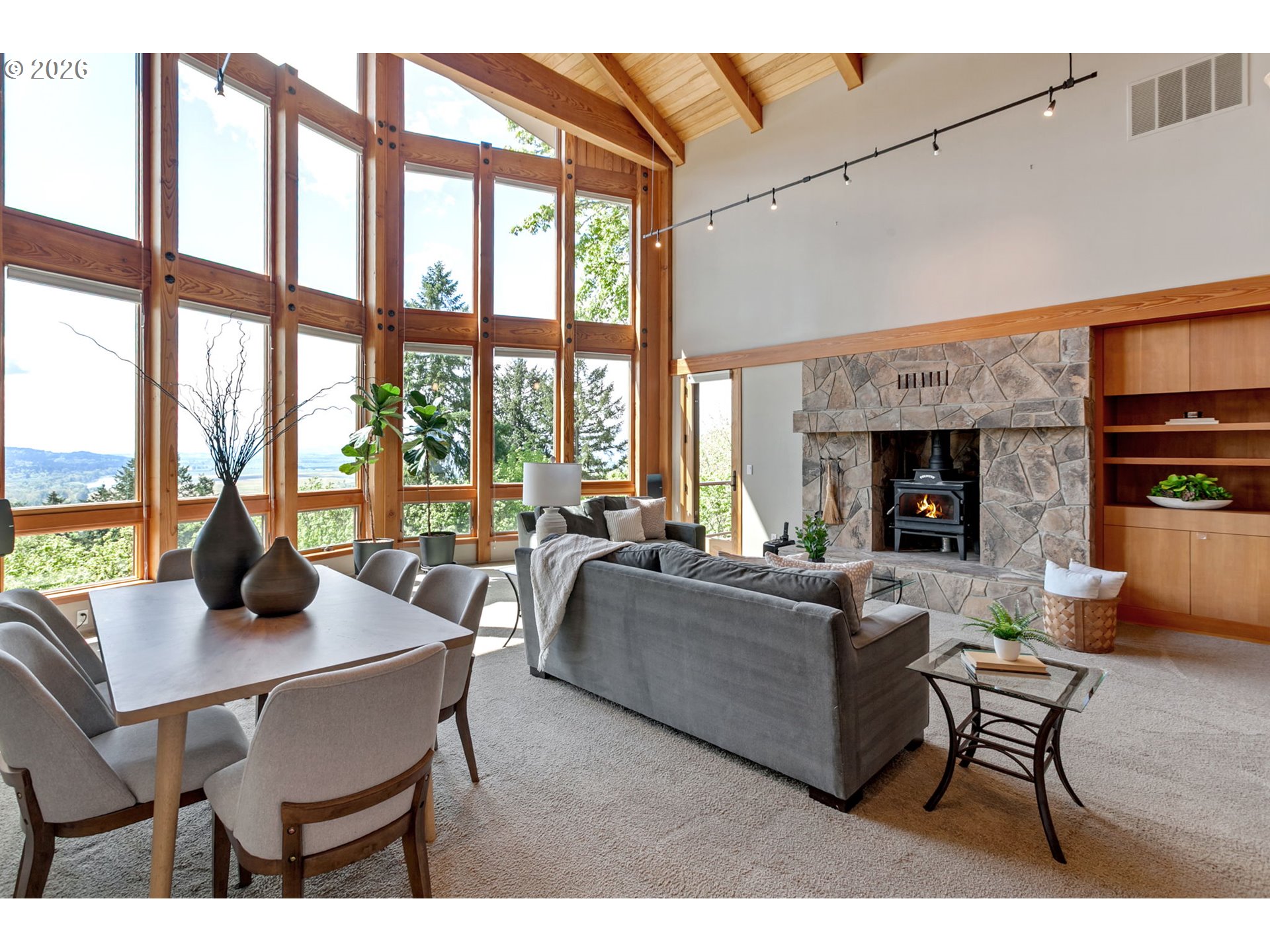 (503) 893-8874Architecturally designed NW-style home with sweeping views of the South Willamette Valley and river, offered for the first time on the market. This one-of-a-kind property showcases exceptional craftsmanship, including solid Douglas fir beams, hemlock tongue-and-groove ceilings, oak floors, and an impressive 8’ solid cherry front door.The vaulted living and dining areas are designed to maximize natural light and views, centered around a striking Ochoco Fawn stone fireplace with wood stove. The kitchen features cherry cabinetry, oak flooring, induction cooktop, French door refrigerator, updated dishwasher, and a large island ideal for entertaining.Primary suite offers expansive views, private deck access with new membrane, Hunter Douglas window coverings, sound-dampening features, walk-in California Closet system, and flexible bonus space. The ensuite bath includes heated tile floors, walk-in tile shower, double sinks, and custom finishes.Additional bedrooms include two on the main level with a remodeled hall bath featuring soaking tub, cherry cabinetry, and heated tile floors. Lower-level bedroom offers valley views and access to a remodeled full bath with tile shower.Lower level includes an oversized rec room with heated concrete floors, plus a climate-controlled wine cellar. Extensive storage throughout with custom built-ins.Exterior features cedar siding, Anderson windows and doors, irrigation via Rain Bird system, and a 500-gallon water holding tank with pressure system and softener (Rickreall Community Water).Garage and shop amenities include a 4-car drive-through garage with 220 power, Tesla charger, and 24x35 heated flex space (currently used as a gym), plus a separate 24x24 workshop with wood stove. Detached garage built in 2008.Additional features: Lennox HVAC system (2011), new water heater (2026), alarm system, crawlspace vapor barrier with air circulation system, surround sound, and multiple updated systems throughout.