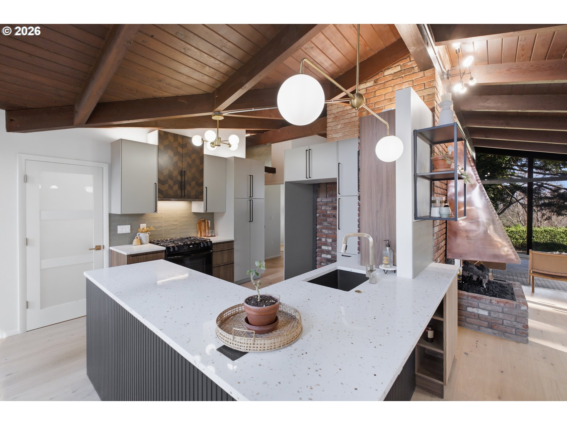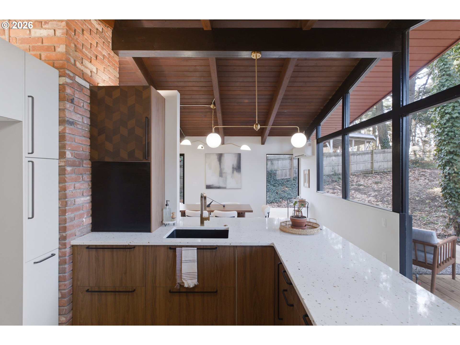 (503) 893-8874Welcome to this fully renovated mid-century modern blending iconic architecture with designer updates. Floor-to-ceiling windows flood the home with light, original tongue-and-groove ceilings & striking brick fireplace with copper hood. The custom kitchen features quartz terrazzo counters, soft-close cabinetry & a peninsula. Double sliders open to a wraparound cedar deck. Set on a private .26-acre lot with city views, RV/shop potential & a finished basement with living & bonus room for dual/investment living