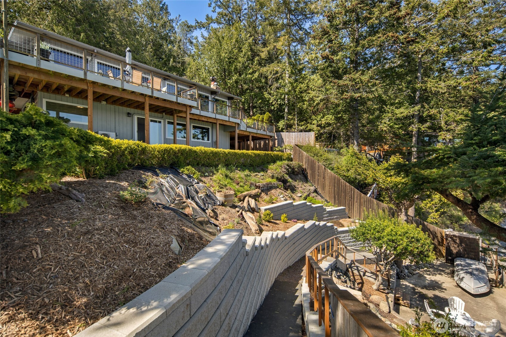 This striking 3 bedroom waterfront home features premium upgrades throughout, vaulted tongue & groove cedar ceilings, wide plank oak floors, marble countertops, high-end appliances. Primary en-suite bedroom on main level with sliders to a private deck. Two bedrooms and a spacious bonus room with a murphy bed on the lower level. Revel in the captivating water views, ferry & boating activity right from your sizable IPE deck or light-filled living room. Property features evergreens, attractive landscaping, tall cedar fences, and a new smart gate at the entrance. Take the sturdy steps down to the beach for your enjoyment. The bulkhead has power, water, and a boat lift. A timeless house with unforgettable views and close proximity to ferry!