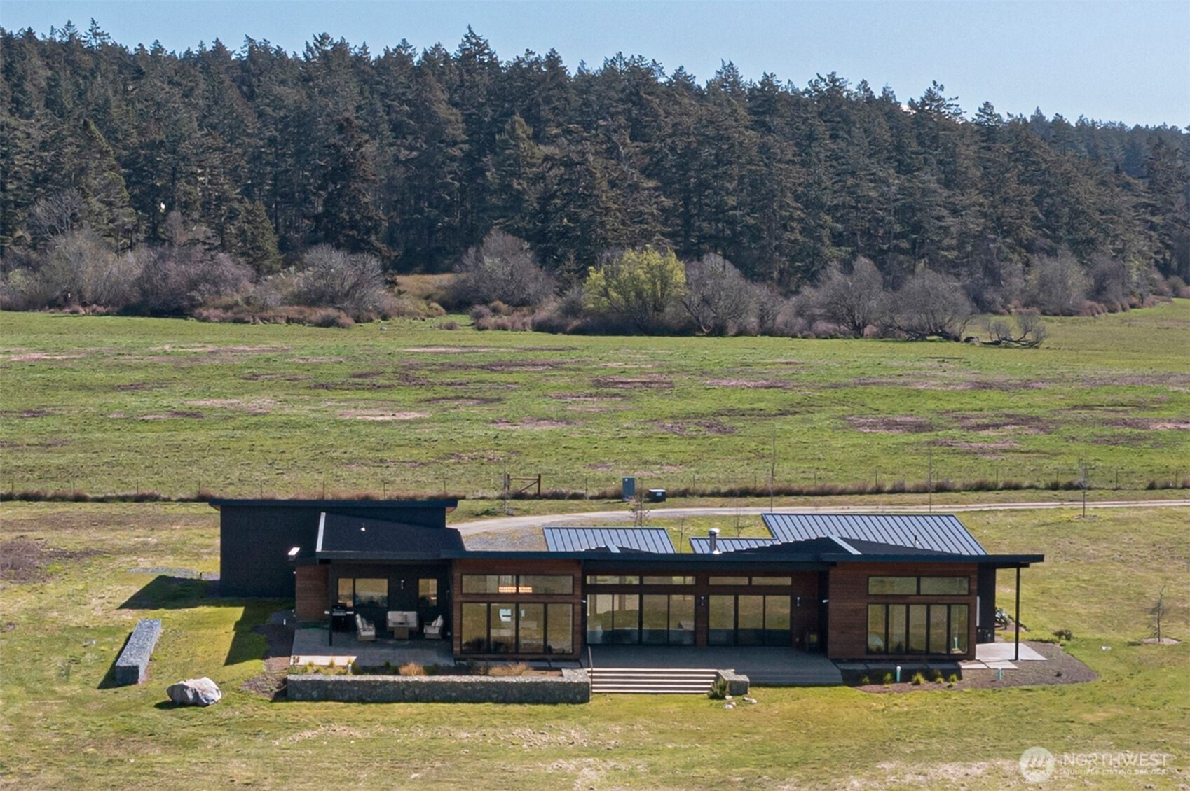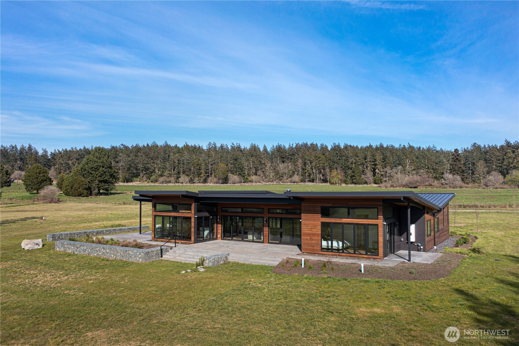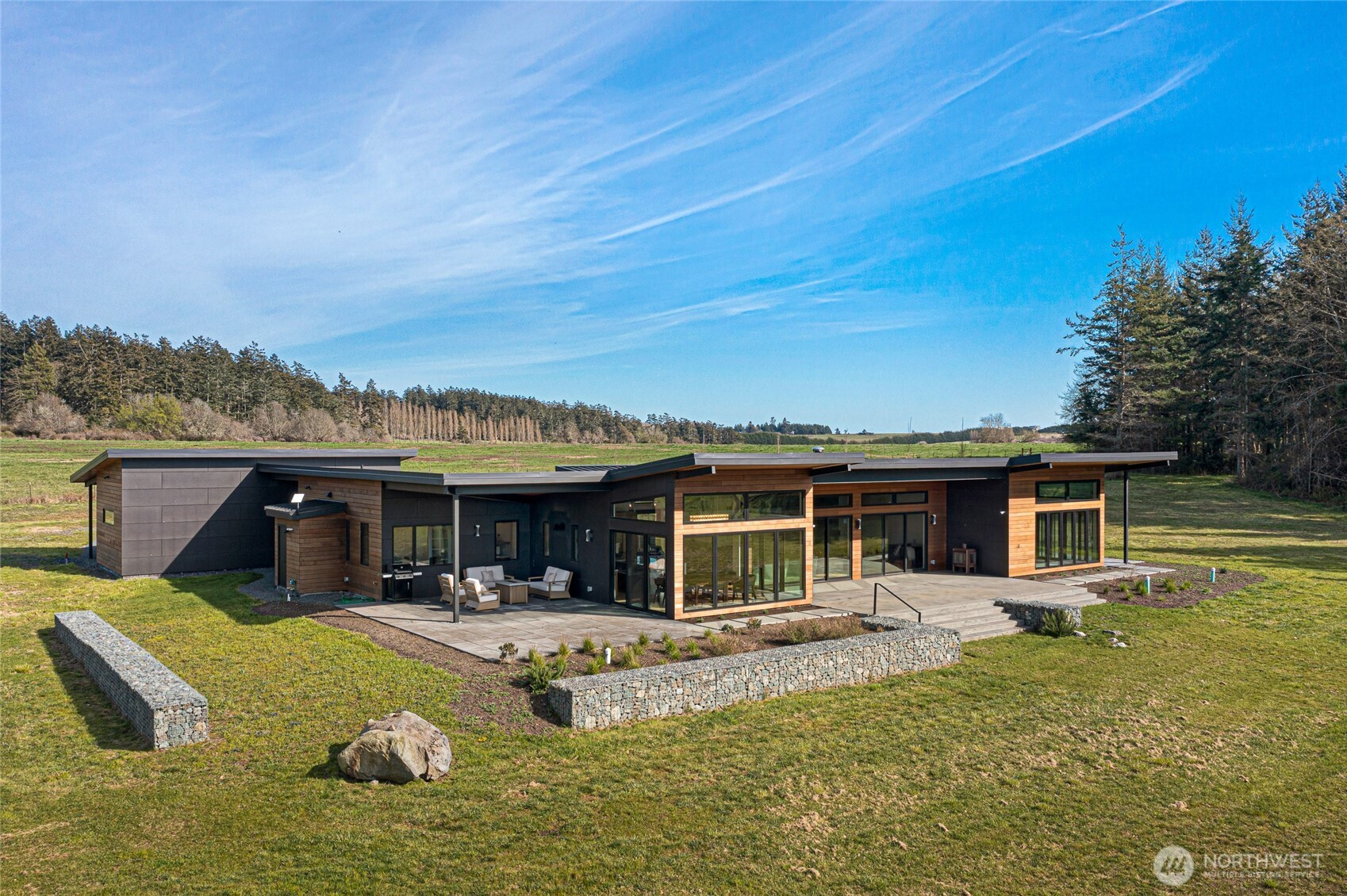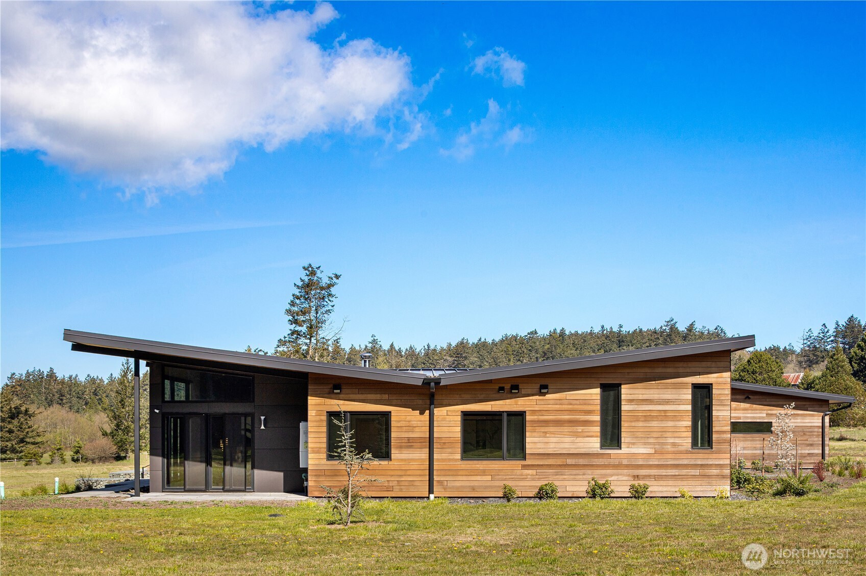 Refined living near beautiful False Bay—this is a rare opportunity to own a newly built modern estate on 8± private acres in the sought-after Gleneagle neighborhood. Completed in 2023, the home combines clean, contemporary design with timeless craftsmanship, all set among open skies, west-facing views, and peaceful island privacy. The 3,372 sq ft main residence features three en-suite bedrooms, five bathrooms, and a dedicated office, offering a layout that works just as well for daily living as it does for entertaining. At the heart of the home is an open-concept living space anchored by a chef’s kitchen with high-end appliances, custom cabinetry, and quality finishes throughout. Expansive windows fill the home with natural light and frame serene meadow and sunset views, along with a picturesque outlook across common land featuring a pond, gazebo, and small dock. A separate 786 sq ft guesthouse provides flexible space for visitors, extended stays, or a private studio—while preserving privacy for both homes. Modern San Juan Island living at its best—new construction, thoughtful design, and a quiet, scenic setting just minutes from Friday Harbor’s shops, dining, and marina.