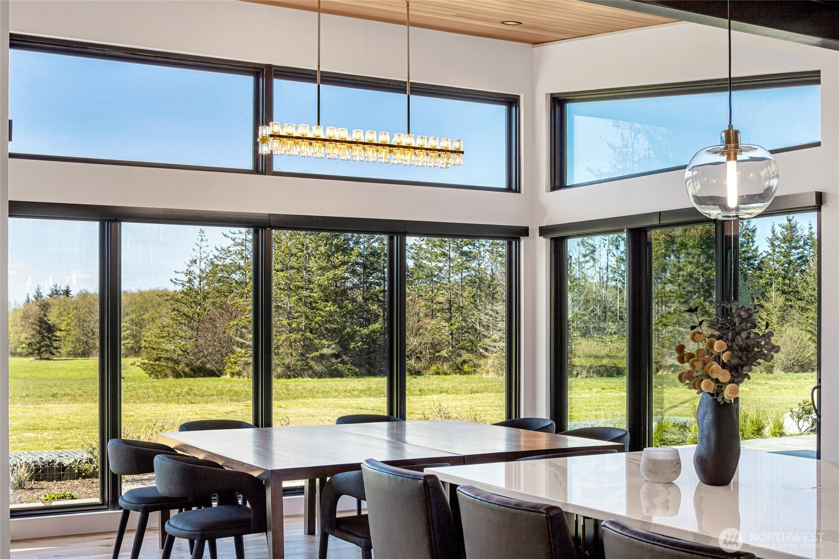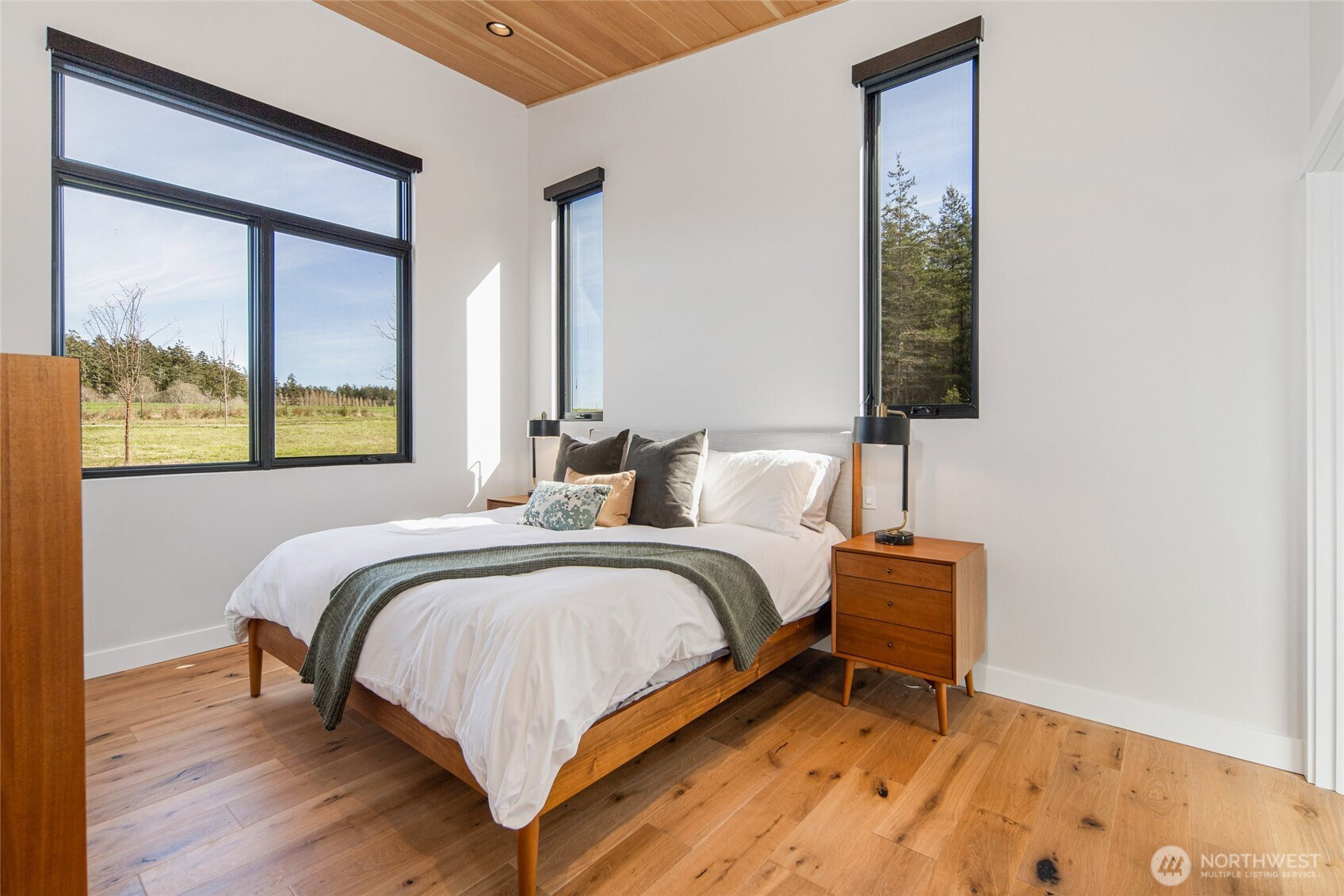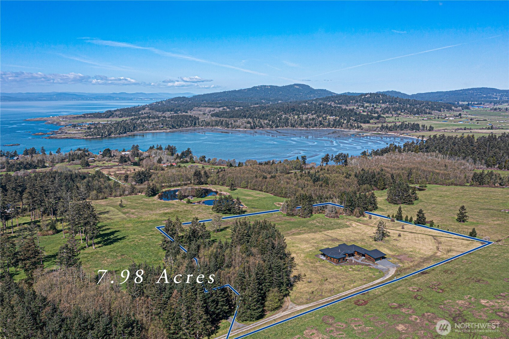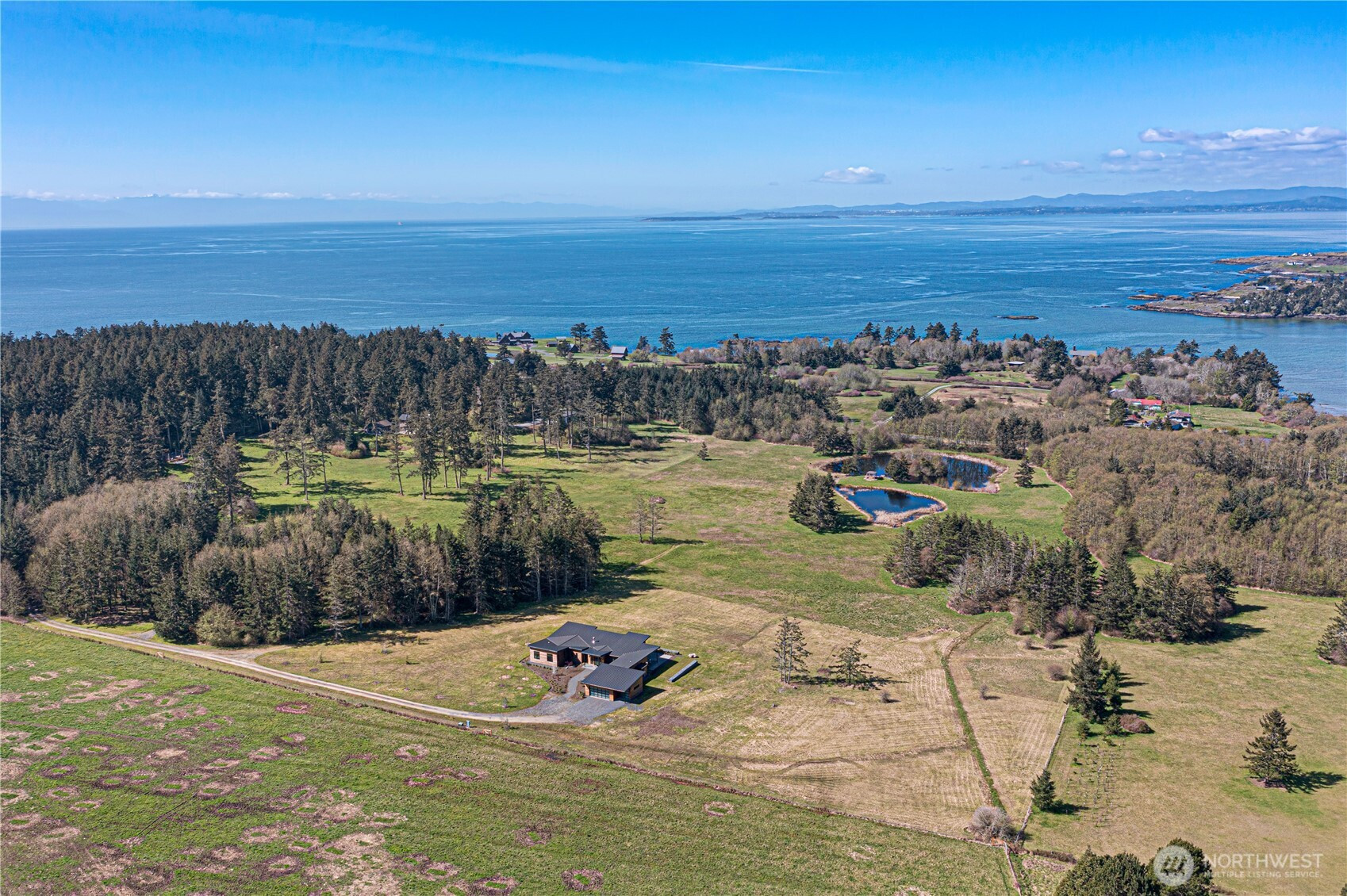 Refined living near beautiful False Bay—this is a rare opportunity to own a newly built modern estate on 8± private acres in the sought-after Gleneagle neighborhood. Completed in 2023, the home combines clean, contemporary design with timeless craftsmanship, all set among open skies, west-facing views, and peaceful island privacy. The 3,372 sq ft main residence features three en-suite bedrooms, five bathrooms, and a dedicated office, offering a layout that works just as well for daily living as it does for entertaining. At the heart of the home is an open-concept living space anchored by a chef’s kitchen with high-end appliances, custom cabinetry, and quality finishes throughout. Expansive windows fill the home with natural light and frame serene meadow and sunset views, along with a picturesque outlook across common land featuring a pond, gazebo, and small dock. A separate 786 sq ft guesthouse provides flexible space for visitors, extended stays, or a private studio—while preserving privacy for both homes. Modern San Juan Island living at its best—new construction, thoughtful design, and a quiet, scenic setting just minutes from Friday Harbor’s shops, dining, and marina.