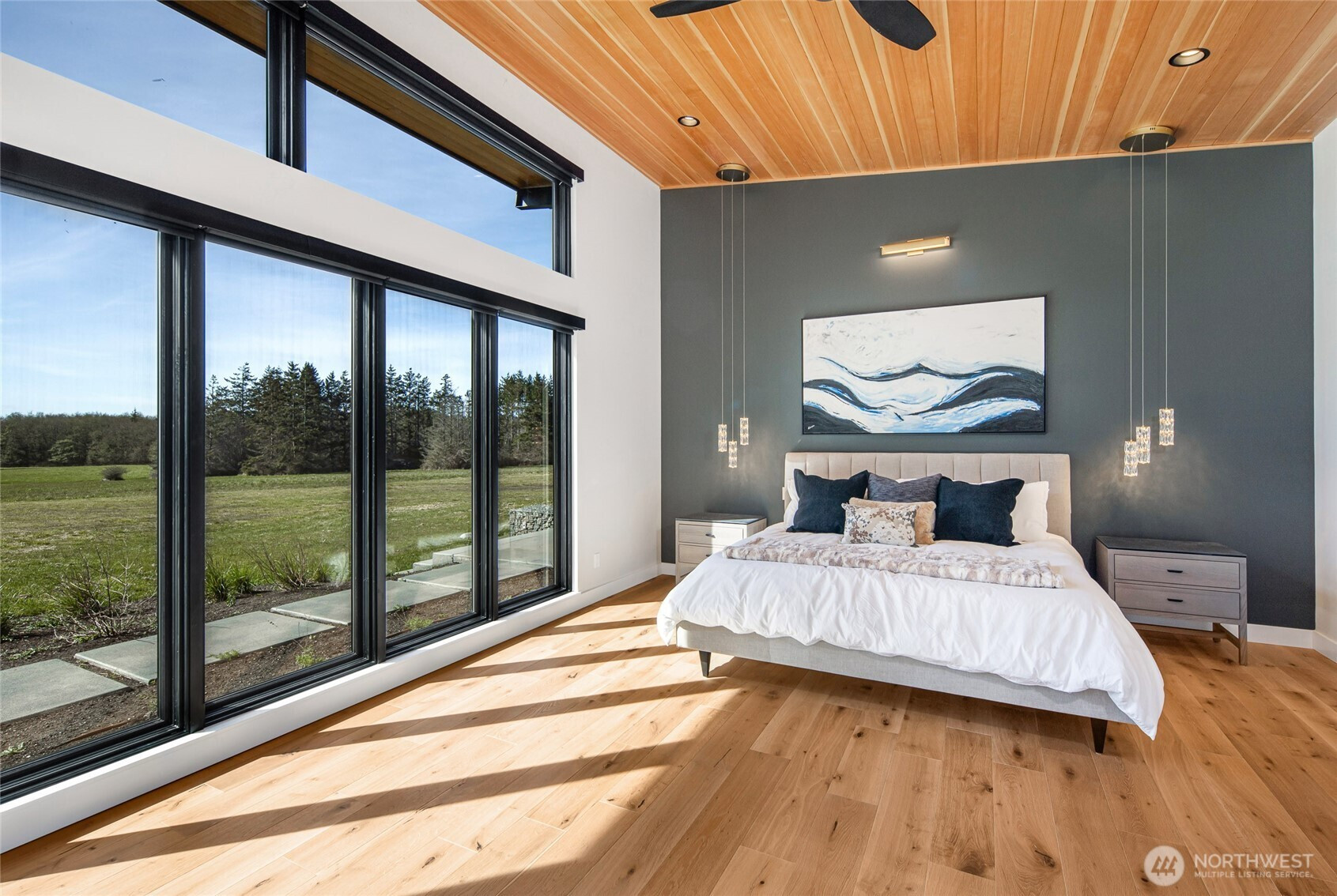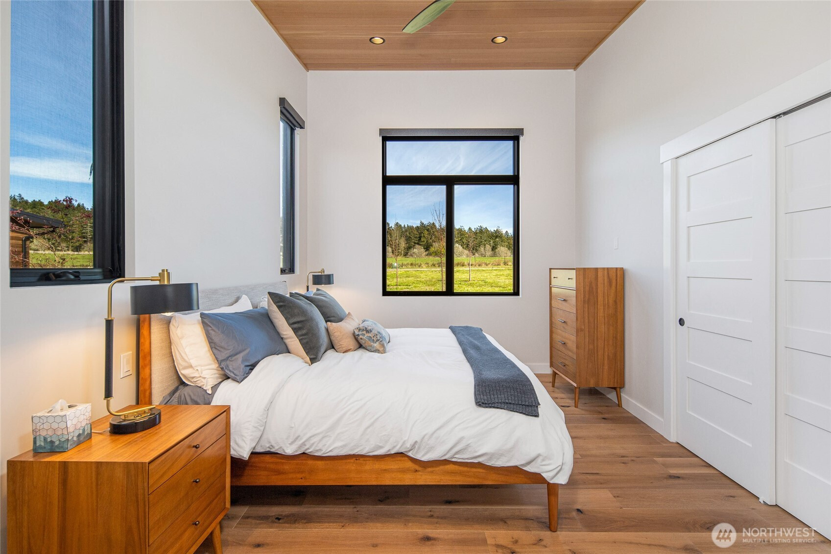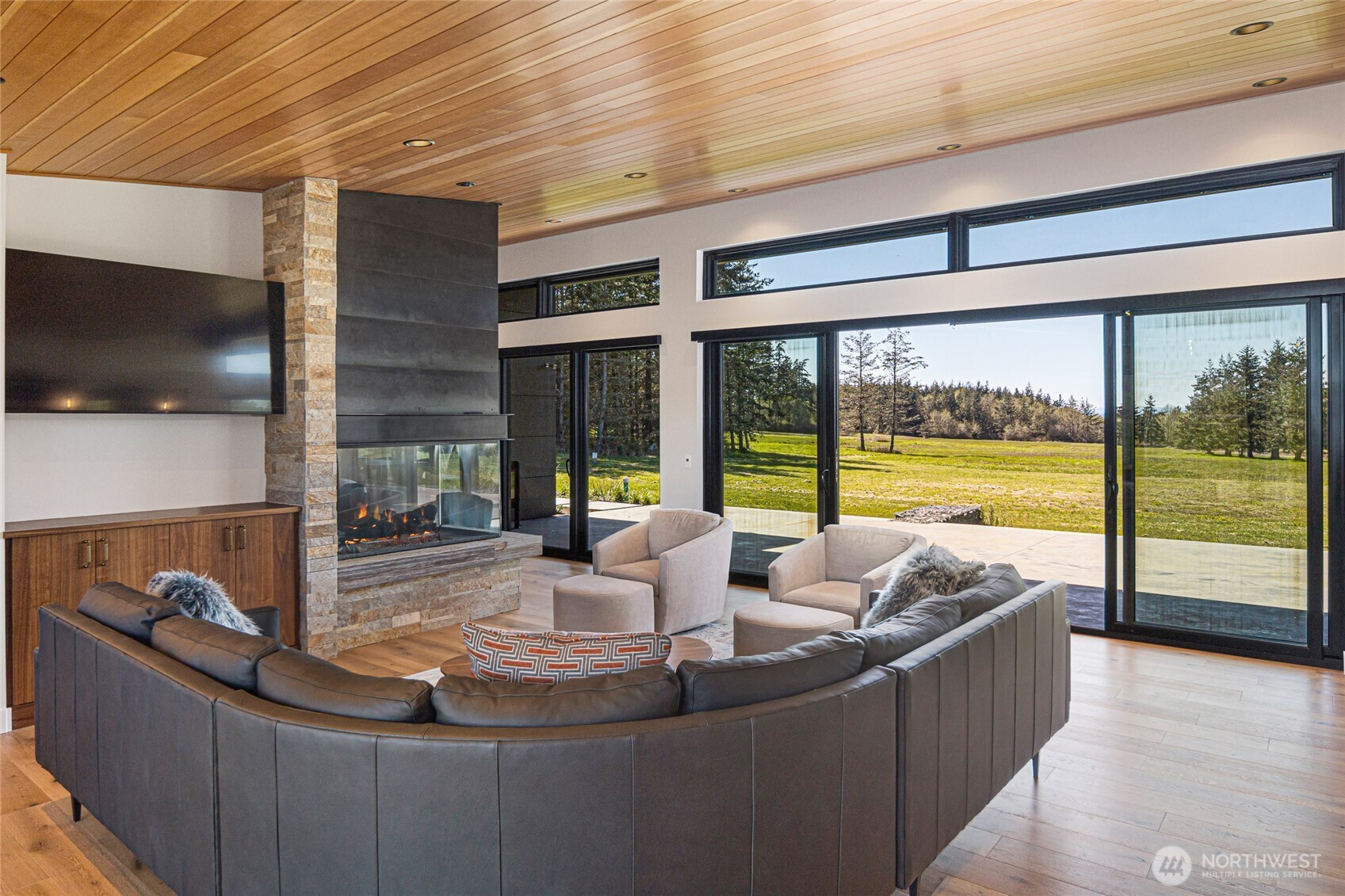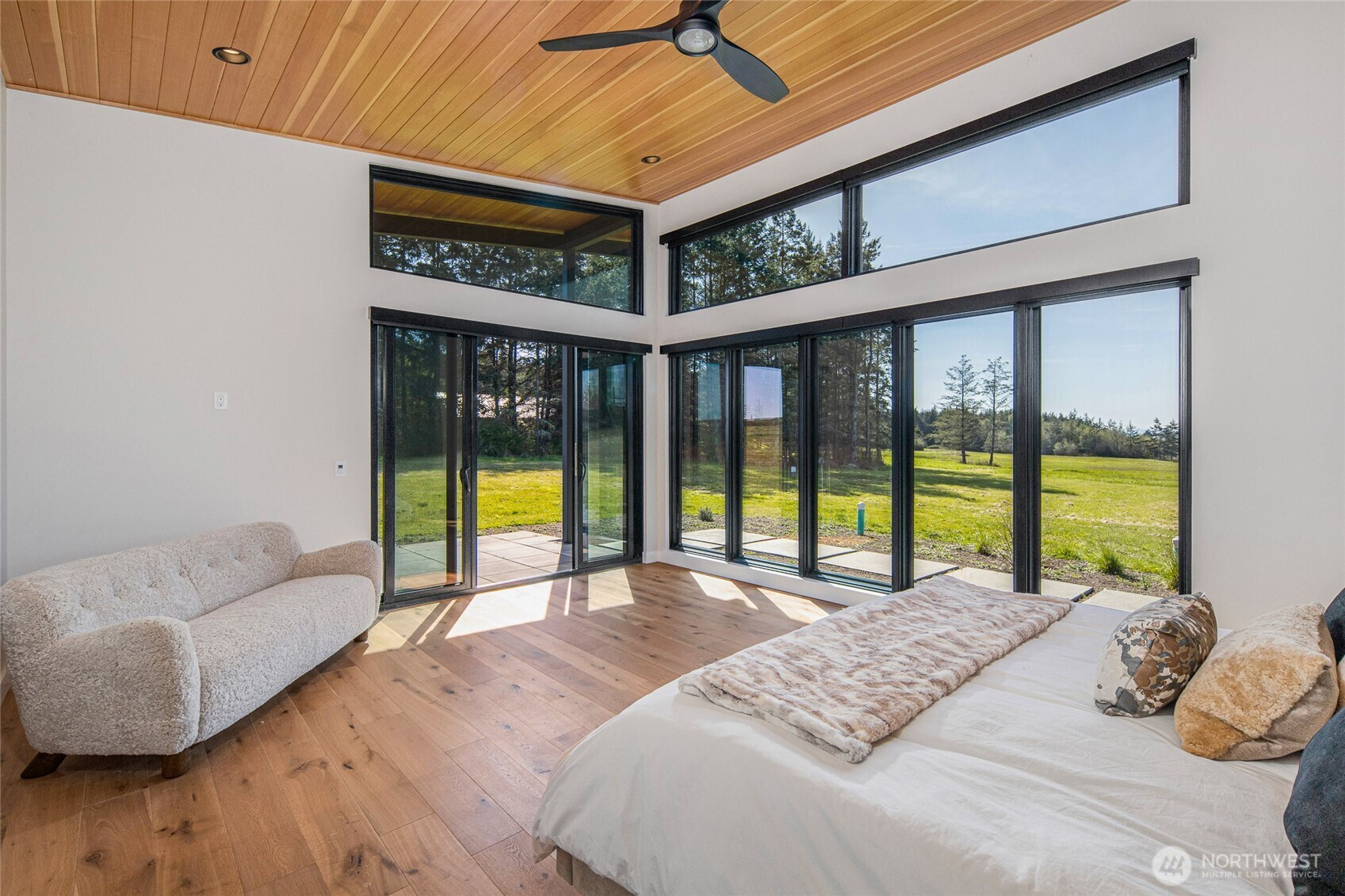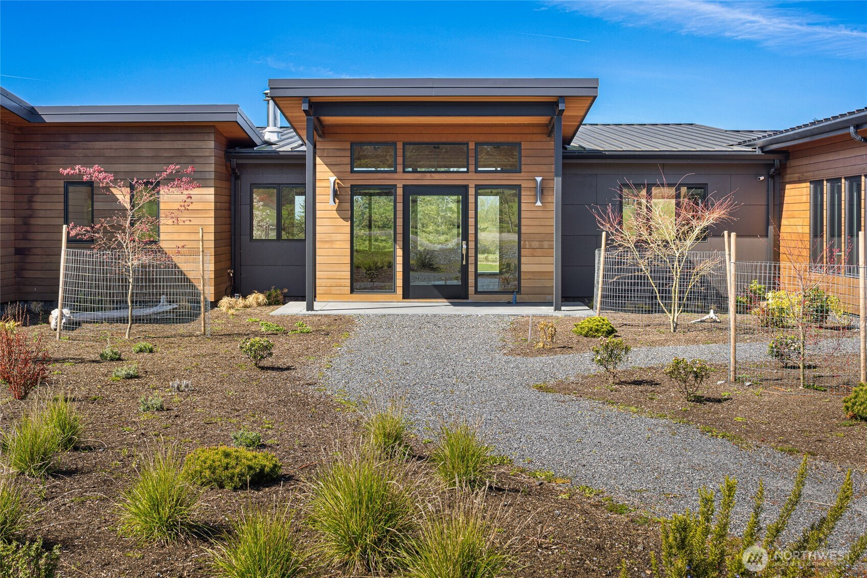 Refined living near beautiful False Bay—this is a rare opportunity to own a newly built modern estate on 8± private acres in the sought-after Gleneagle neighborhood. Completed in 2023, the home combines clean, contemporary design with timeless craftsmanship, all set among open skies, west-facing views, and peaceful island privacy. The 3,372 sq ft main residence features three en-suite bedrooms, five bathrooms, and a dedicated office, offering a layout that works just as well for daily living as it does for entertaining. At the heart of the home is an open-concept living space anchored by a chef’s kitchen with high-end appliances, custom cabinetry, and quality finishes throughout. Expansive windows fill the home with natural light and frame serene meadow and sunset views, along with a picturesque outlook across common land featuring a pond, gazebo, and small dock. A separate 786 sq ft guesthouse provides flexible space for visitors, extended stays, or a private studio—while preserving privacy for both homes. Modern San Juan Island living at its best—new construction, thoughtful design, and a quiet, scenic setting just minutes from Friday Harbor’s shops, dining, and marina.