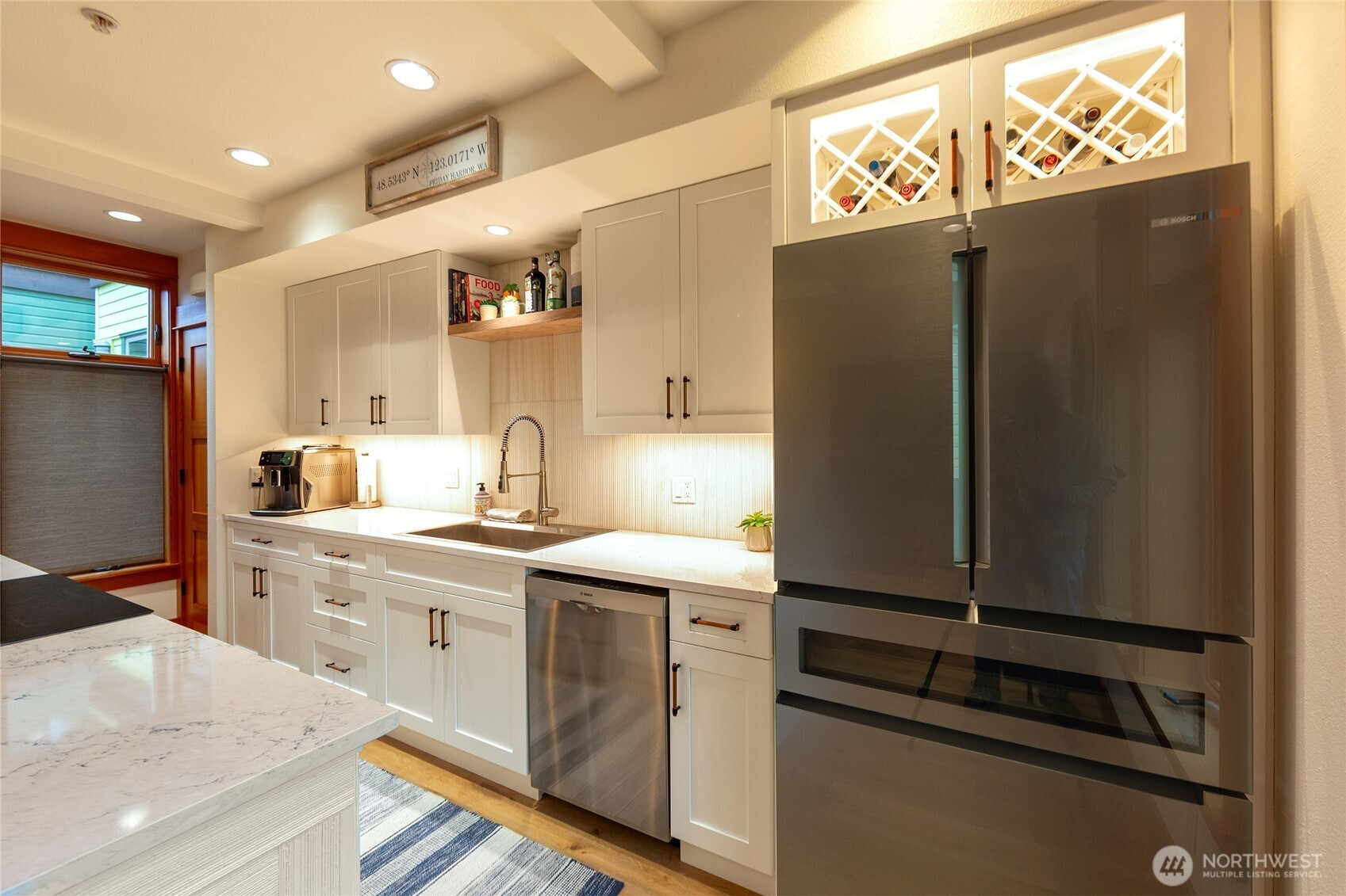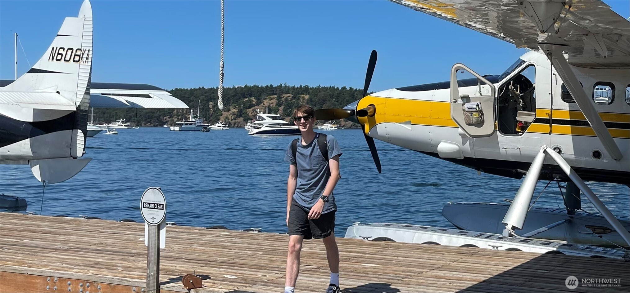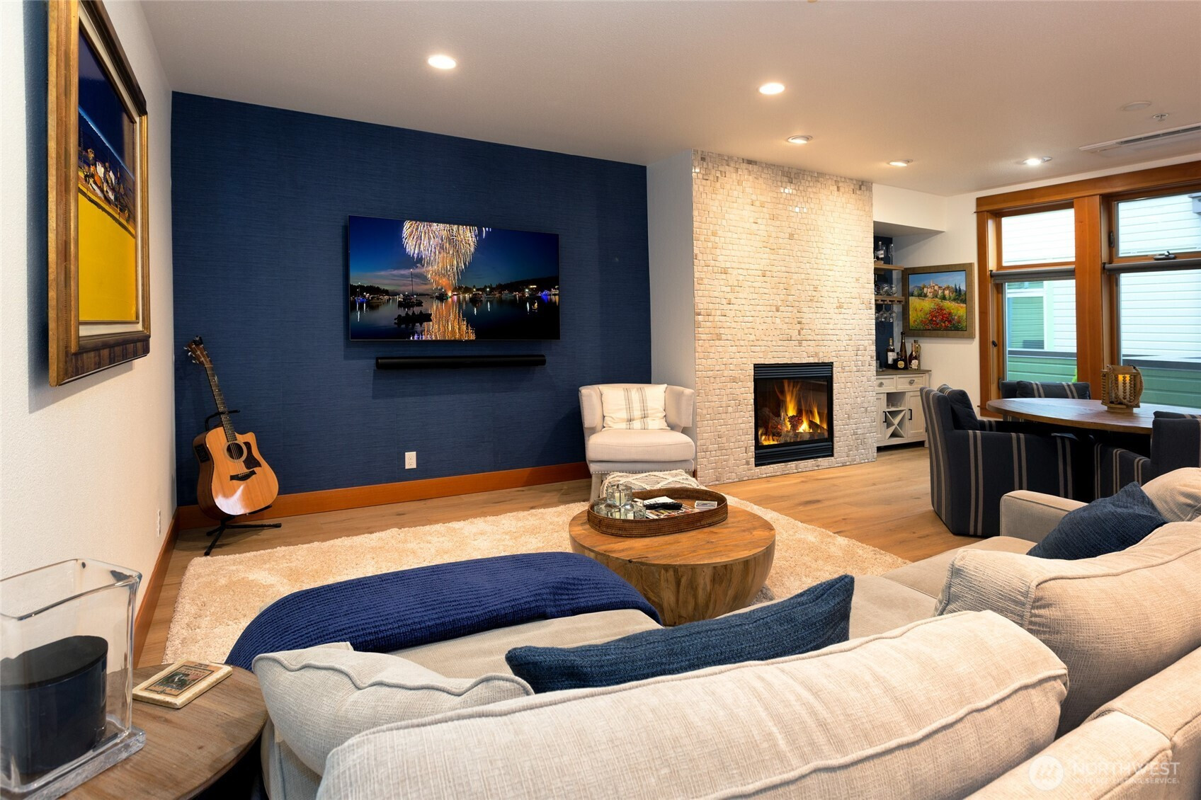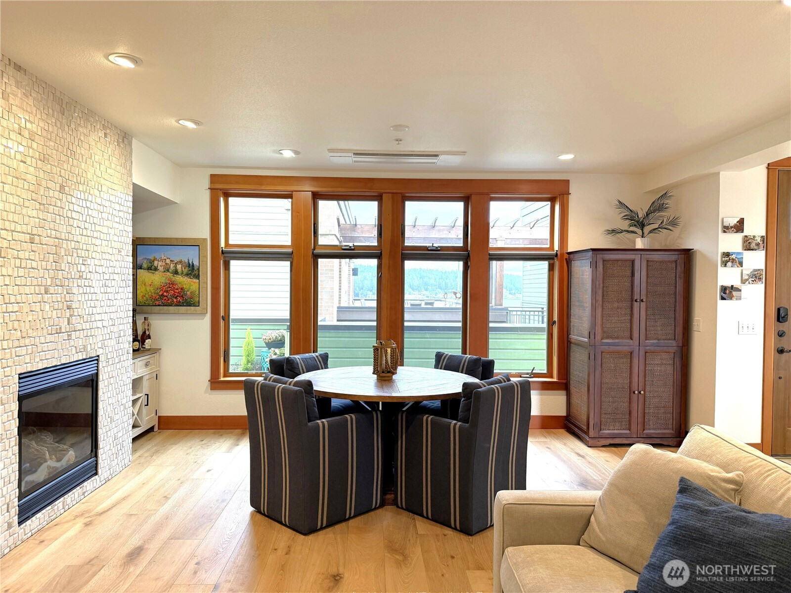 Live where the action is in the vibrant core of Friday Harbor! Just steps to the marina, ferry, restaurants, and shopping, this beautifully remodeled 1,628 sq ft condo offers the perfect blend of luxury, comfort, and convenience. Nightly rentals are allowed in the complex. Enjoy views of the harbor, ferry arrivals, seaplanes, and boating activity from the roof top deck. The open-concept living space features a dramatic floor-to-ceiling marble tile propane fireplace and abundant natural light. The chef’s kitchen is designed to impress with stainless steel Bosch appliances, induction range, generous eat-in island, quartz countertops, and marble backsplash. Two spacious bedrooms and two full baths include a stunning primary suite with vaulted ceilings, spa-inspired 5-piece bath with dual sinks and soaking tub, and a walk-in closet with custom built-ins. Mini-split heat & A/C ensure year-round comfort. The unit was completely remodeled in 2024 with new flooring, carpets, appliances, kitchen cabinets, countertops, lighting fixtures, a marble tiled fireplace, a bidet toilet, and decking on both decks. Secure coded entry, elevator access, and dedicated parking for your island car in a secure garage provide convenience and peace of mind. Move-in ready, including furniture, and perfectly positioned in the heart of San Juan Island — enjoy effortless island living with harbor views. As the unit can be a VRBO, you can enjoy tax advantages as well as some personal use.