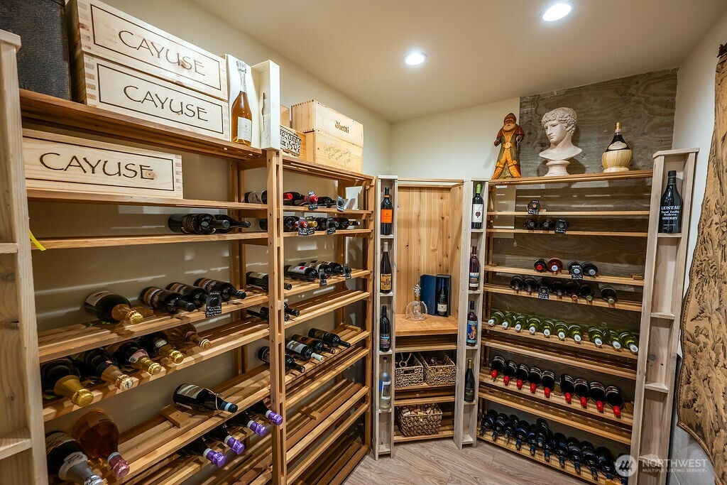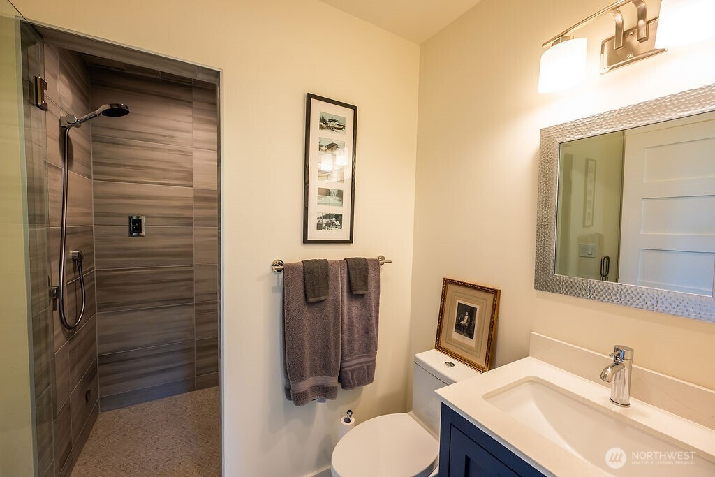 Contemporary, elegant retreat on Lopez Island: Architecturally designed home, completed in 2022, offers calming spaces, indoor/outdoor living & luxury amenities. Enjoy breathtaking sunsets and unparalleled water and mountain views, all from a prime, convenient location. Entertain in the open living/dining space with its soaring ceiling, clerestory windows, built-in bar, and wood-burning fireplace. The chef’s kitchen is a culinary dream featuring top of the line appliances and custom cabinetry. Retreat into the privacy of the library/office. Soak up the island's natural splendor from the west-facing patio, the privacy of the mature garden, and the heated pavilion w/custom pizza oven. The primary bedroom features a generous bathroom with double shower, heated tub, walk-in closet, and gas fireplace. The 3200 SF home was built with sustainability and forever living in mind, with two more ensuite bedrooms for hosting guests, multigenerational living, or housing a caretaker. The second main floor bedroom has a coffee/tea cubby, private patio, and a 3/4 bathroom, while the downstairs guest suite includes a kitchenette, steam shower, and private patio/access. Wine cellar, radiant heat, solar array, fiber cement and slate cladding, fiber optic wifi, remote-monitored alarm, water filtration system, power shades, oversized two car garage w/shop area & storage (EV plug ready), outdoor shower, metal roof. Make this stunning, smartly conceived home your island sanctuary now.