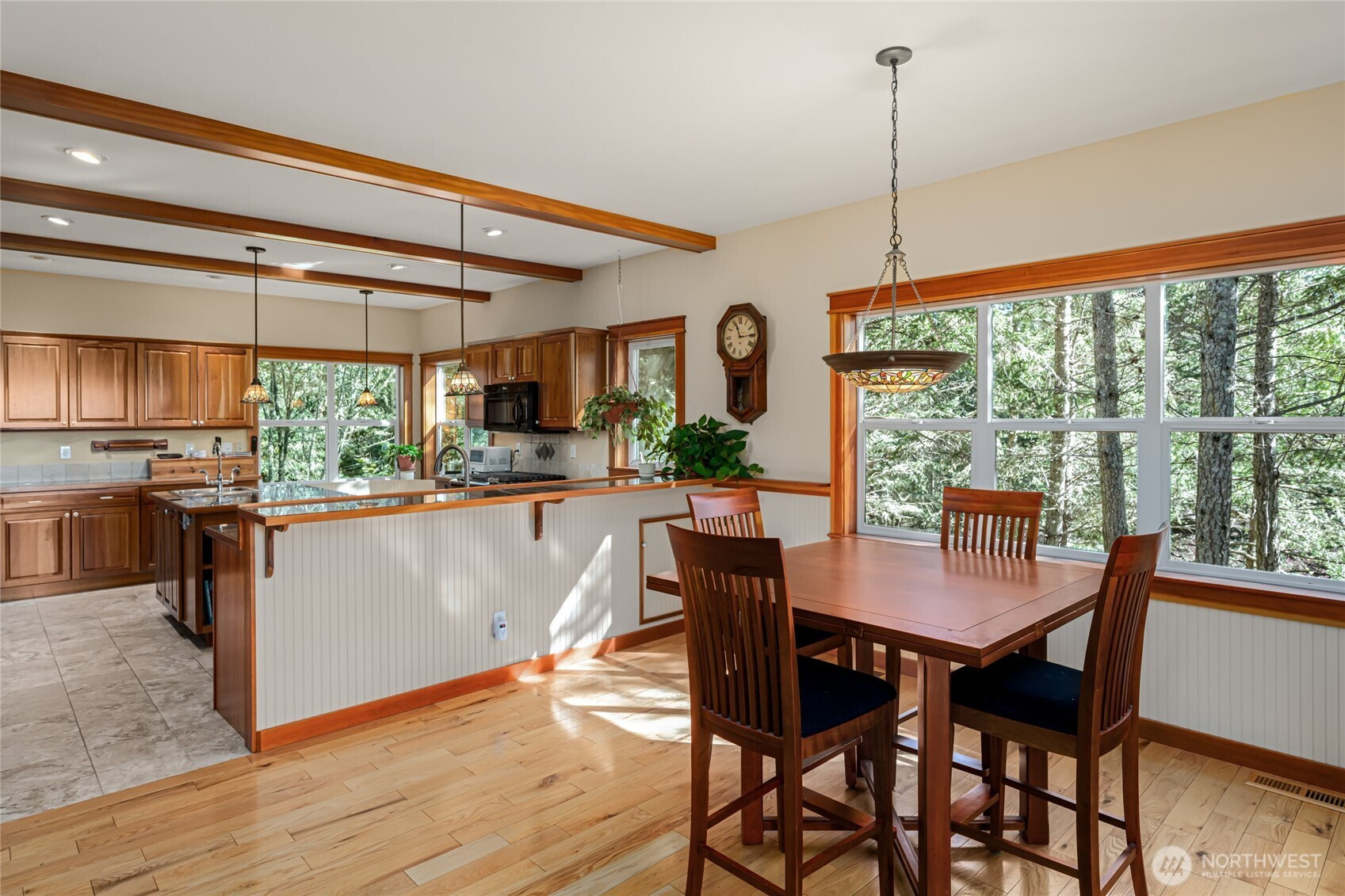 Designed for both comfort & connection to its surroundings, this 2,262sf Northwest home offers a thoughtful balance of function, warmth, & flexibility. A welcoming entry opens easily to the main living spaces & attached garage, creating a natural flow for everyday island living. The kitchen is both inviting & practical, with an eating bar & a charming breakfast nook framed by windows overlooking a quiet forest floor blanketed in green moss. From here, the home unfolds into the dining area & a sun-filled sitting room, all oriented toward the fenced garden. Upstairs, three bedrooms & two full baths are thoughtfully arranged. The primary suite enjoys a private balcony with distant views of Strait of Juan de Fuca & Olympic Mtns, dual closets including a walk-in & a soaking tub. Vaulted ceilings & expansive windows fill the main living area with natural light, while over 700 sq ft of decking & a covered front porch extend the living space outdoors. The wooded landscape offers a sense of privacy with minimal maintenance beyond the fenced garden. A greenhouse is nestled among mossy rock outcroppings & mature fir trees, offering a peaceful space for growing. A standout feature is the 1,008 sf detached barn with studio space, offering a full bath, loft, spacious open ground level & additional storage or workshop areas—well suited for a wide range of creative & practical uses. A distinctive San Juan Island property offering space to live, create & settle into the rhythm of island life.