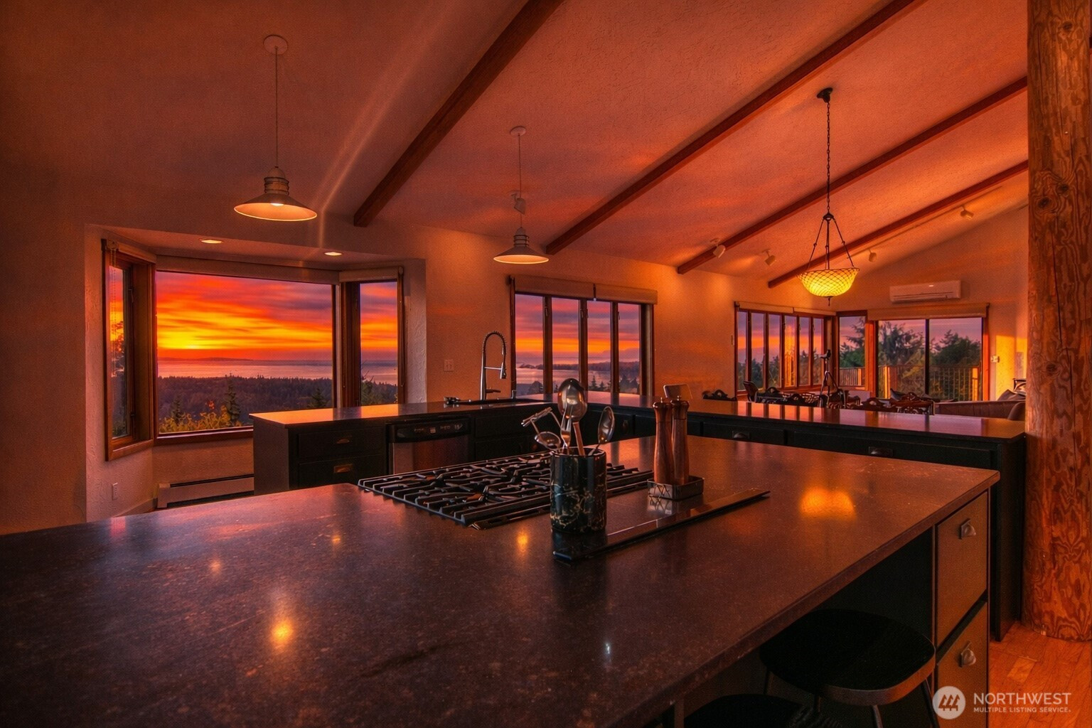 An iconic Orcas Island view property defined by sweeping southwest-facing vistas across the San Juan Channel to the distant shores of Vancouver Island. Nearly 3,500 sq ft of reimagined living space unfolds beneath soaring ceilings, anchored by a moody kitchen with soapstone counters that opens effortlessly to light-filled living areas and the horizon beyond. The main level offers two bedrooms, while the lower level provides exceptional flexibility seamlessly expanding to a four-bedroom home or functioning as a private guest suite complete with its own kitchen and living space. Multiple decks extend the living experience outdoors, where evenings are framed by some of the most extraordinary sunsets in the San Juan Islands.
