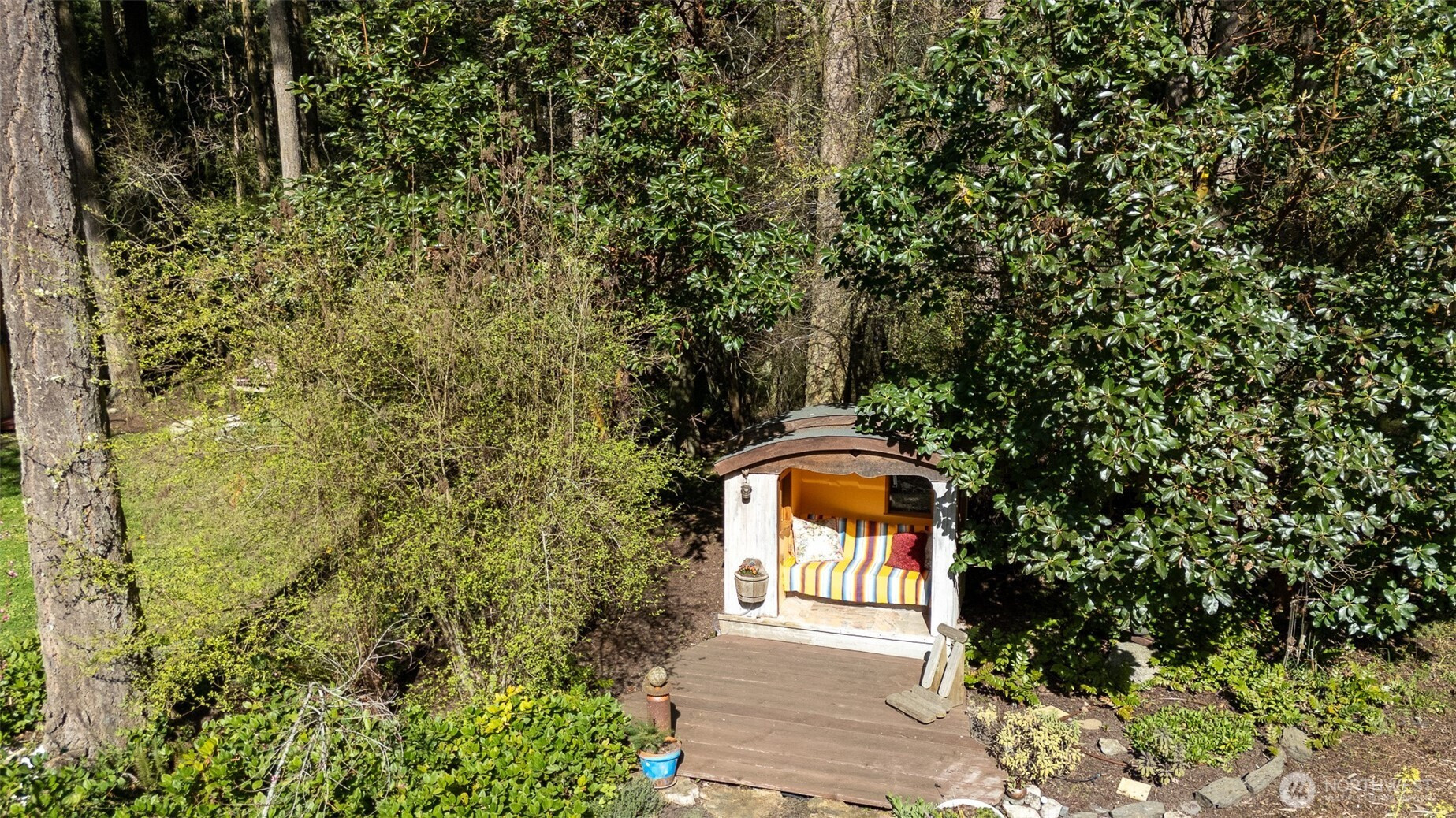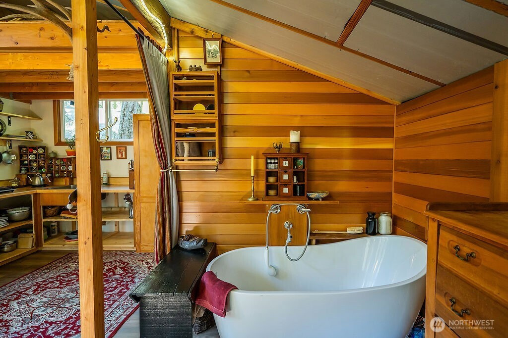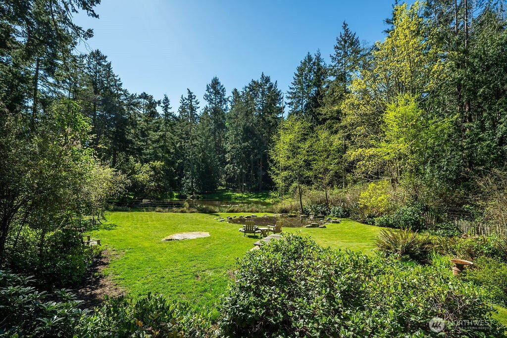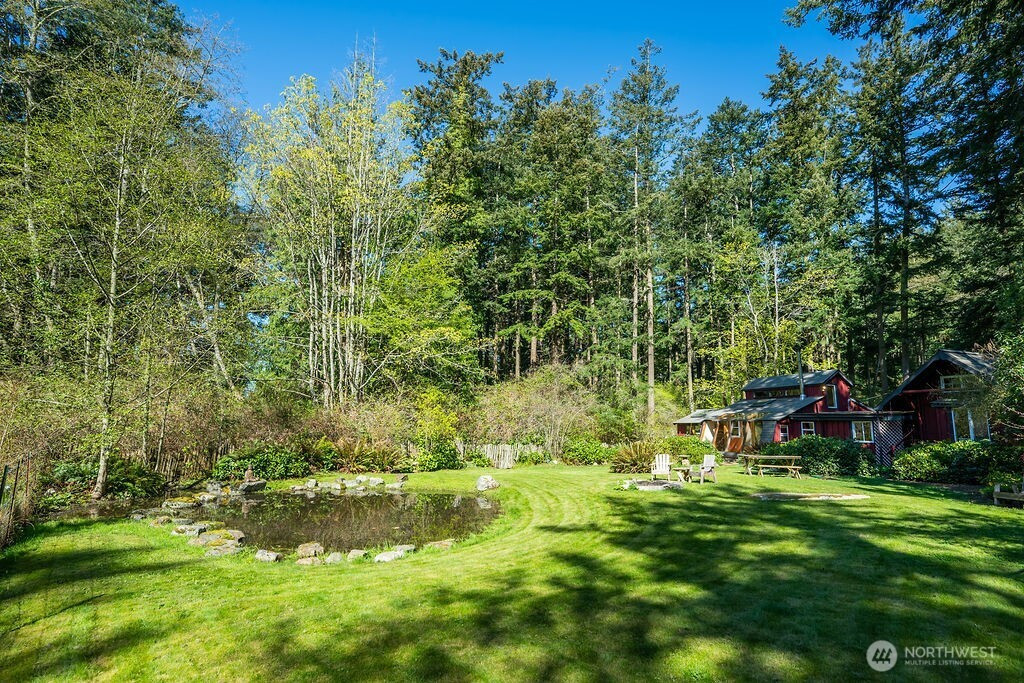 Rustic and rooted in island culture, this sweet little property sits on half an acre of peaceful land on Lopez Island's south end. Originally built as a hunting cabin, the main building has evolved into an inviting and cozy home with an open living/kitchen area warmed by an enormous wood stove, two bedrooms, a full bathroom, an attached greenhouse, and a laundry room. Retreat into the hand-built studio, aka "the coop," to work or just idle the time away in the quiet, light-filled space tucked amongst towering Douglas firs. Soak up the afternoon sun and the solace of nature in the meditation hut, which looks out over irrigated garden beds and a lovely pond. The sunny clearing by the pond has been the site of many joyful gatherings, and you will never be short of birds and woodland visitors who also appreciate this half-wild, half-cultivated haven. Completely private and enclosed on the north/street side by hand-hewn clapboards made from salvaged, island grown cedar and fir logs, and fully fenced along the boundary shared with the neighboring farm. Cold plunge alcove, composting toilet situated in an outbuilding near the coop studio, sheltered sitting and storage areas, large fire pit, buried erratic boulder near pond, older growth trees, and more. Conveniently located near Watmough Bay beach, many hiking trails, and Islandale Grocery and Restaurant. Two bedroom septic, private well, propane heating/cooling unit in main house in addition to wood stove, no HOA.