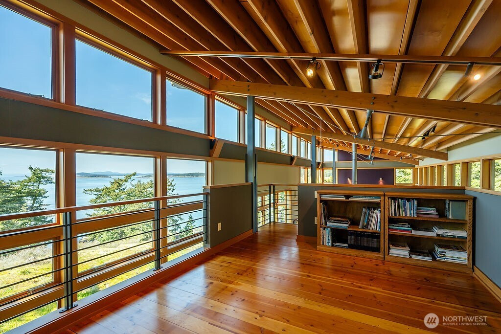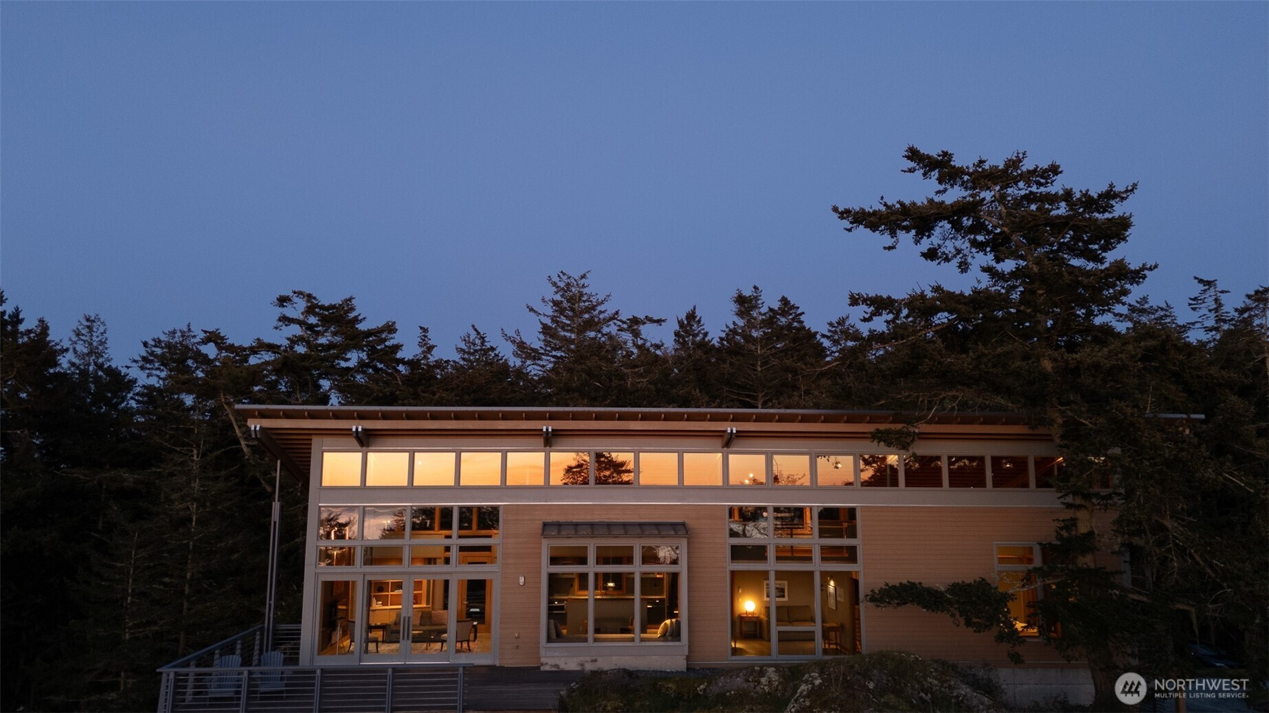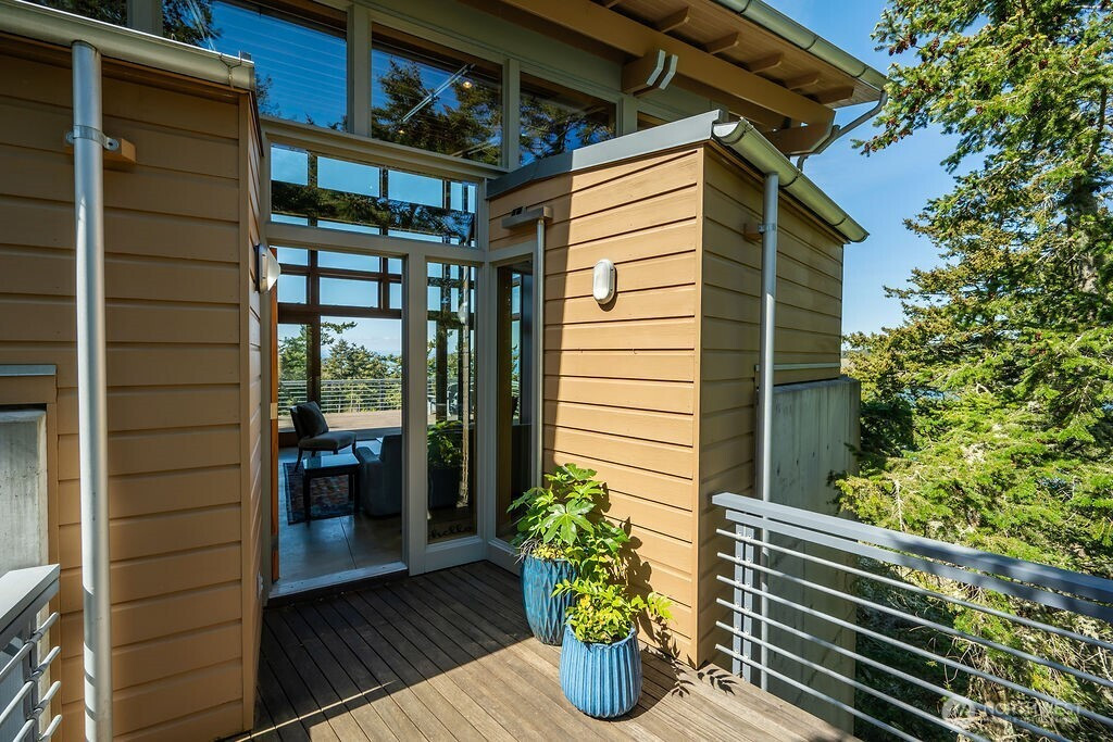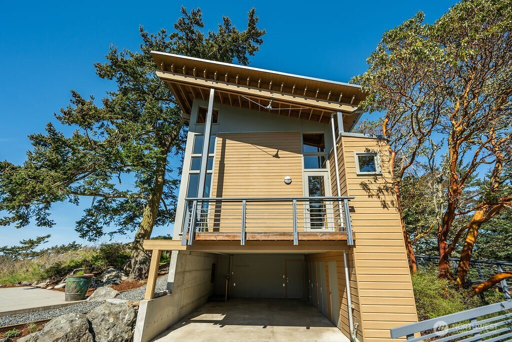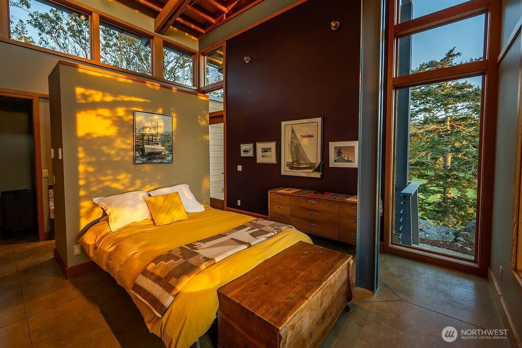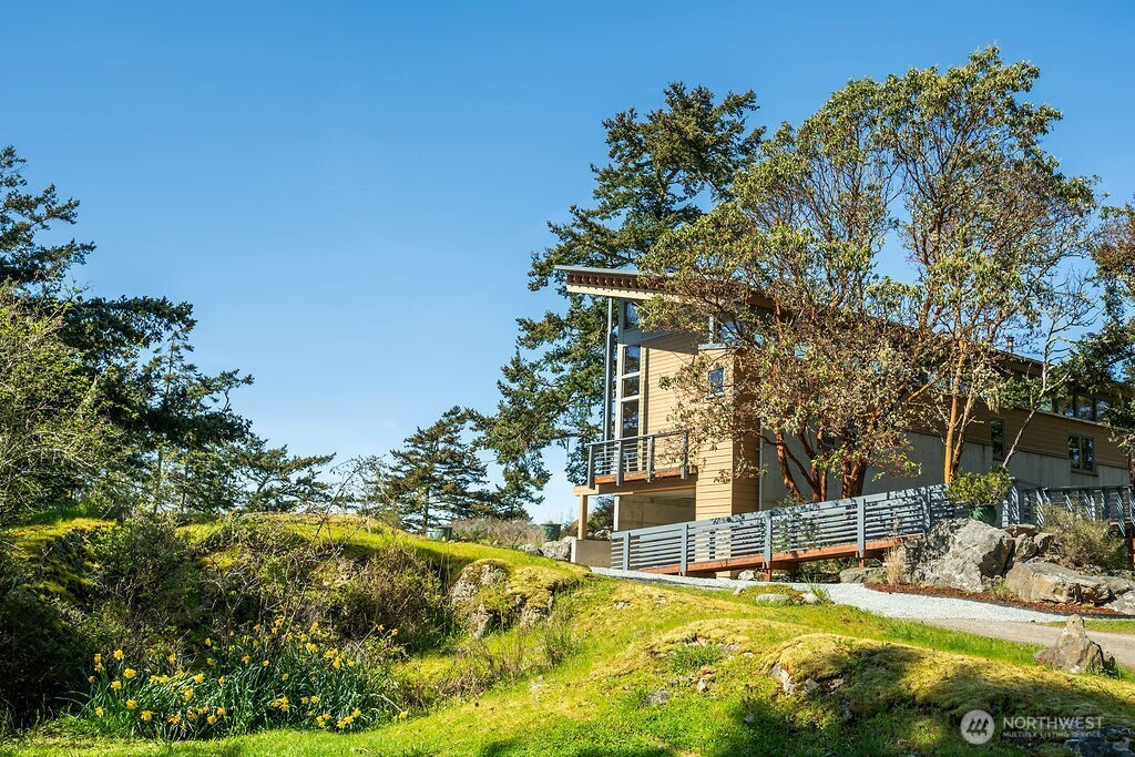 Anchored atop a rocky bluff sits a striking modern home with views of Lopez Island's Outer Bay, islands near and far, and the ever-changing waters of the Salish Sea. Stroll up the elevated ramp traversing a ravine and step into an airy space offering dramatic seascapes from every room. The home, designed by The Miller Hull Partnership with Patrick Byrne as lead, was conceived as a single open space that flows between public and private areas and transitions with simplicity into a quintessential San Juan landscape of mossy rocks surrounded by fir and madrone trees. The west-facing wall of windows brings natural light into every corner of the home, while the exposed wooden roof framing and fir trim soften the drama of the custom steel inverted king post trusses and concrete floors. The main bedroom has a private deck and a full bathroom. The second room on the main floor can be cleverly enclosed by pocket doors and is situated by a 3/4 bathroom, while the loft serves many purposes. Wolf, Viking, Sub-Zero, and Miele appliances outfit the kitchen, and a utility area is efficiently tucked into the back hallway. The garage contains ample storage closets and a mechanical room with a work space. Radiant heat, metal roof, ipe decks. A rustic A-frame cabin below the main house provides a perfect guest suite or studio and a second, wooded tax parcel is also included. The property is just a stone's throw of Iceberg Point trails, Agate Beach, and minutes from other south end attractions.