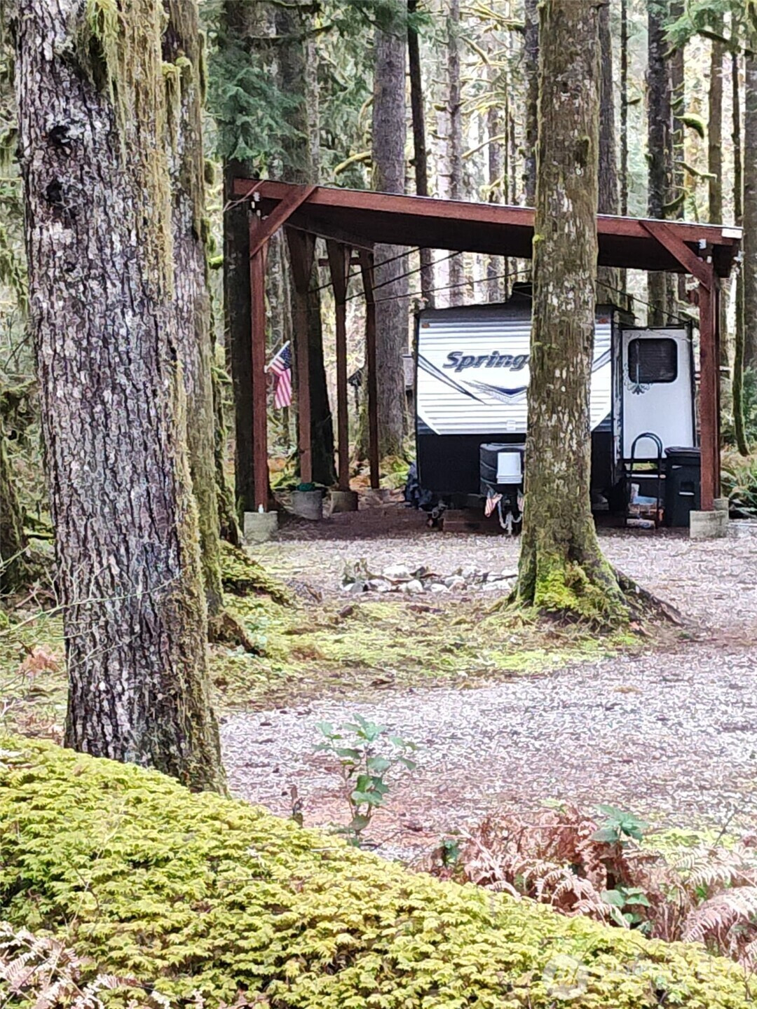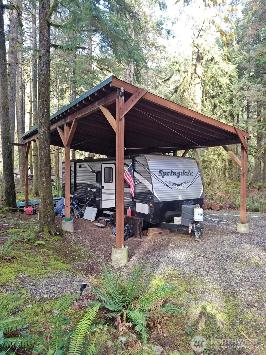 MORE PICTURES TO COME! Prime double lot (.48 acres) with large, pitched 20' wide x 40' long. High pitch 16' down to 12' metal roof cover protecting the Arctic packaged 2017 37' Keystone (Springdale Model) travel trailer with slide out & sleeps 10. New in 2025: stereo/dvd player, hot water heater, thermostat with air conditioning, and microwave. The oven has never been used. Trailer is very clean, well-maintained and turn-key. Directly across the street from the Cascade River, it's perfect for relaxing, fishing, enjoying nature and just the perfect vacation spot to get away from the hustle and bustle of life. Heated bathrooms, community park and beach are conveniently located down the street about 100 yards away. SO MUCH VALUE! Generator stays and batteries are brand new! ($600 value) Extra (150') drinking hoses, some tools, and CAMCO RHINO HD 28-gallon portable RV waste holding tank with hoses and all accessories with gauge. There's so much room for guests, tents/trailers, and firepit to gather around. Looking for your vacation retreat or year-round living? You have found it here in the foothills of the Cascades. Stunning!