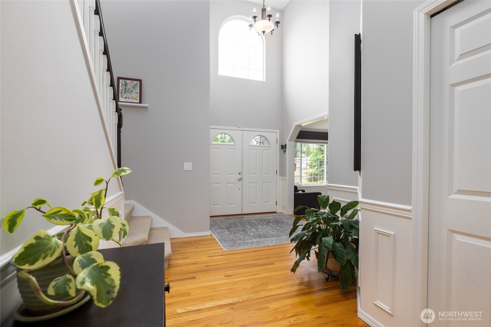 A brilliant grand entry sets the stage for this beautifully appointed home, showcasing rich hardwood floors, classic floor plan with formal living and dining rooms, enhanced by elegant wainscoting and crown molding. Updated modern kitchen is a true centerpiece, featuring stainless steel appliances, gas range, granite countertops, full tile backsplash, large cook island, abundant cabinetry and generous double door pantry. Sunny breakfast area opens seamlessly to the expansive family room with soaring ceilings, walls of windows, and a cozy gas fireplace, perfect for everyday living and entertaining. Thoughtfully designed main level provides a guest bedroom, private office/den, and convenient powder room. Upstairs discover an expansive primary suite offering a relaxing retreat with large walk-in closet, wonderful five-piece ensuite with dual vanity, soaking tub, and walk-in shower. Two additional guest bedrooms and a full guest bath complete the upper level. Enjoy year-round outdoor living on the impressive full length 1/2 covered back deck, overlooking mature landscaping, with garden areas and a protected greenbelt. Additional highlights include central A/C and excellent three-car garage. Fantastic location with easy access to I-5, close to medical services, shopping, city parks, hiking and biking trails, and historic downtown.