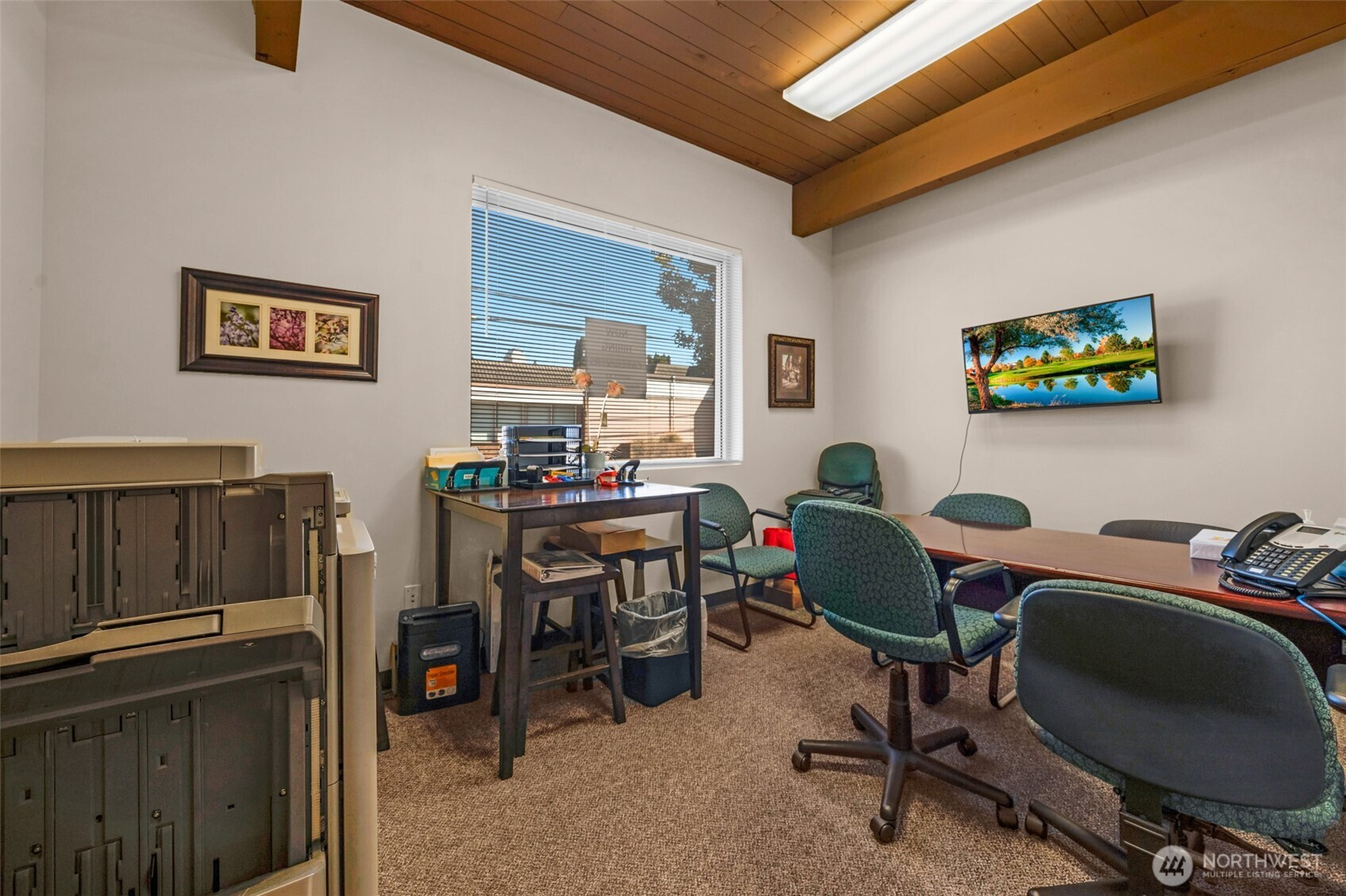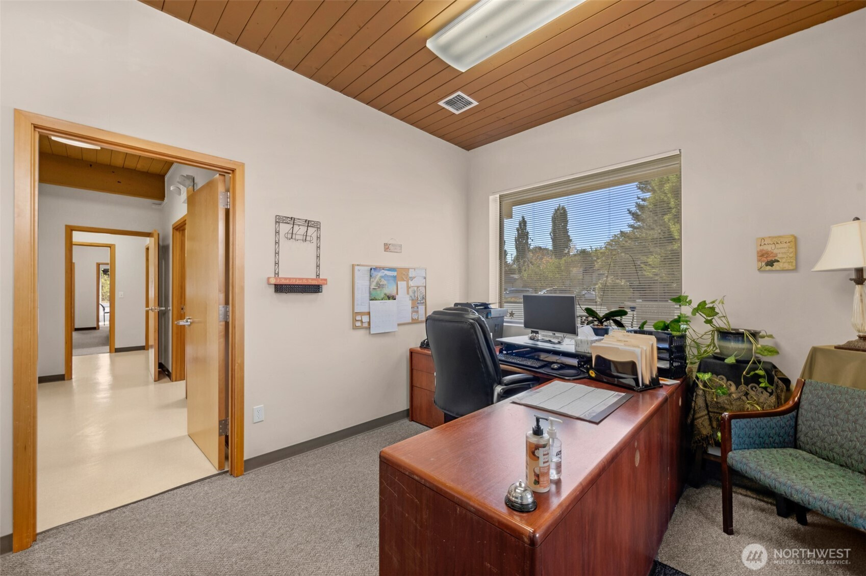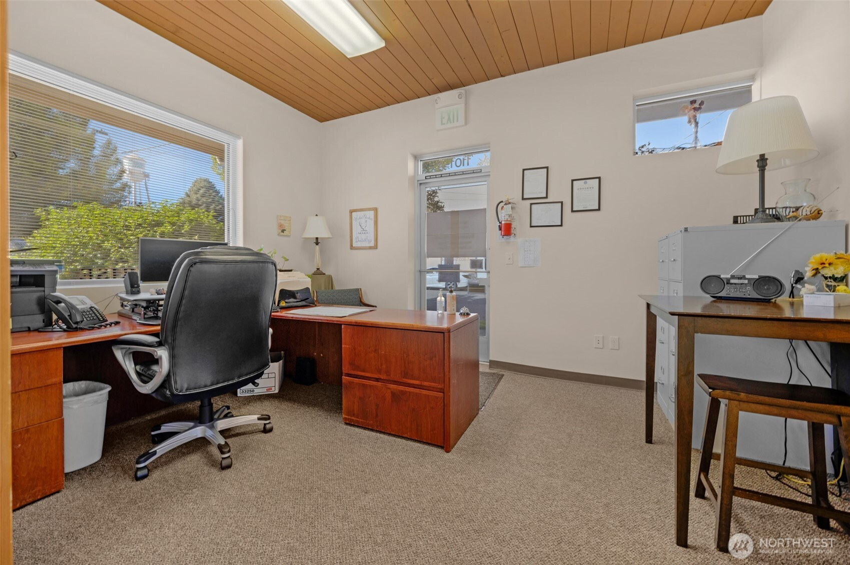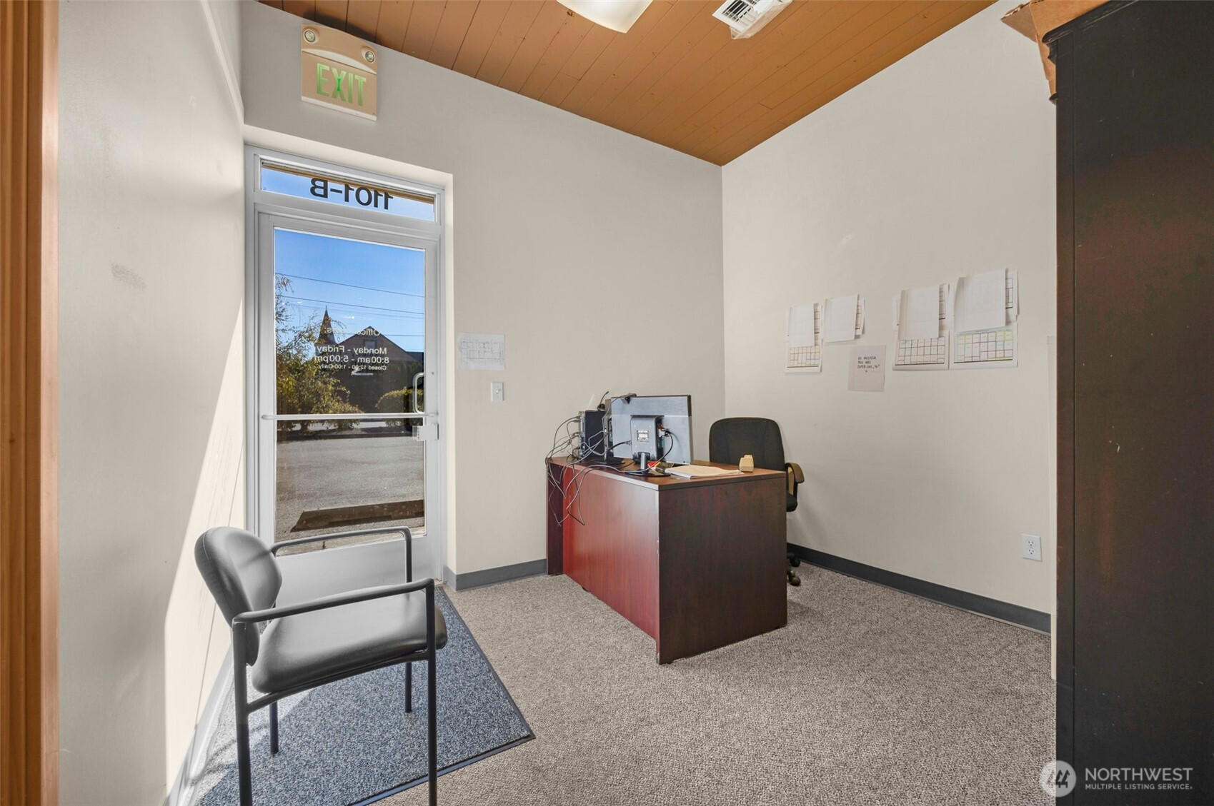 Two office spaces in one prime location! This low-maintenance, one-story building features 1,612 sq. ft, high ceilings, large windows & abundant natural light. Flexible zoning and a versatile layout make it ideal for a wide range of businesses—operate in one suite and rent the other. Currently divided into two units: Suite A offers an exterior entrance, 2 offices, a bathroom, conference room, storage, and shared kitchen. Suite B is larger with 2 exterior entrances, 3 offices, lobby, conference room, bathroom, storage, and shared kitchen. Located in DT Mount Vernon, it boasts 128 ft of street frontage, strong visibility, walkable amenities, a metal roof, A/C, and a large level parking lot with 3 access points. An incredible opportunity!