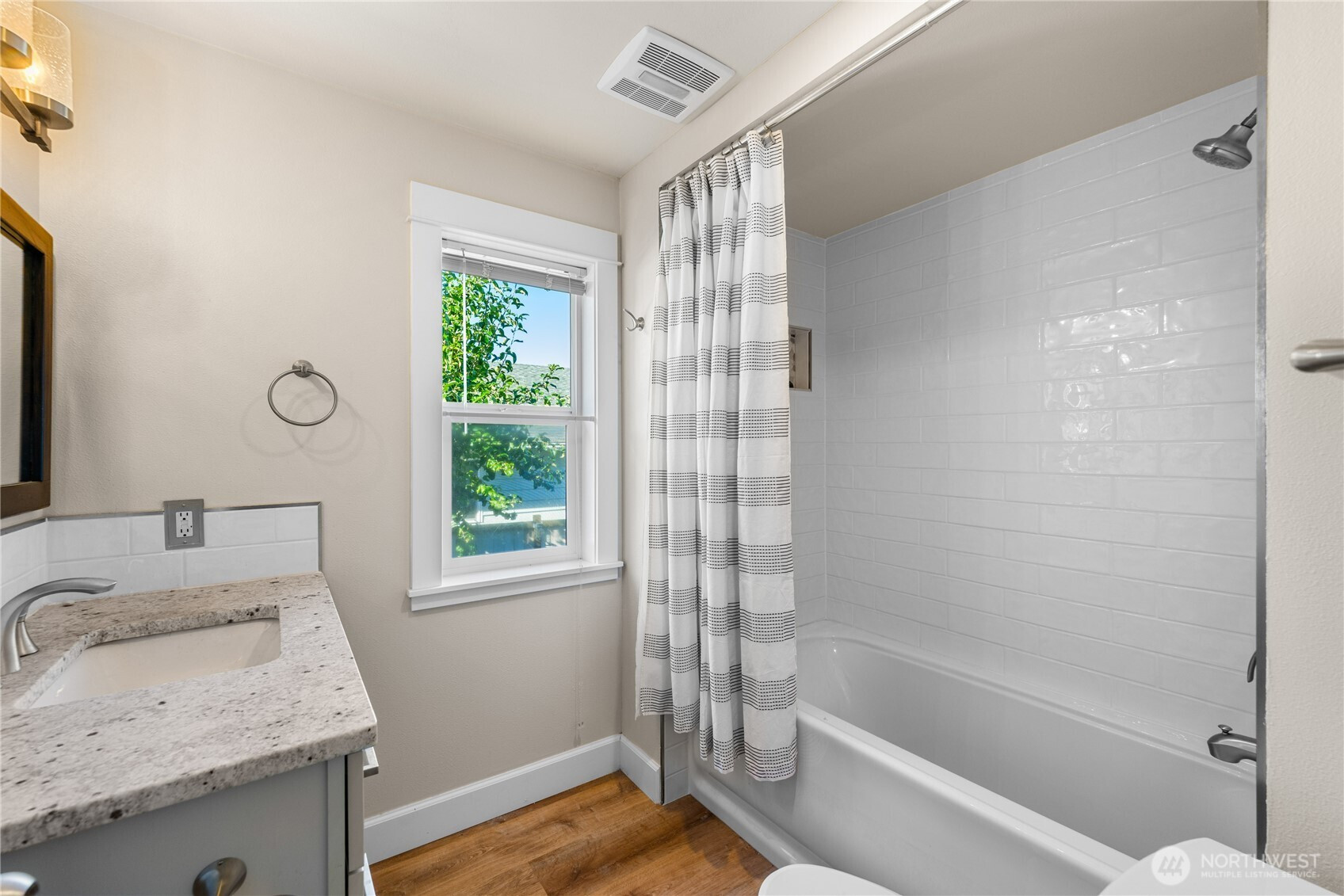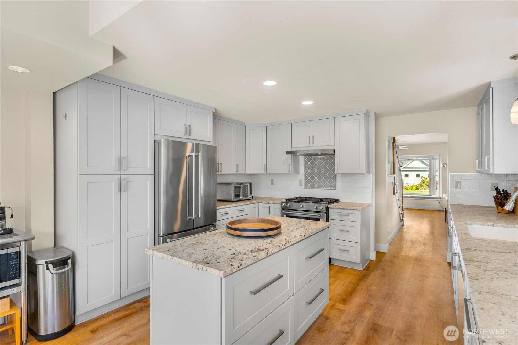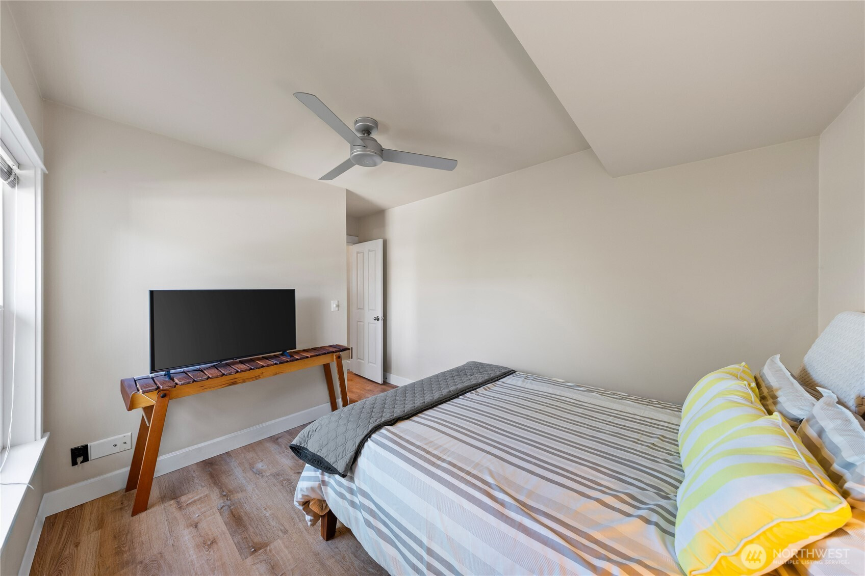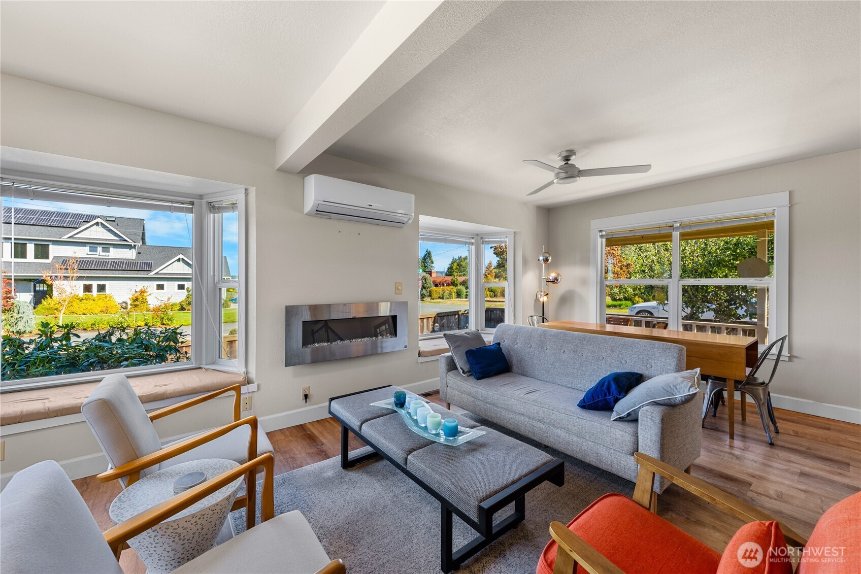 Enjoy incredible water views from this 3 bed & 2.5 bath Old Town home set on a spacious corner lot with room for an ADU. The main floor offers a bright living area with built-in seating and a work nook, plus a stylish kitchen with stainless appliances, granite counters, and island dining. The primary suite with walk-in closet and full bath is conveniently on the main level, while two bedrooms sit upstairs. A finished basement adds versatility with a full bath, laundry, storage, and space for a gym, office, or media room. Outdoor patios and deck space provide multiple spots to relax and take in the views. Two-car garage, mudroom entry, and off-street parking add comfort and convenience.