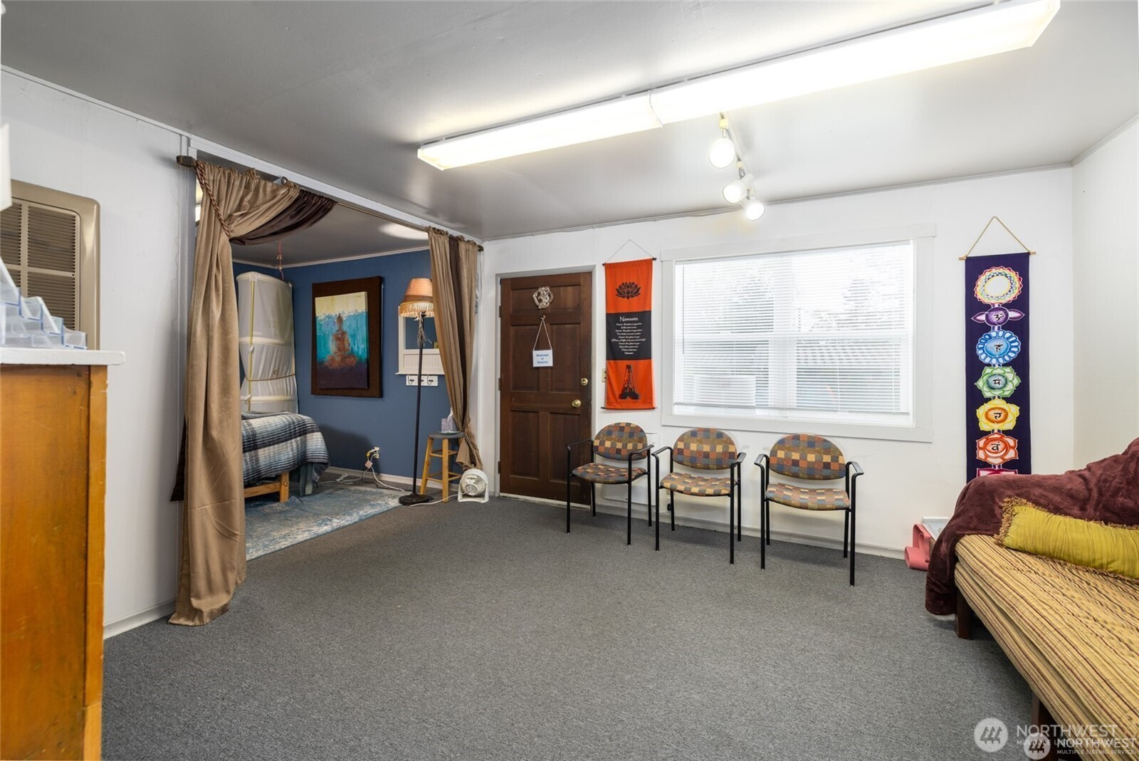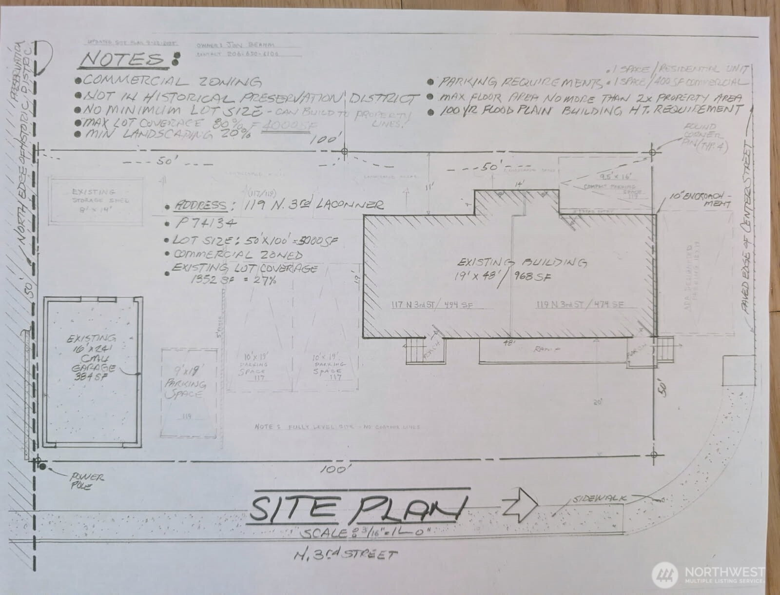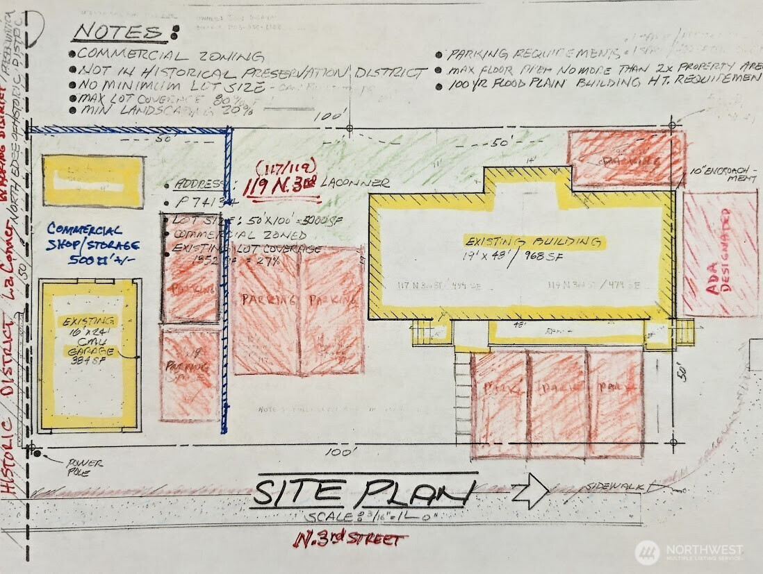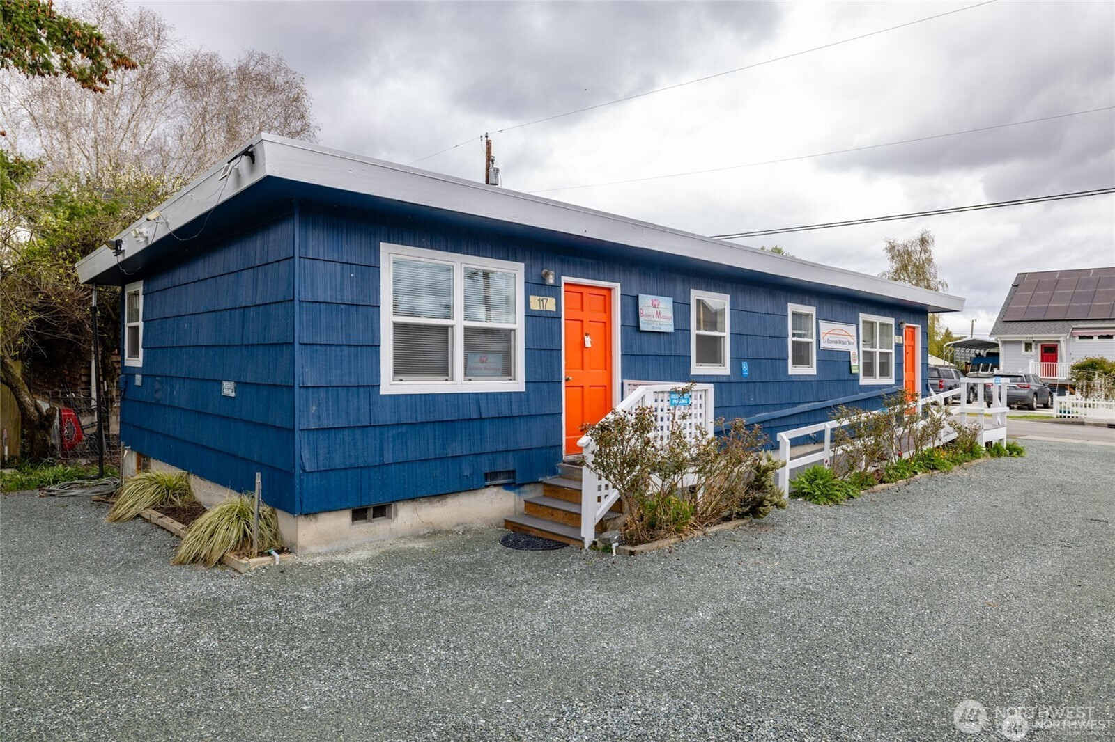 Downtown La Conner Business Opportunity: Prime location on edge of Downtown La Conner Historic Zone. Rare corner lot with off street parking just off Morris Street/ La Conner Historic District on 3rd St drive to La Conner Marina. Prime walking area +close to Public Restrooms. Presently 2 units + Commercial Gar/Storage. VACANT North Unit AVAILABLE, appx 500 sq-ft @ $995-per month. Possible to lease full building at $1850.00 per month NN. Originally built 1960 restaurant, 1979 moved onto site. Can be opened up with tenant improvements into single business opportunity such as coffee, bakery, retail or professional office space. Open 5 car parking front +plus 1 behind. SOUTH END Garage/Storage AVAILABLE SEPARATELY as 500 sq-ft +Business vehicle parking (has electric panel & lighting) or as full lot package. See Plot Plan drawing and SEE FLYER PLEASE. NO SIGN 119 - don't disturb 117 Massage tenant please.