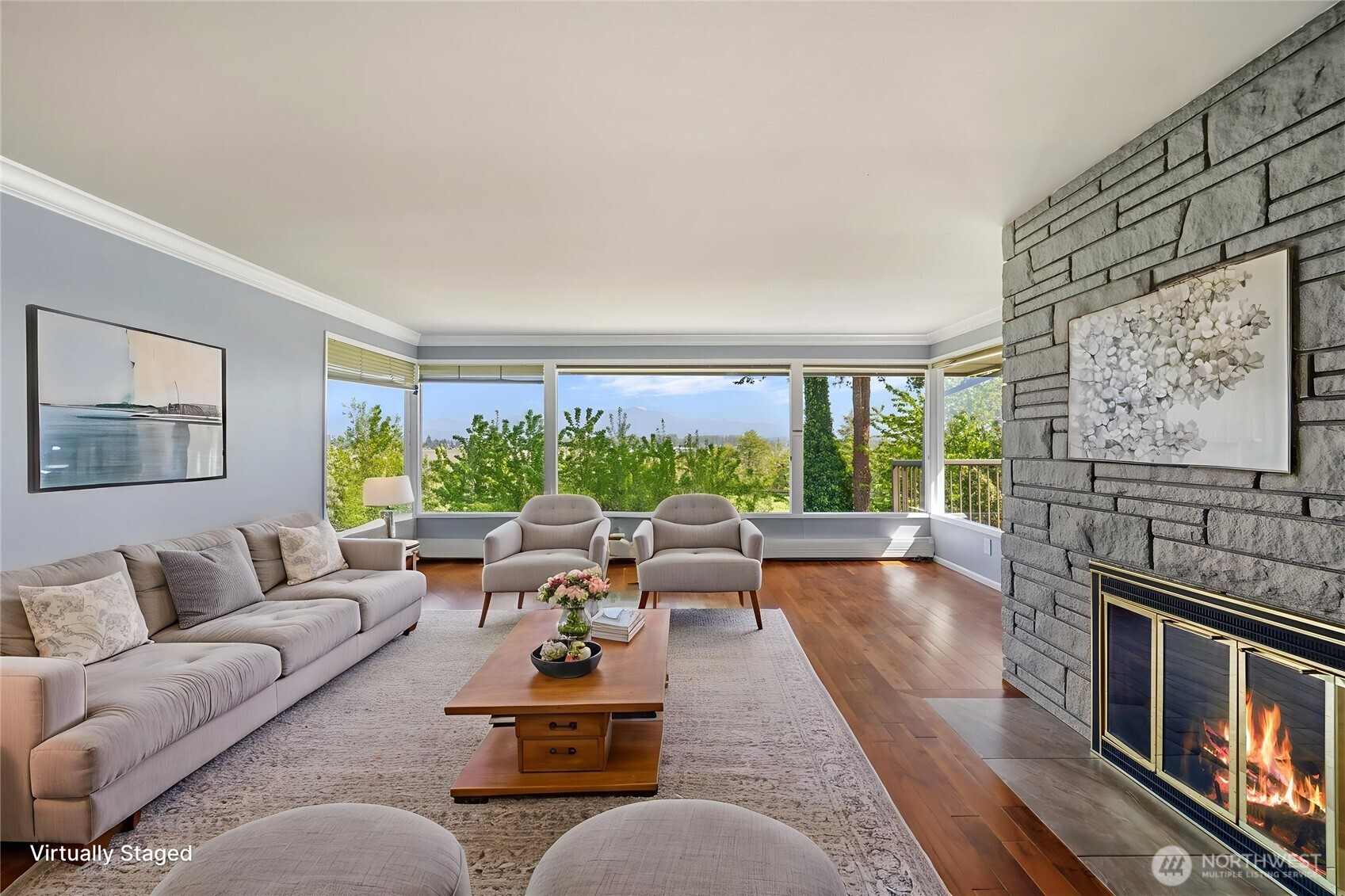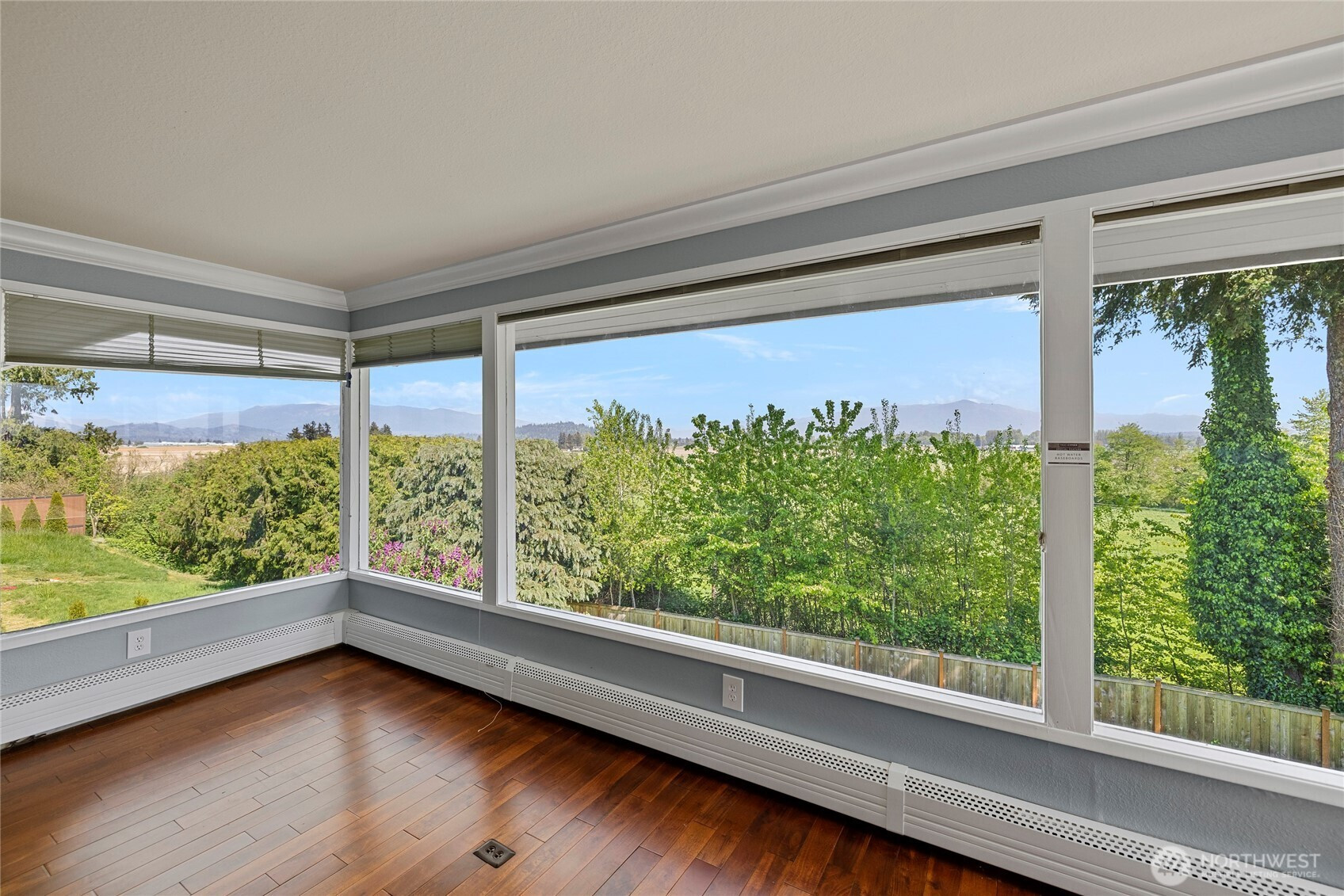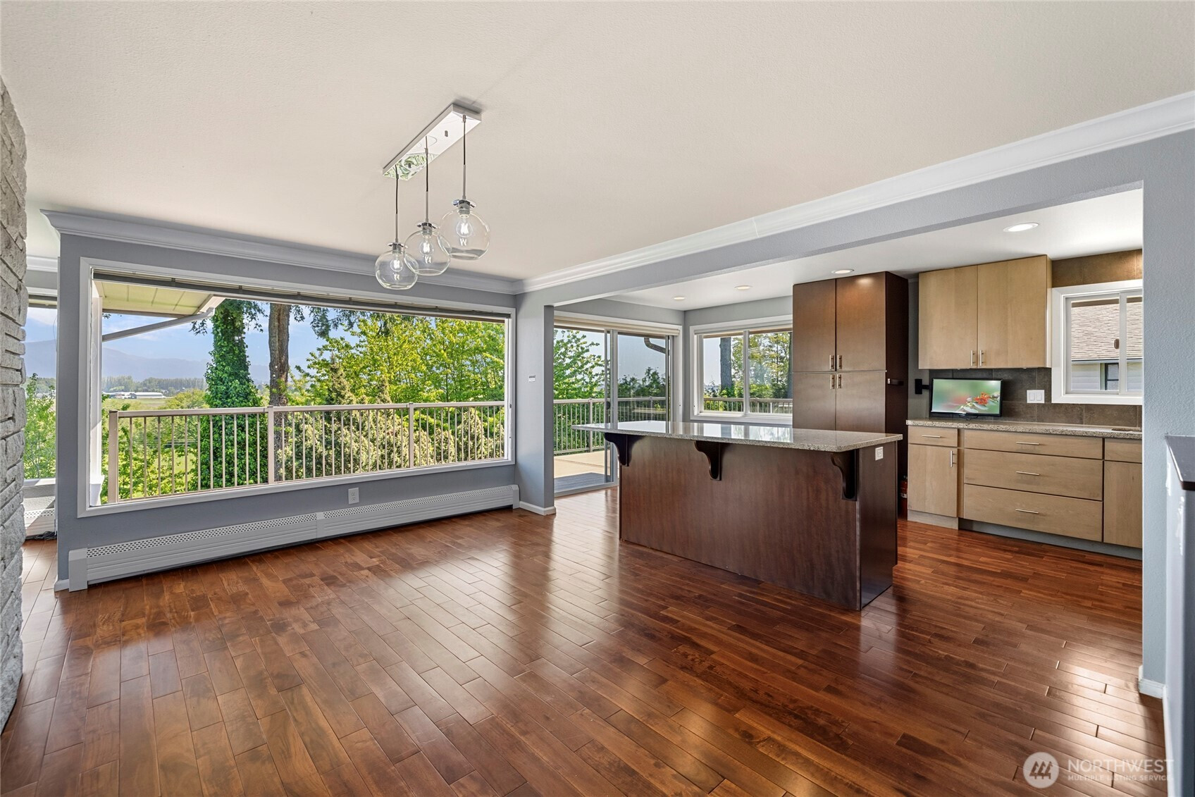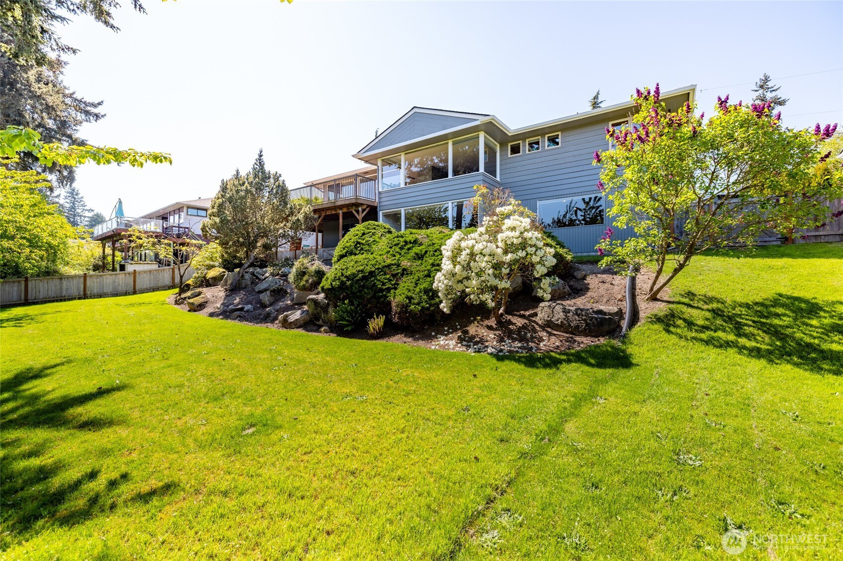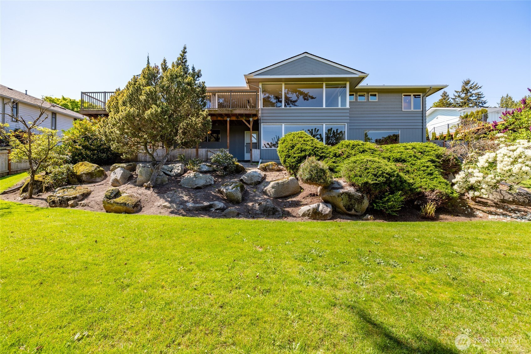 Step inside this captivating mid-century home with its cool, distinctive curb appeal and subtle NW-inspired landscaping that sets it apart from the ordinary. A welcoming 2-car carport leads to the front door, where an open-concept kitchen, living, and dining area greets you with warmth and style. A massive stone fireplace anchors the spacious main living area, while expansive windows frame breathtaking valley and mountain views. Hardwood floors flow throughout, enhancing the light-filled, airy feel. The kitchen showcases a lovely mid-century aesthetic, seamlessly opening to a large deck—perfect for dining al fresco while soaking in the scenic panorama and overlooking the expansive fenced yard. On the main level, the cozy primary bedroom offers an ensuite bathroom featuring a walk-in tiled shower, soothing soaker tub, double vanity, and generous walk-in closet. Two additional bedrooms and a full hall bathroom complete this level, providing comfort and convenience for guests. Downstairs, the daylight basement reveals versatile living space: a 4th bedroom/office, a huge bonus room, a finished flex room, laundry, and abundant closet/storage options. Walk-out access to the backyard makes indoor-outdoor living effortless.Nestled near the prestigious Skagit Golf and Country Club with no HOA, this home delivers peaceful living with excellent commuting access in all directions. Ideal for those seeking character, views, space, & flexibility in a prime location.