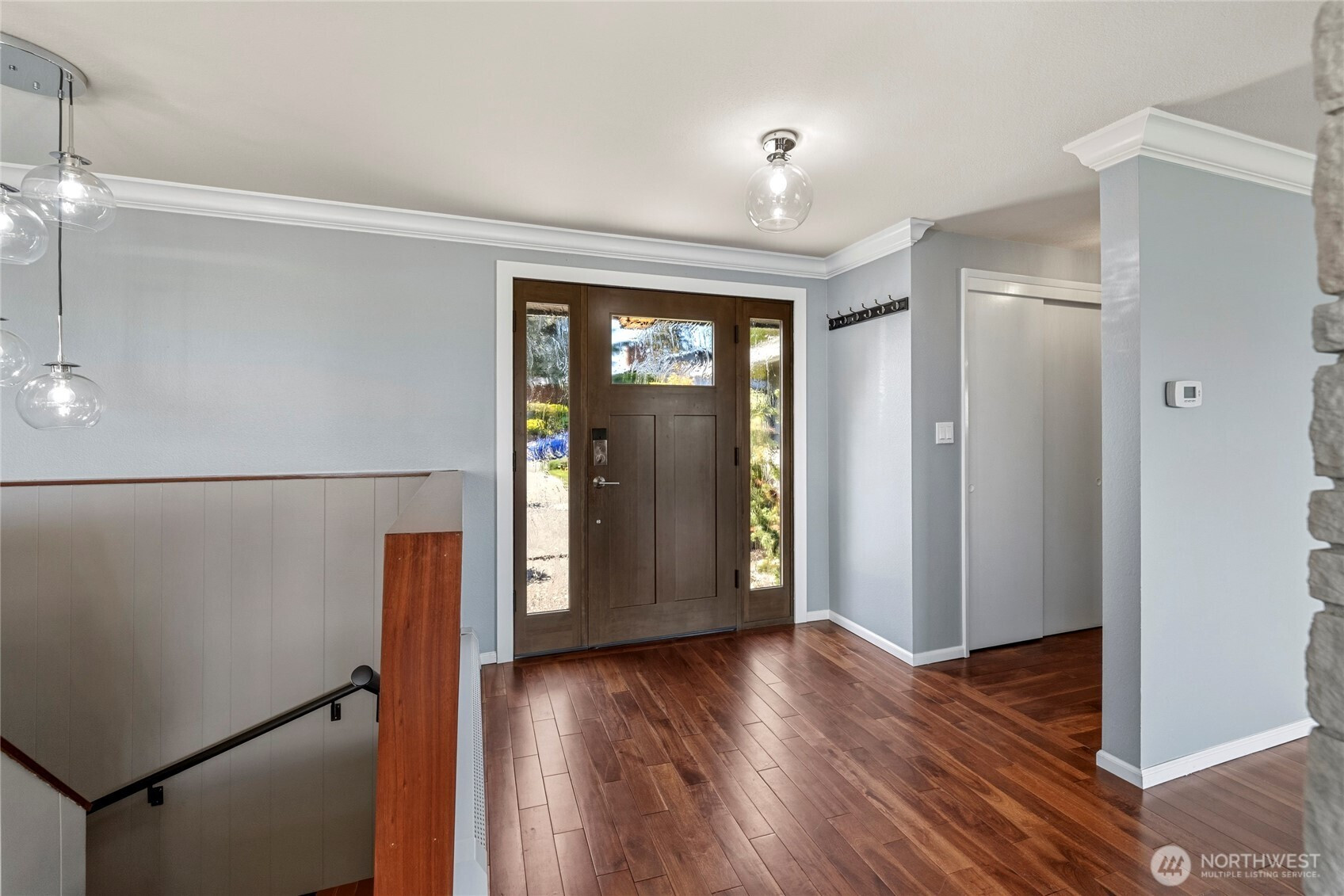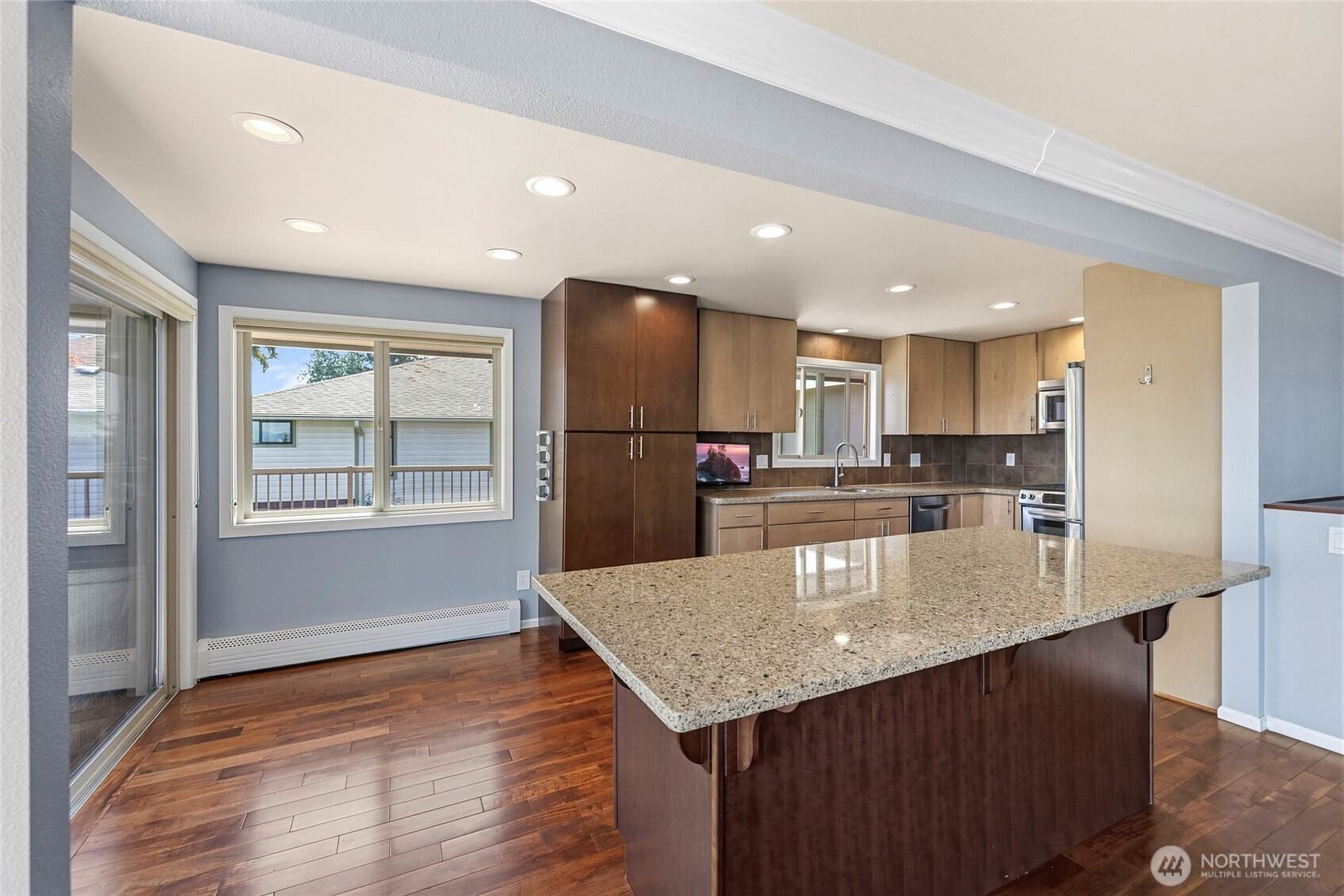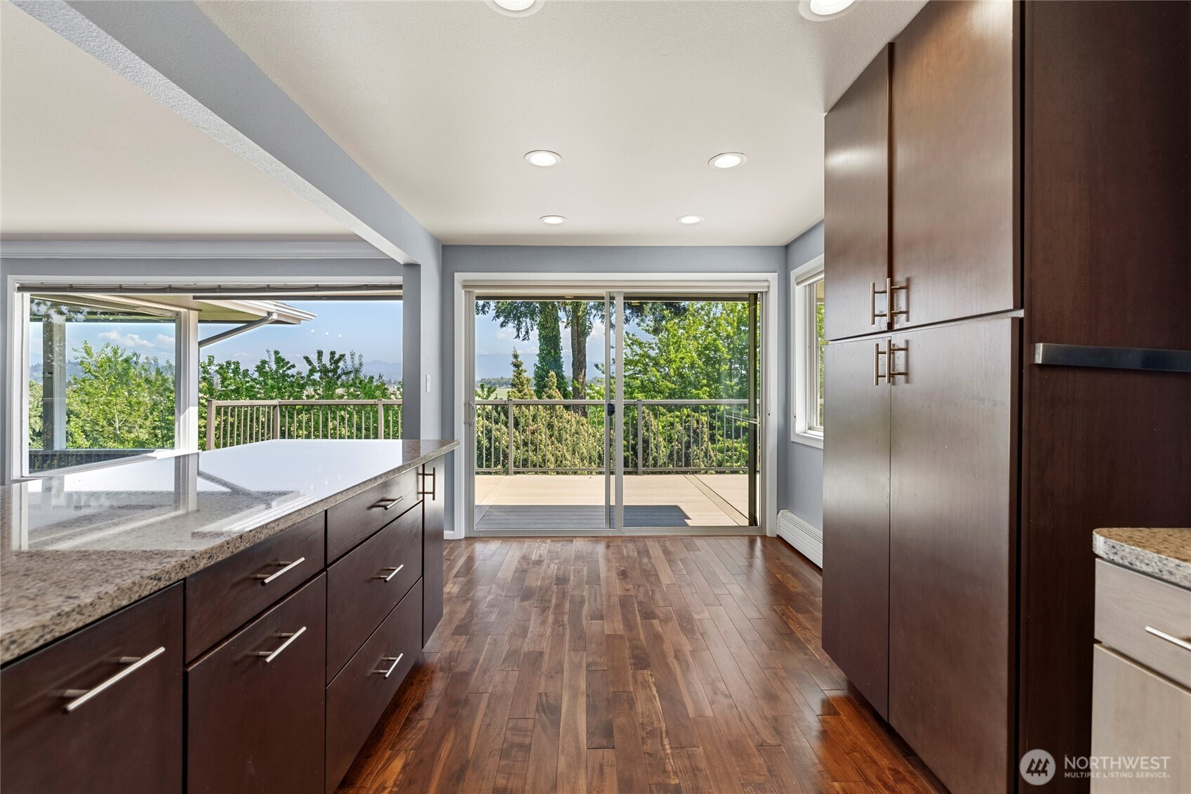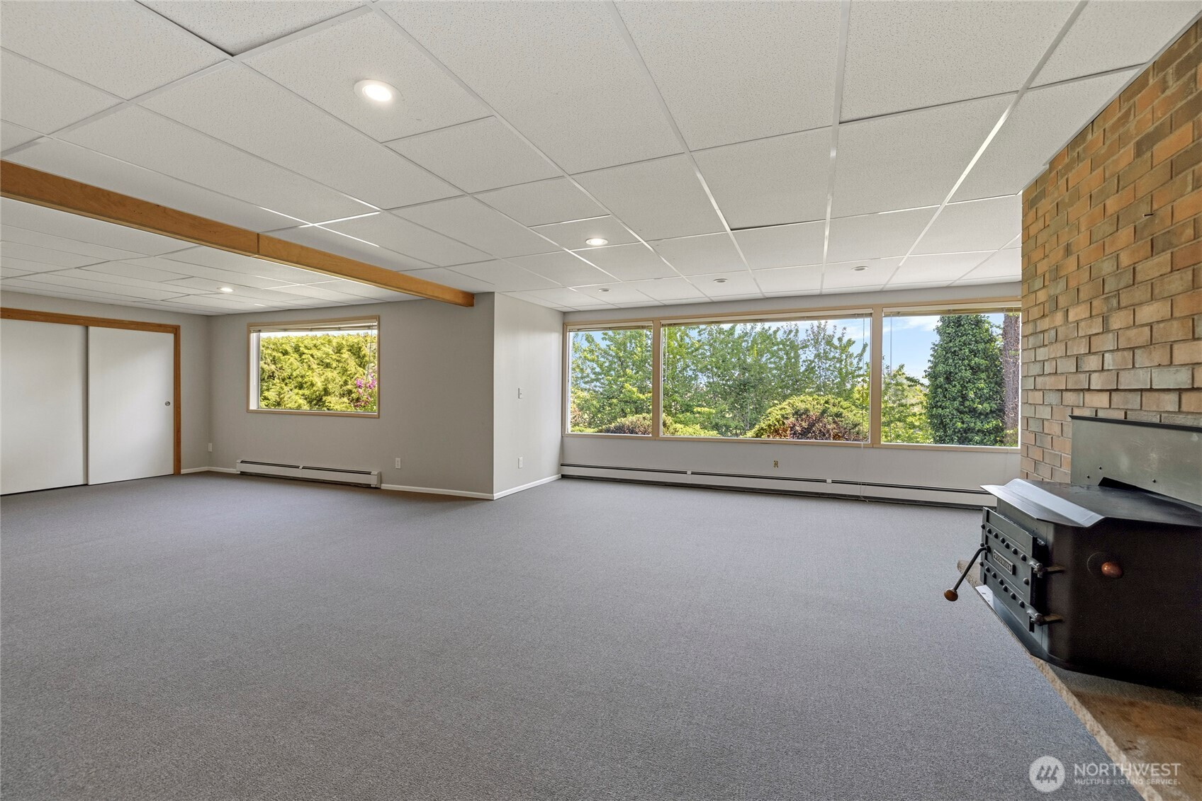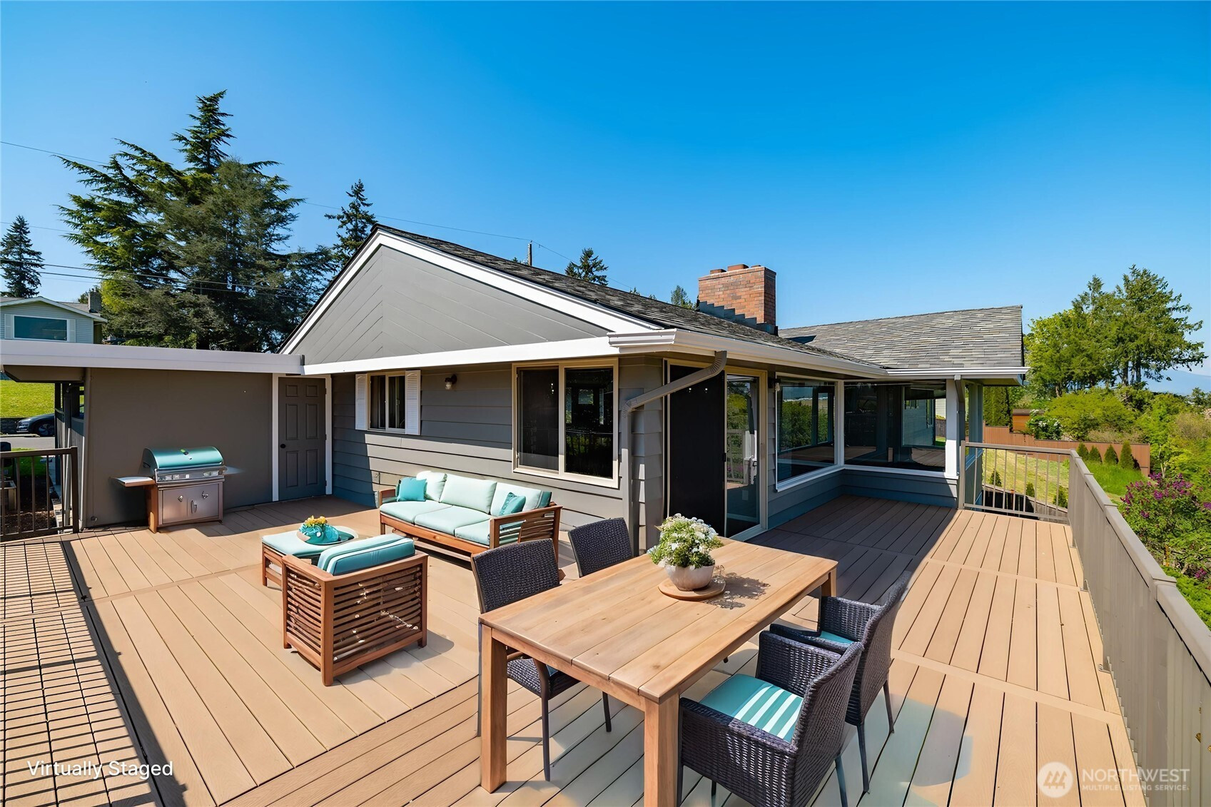 Step inside this captivating mid-century home with its cool, distinctive curb appeal and subtle NW-inspired landscaping that sets it apart from the ordinary. A welcoming 2-car carport leads to the front door, where an open-concept kitchen, living, and dining area greets you with warmth and style. A massive stone fireplace anchors the spacious main living area, while expansive windows frame breathtaking valley and mountain views. Hardwood floors flow throughout, enhancing the light-filled, airy feel. The kitchen showcases a lovely mid-century aesthetic, seamlessly opening to a large deck—perfect for dining al fresco while soaking in the scenic panorama and overlooking the expansive fenced yard. On the main level, the cozy primary bedroom offers an ensuite bathroom featuring a walk-in tiled shower, soothing soaker tub, double vanity, and generous walk-in closet. Two additional bedrooms and a full hall bathroom complete this level, providing comfort and convenience for guests. Downstairs, the daylight basement reveals versatile living space: a 4th bedroom/office, a huge bonus room, a finished flex room, laundry, and abundant closet/storage options. Walk-out access to the backyard makes indoor-outdoor living effortless.Nestled near the prestigious Skagit Golf and Country Club with no HOA, this home delivers peaceful living with excellent commuting access in all directions. Ideal for those seeking character, views, space, & flexibility in a prime location.