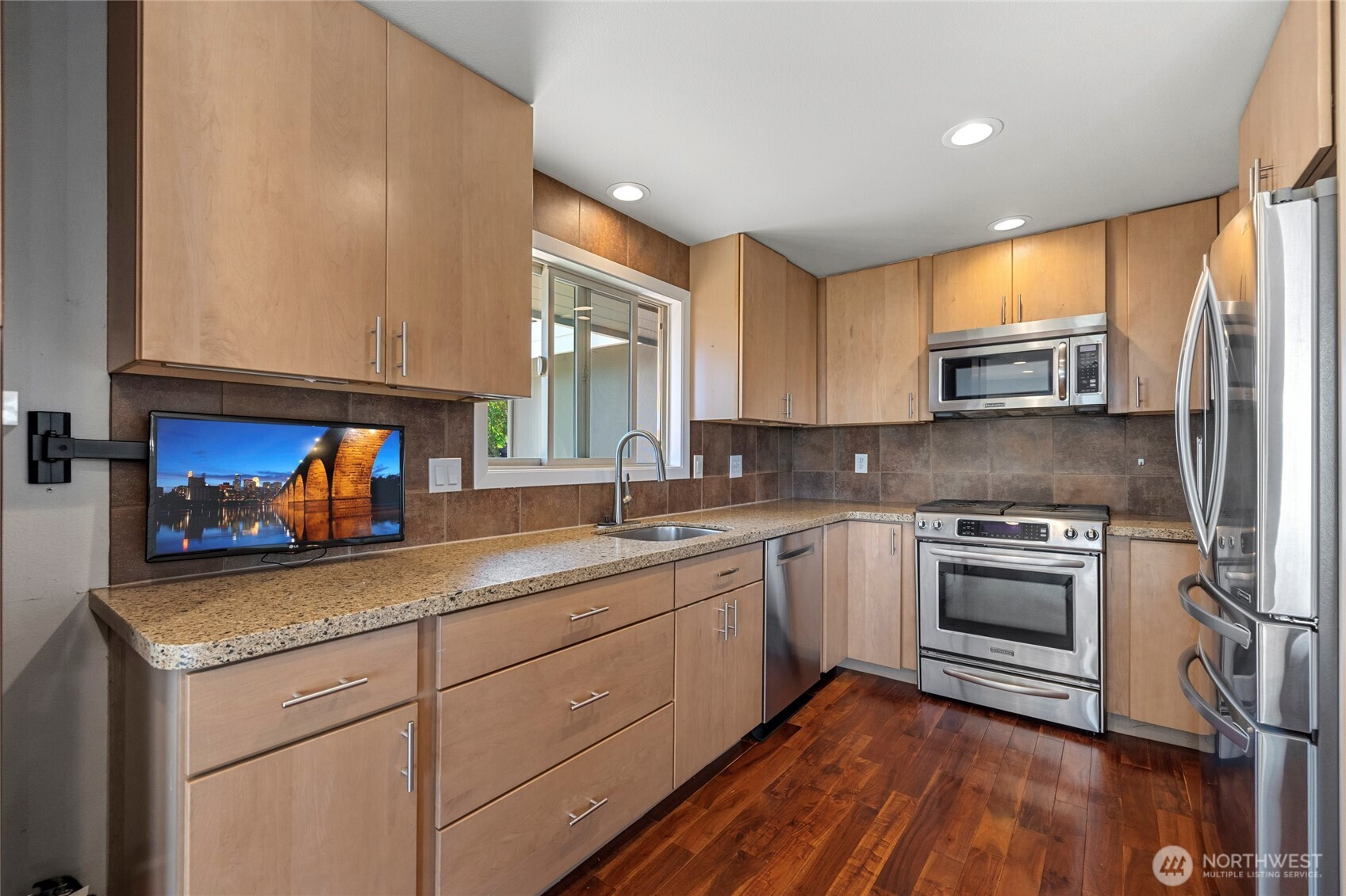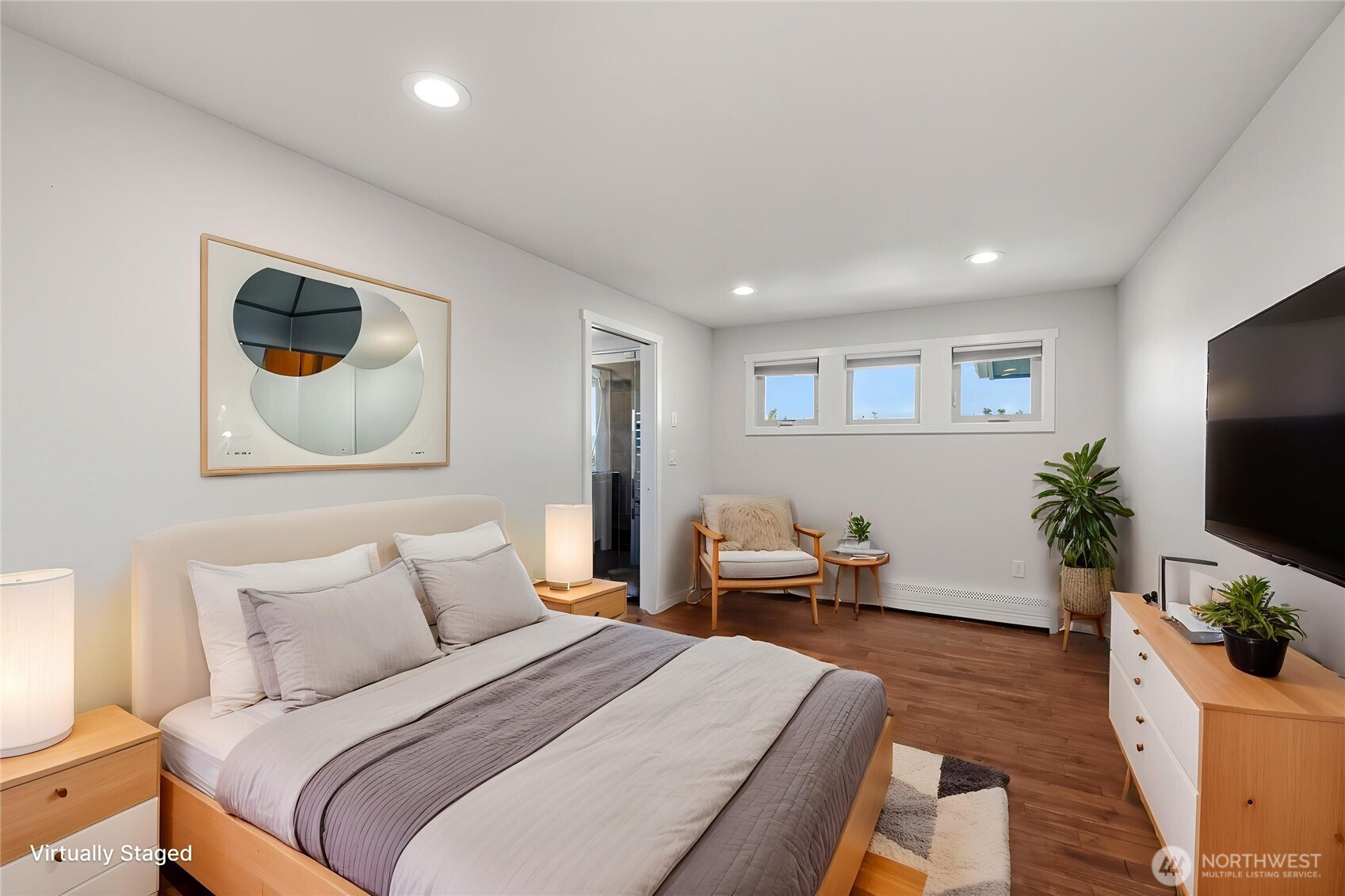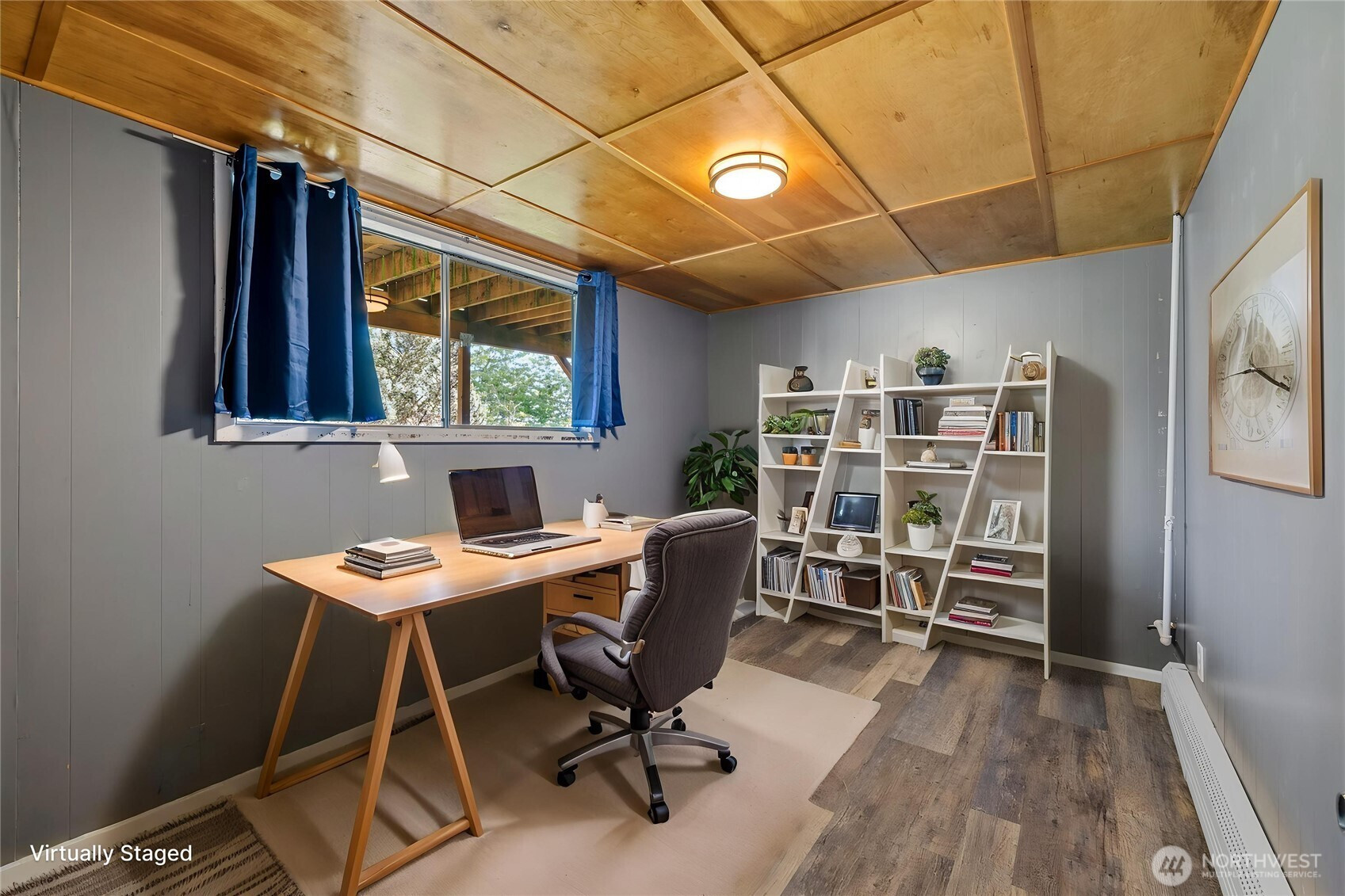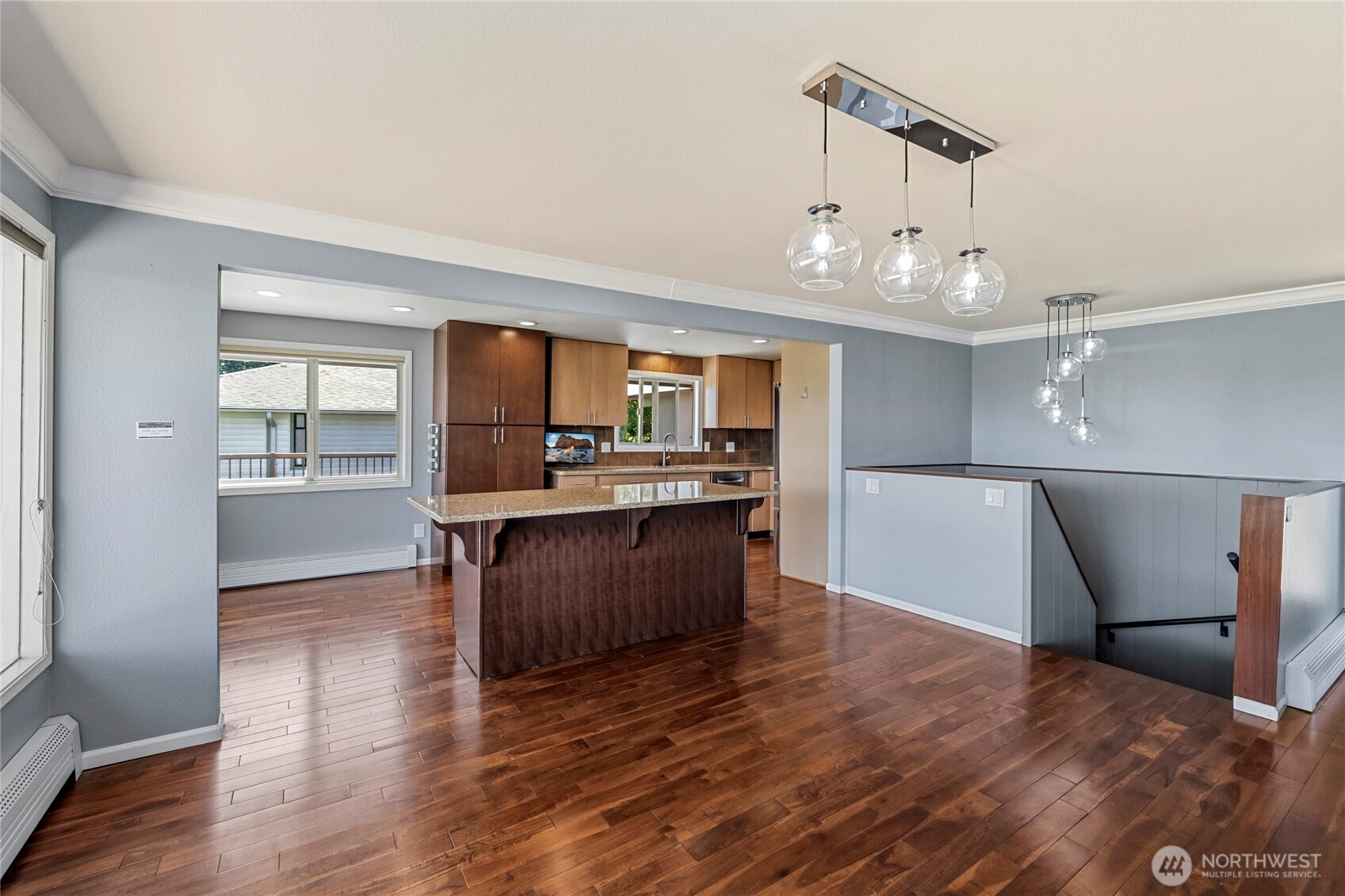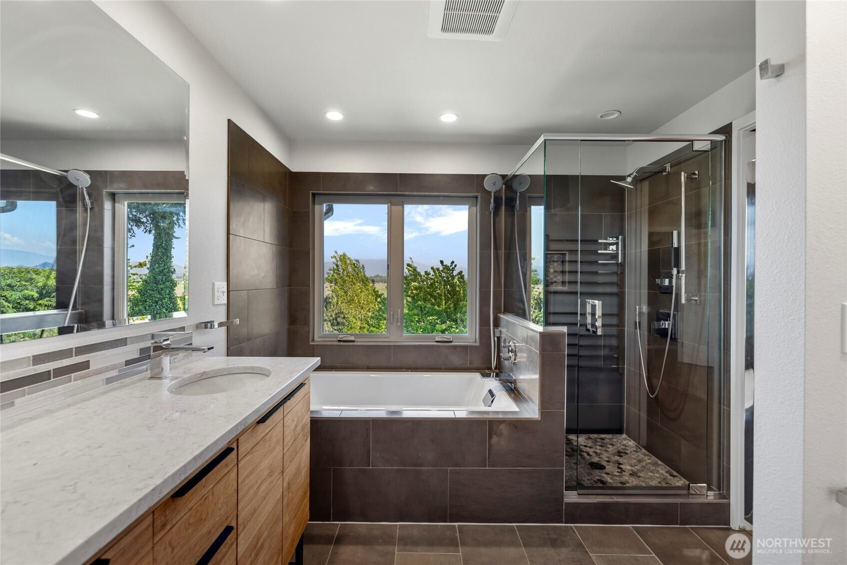 Step inside this captivating mid-century home with its cool, distinctive curb appeal and subtle NW-inspired landscaping that sets it apart from the ordinary. A welcoming 2-car carport leads to the front door, where an open-concept kitchen, living, and dining area greets you with warmth and style. A massive stone fireplace anchors the spacious main living area, while expansive windows frame breathtaking valley and mountain views. Hardwood floors flow throughout, enhancing the light-filled, airy feel. The kitchen showcases a lovely mid-century aesthetic, seamlessly opening to a large deck—perfect for dining al fresco while soaking in the scenic panorama and overlooking the expansive fenced yard. On the main level, the cozy primary bedroom offers an ensuite bathroom featuring a walk-in tiled shower, soothing soaker tub, double vanity, and generous walk-in closet. Two additional bedrooms and a full hall bathroom complete this level, providing comfort and convenience for guests. Downstairs, the daylight basement reveals versatile living space: a 4th bedroom/office, a huge bonus room, a finished flex room, laundry, and abundant closet/storage options. Walk-out access to the backyard makes indoor-outdoor living effortless.Nestled near the prestigious Skagit Golf and Country Club with no HOA, this home delivers peaceful living with excellent commuting access in all directions. Ideal for those seeking character, views, space, & flexibility in a prime location.