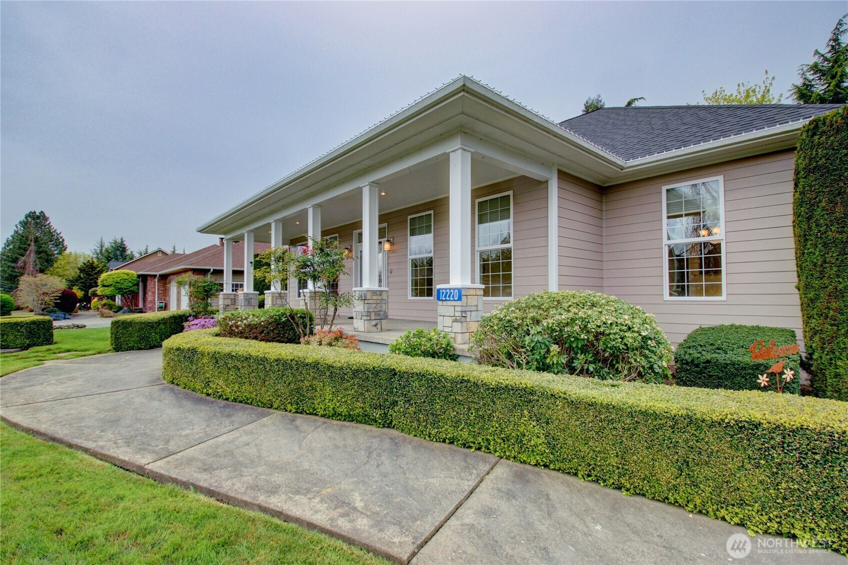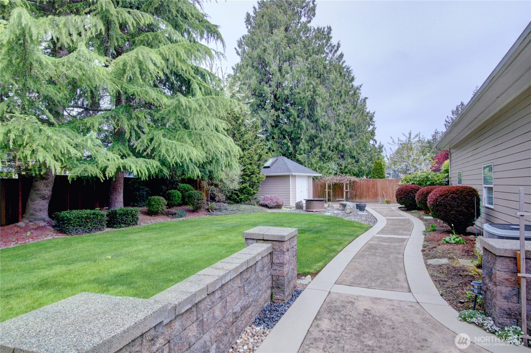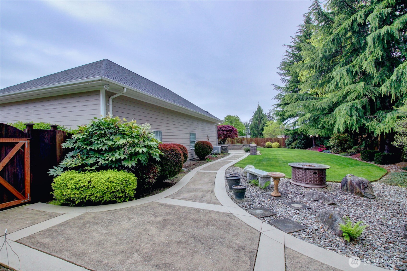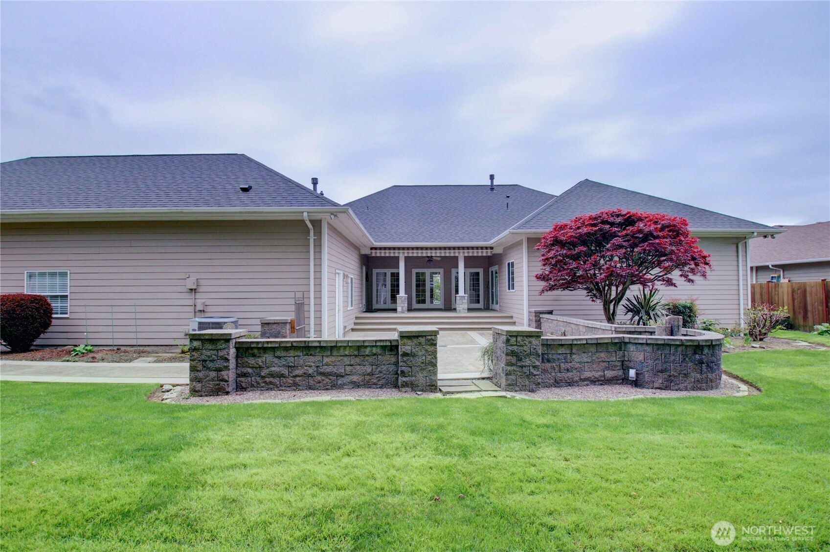 Welcome to this immaculate 2,471 sq ft rambler with beautiful tile floors and a spacious living room with a beautiful fireplace, surround sound, and 3 French doors opening out to a fabulous, covered patio and a lower patio overlooking a fully fenced backyard retreat. Enjoy mature landscaping, lush lawn, a water feature, fire pit, irrigation system, storage shed and a small greenhouse-perfect for entertaining and gardening. The chef's kitchen features a Sub-Zero refrigerator, double ovens, abundant top of the line cabinets, pantry area, and eating bar. Dining room and cozy family room for comfortable gatherings. Spacious primary suite includes room for a sitting area and a French door out to the patio. Primary bath offers soaking tub with bubbler, large shower, db. sinks and wonderful walk-in closet. Two guest bedrooms each feature walk in closets. Large laundry room with ample storage. Heat pump provides efficient air conditioning for summer comfort Nearly 1,100 sq ft 3 bay garage offers extensive cabinets, deep sink, shop space, stair access to an impressive overhead storage area. Mudroom with 3/4 bath conveniently located off garage entry. Terraced front yard and welcoming covered front porch complete this exceptional home!