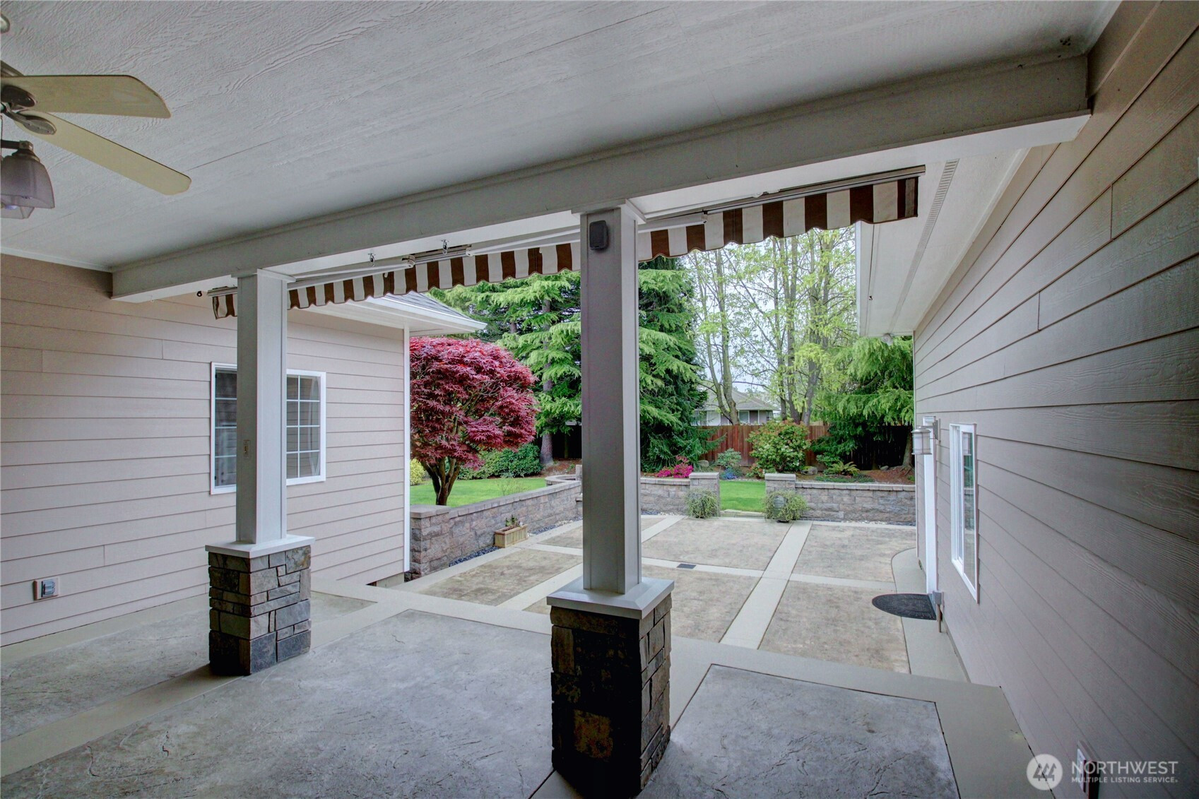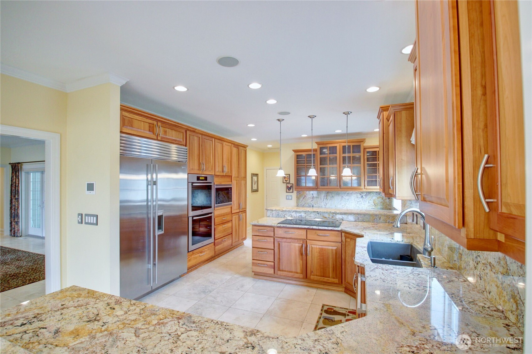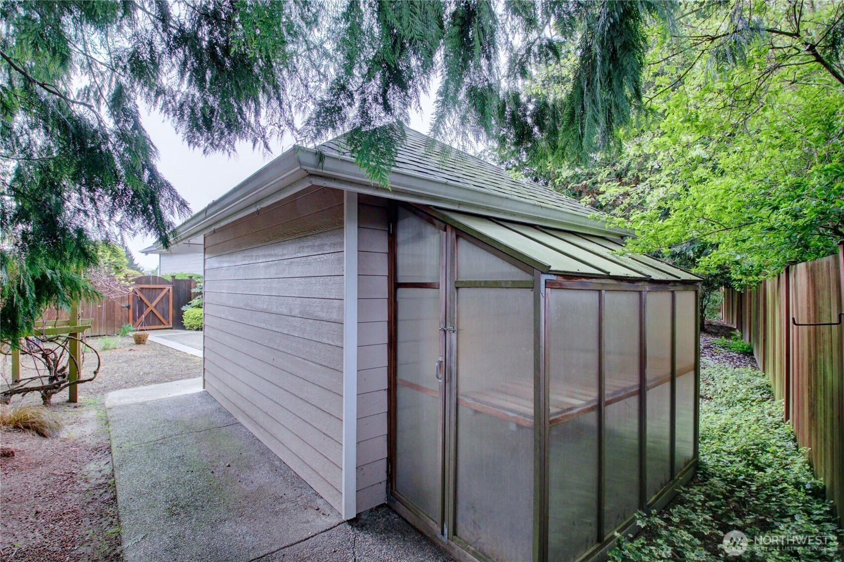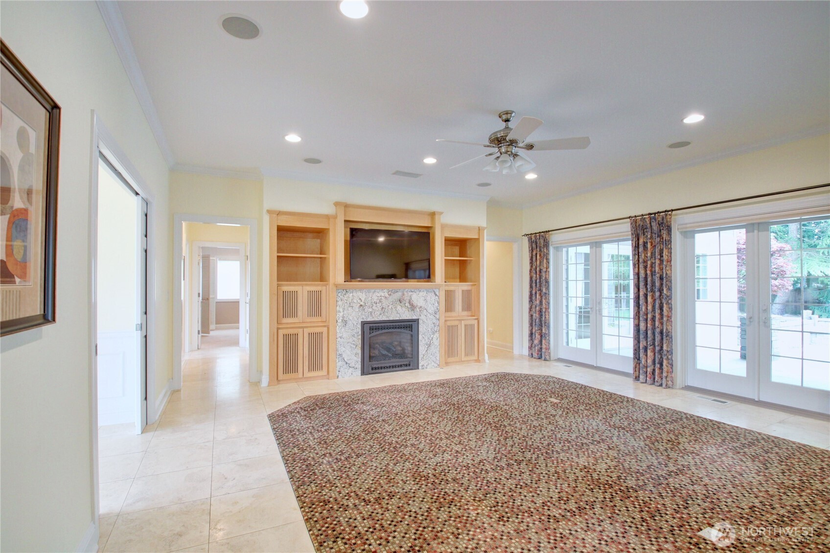 Welcome to this immaculate 2,471 sq ft rambler with beautiful tile floors and a spacious living room with a beautiful fireplace, surround sound, and 3 French doors opening out to a fabulous, covered patio and a lower patio overlooking a fully fenced backyard retreat. Enjoy mature landscaping, lush lawn, a water feature, fire pit, irrigation system, storage shed and a small greenhouse-perfect for entertaining and gardening. The chef's kitchen features a Sub-Zero refrigerator, double ovens, abundant top of the line cabinets, pantry area, and eating bar. Dining room and cozy family room for comfortable gatherings. Spacious primary suite includes room for a sitting area and a French door out to the patio. Primary bath offers soaking tub with bubbler, large shower, db. sinks and wonderful walk-in closet. Two guest bedrooms each feature walk in closets. Large laundry room with ample storage. Heat pump provides efficient air conditioning for summer comfort Nearly 1,100 sq ft 3 bay garage offers extensive cabinets, deep sink, shop space, stair access to an impressive overhead storage area. Mudroom with 3/4 bath conveniently located off garage entry. Terraced front yard and welcoming covered front porch complete this exceptional home!