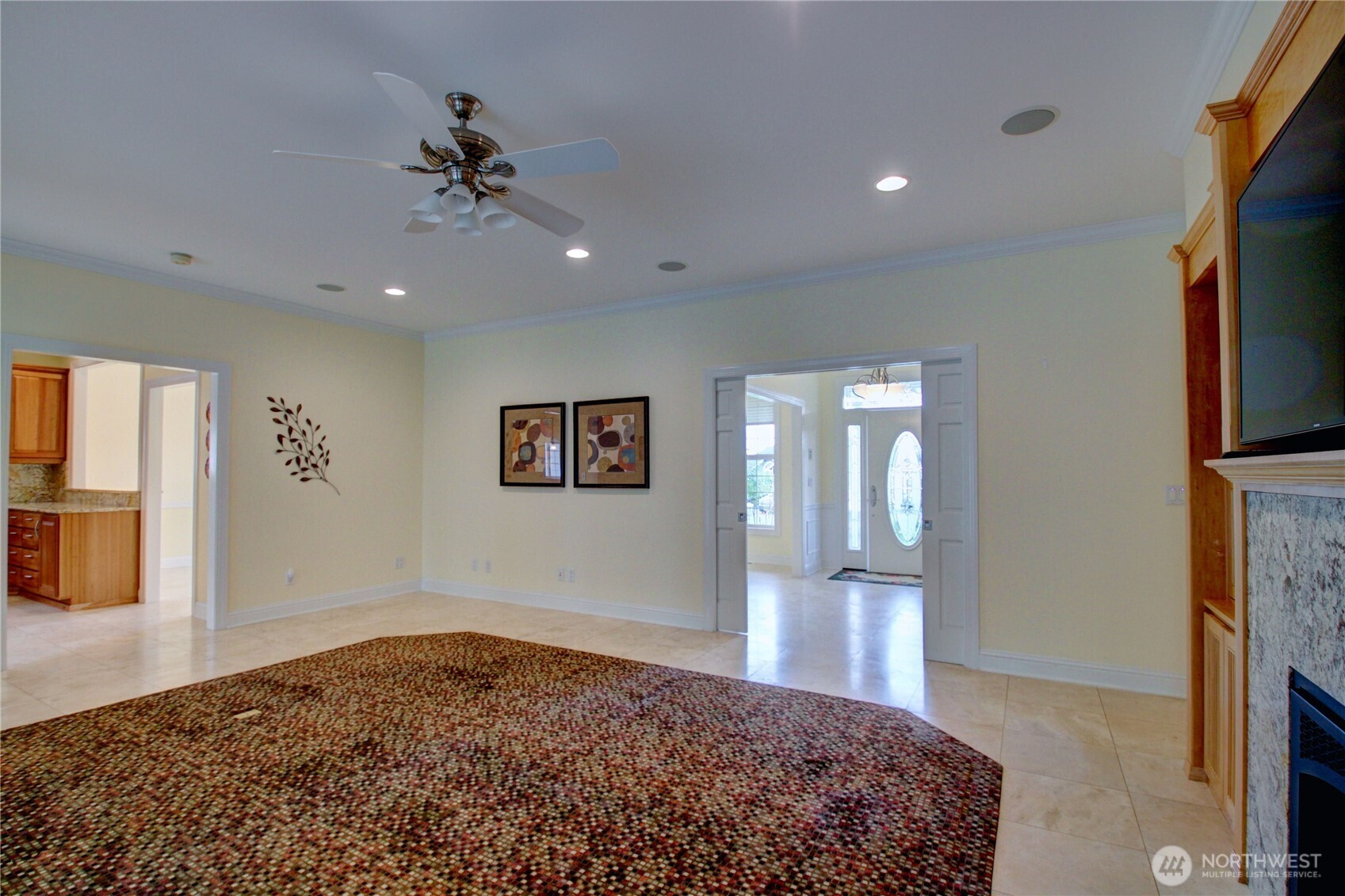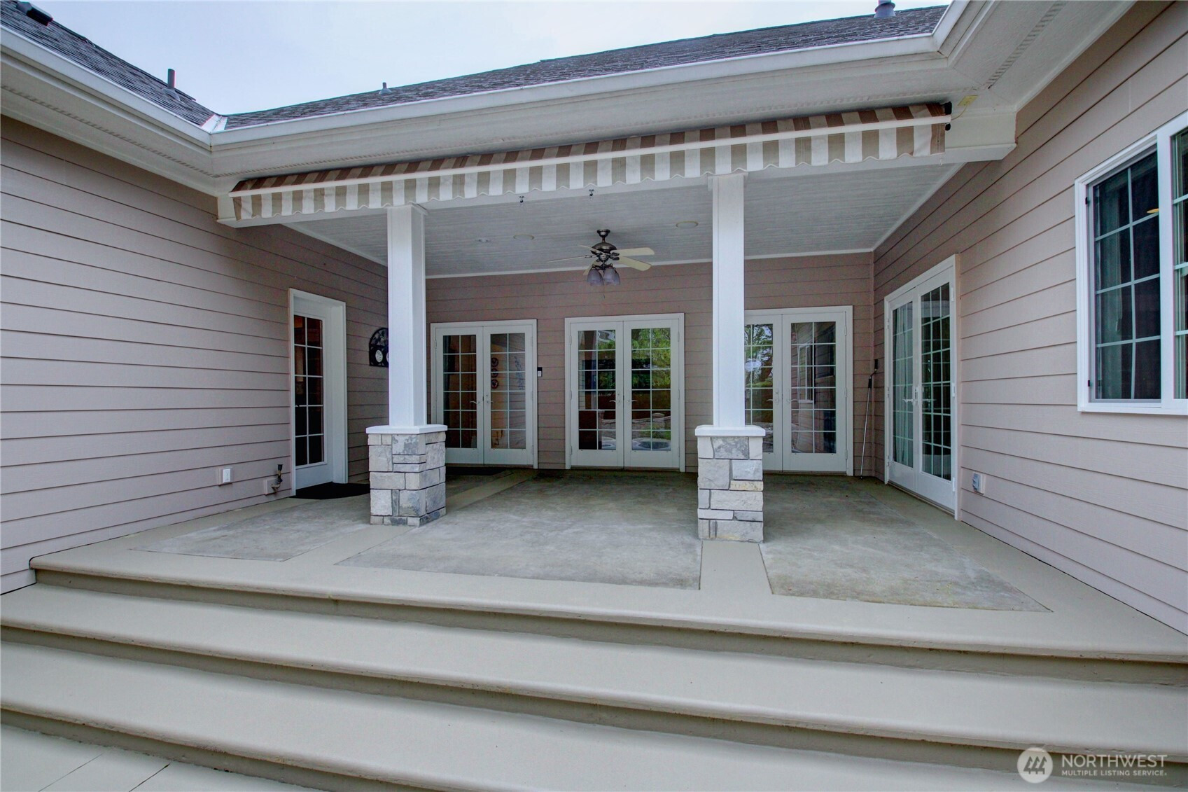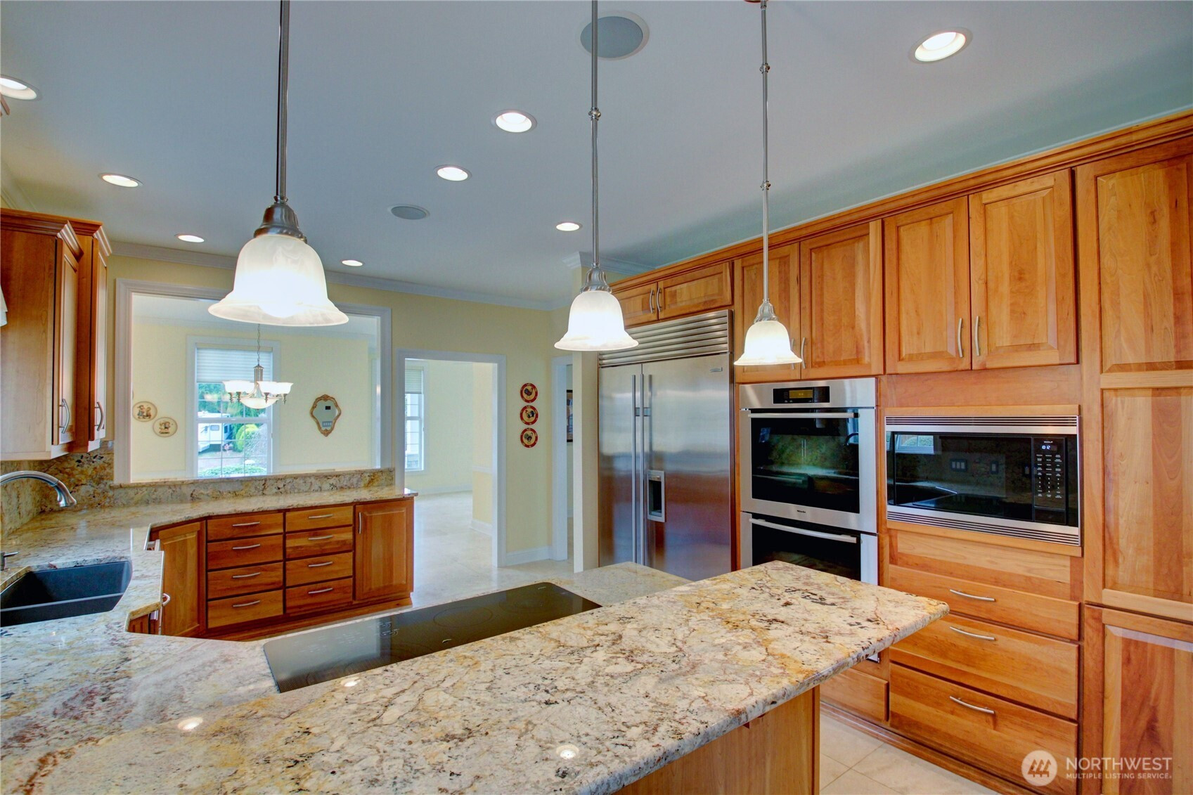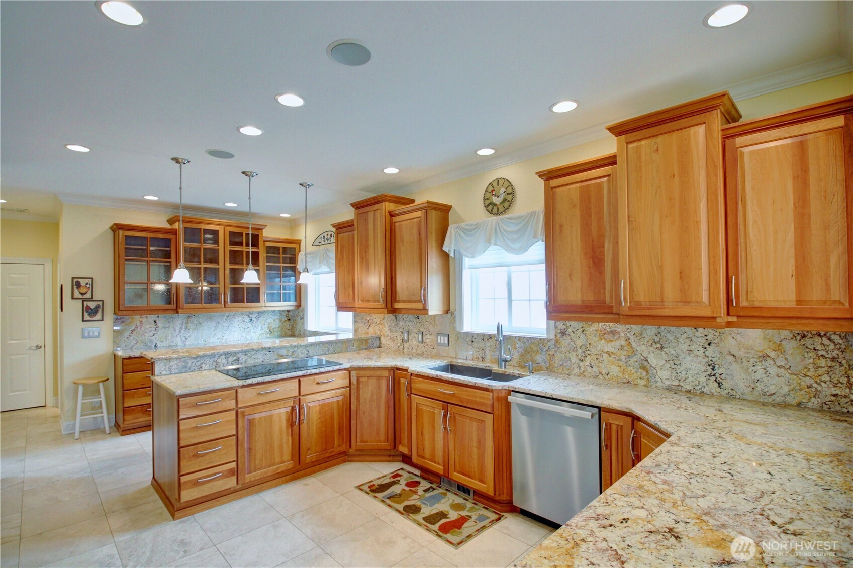 Welcome to this immaculate 2,471 sq ft rambler with beautiful tile floors and a spacious living room with a beautiful fireplace, surround sound, and 3 French doors opening out to a fabulous, covered patio and a lower patio overlooking a fully fenced backyard retreat. Enjoy mature landscaping, lush lawn, a water feature, fire pit, irrigation system, storage shed and a small greenhouse-perfect for entertaining and gardening. The chef's kitchen features a Sub-Zero refrigerator, double ovens, abundant top of the line cabinets, pantry area, and eating bar. Dining room and cozy family room for comfortable gatherings. Spacious primary suite includes room for a sitting area and a French door out to the patio. Primary bath offers soaking tub with bubbler, large shower, db. sinks and wonderful walk-in closet. Two guest bedrooms each feature walk in closets. Large laundry room with ample storage. Heat pump provides efficient air conditioning for summer comfort Nearly 1,100 sq ft 3 bay garage offers extensive cabinets, deep sink, shop space, stair access to an impressive overhead storage area. Mudroom with 3/4 bath conveniently located off garage entry. Terraced front yard and welcoming covered front porch complete this exceptional home!