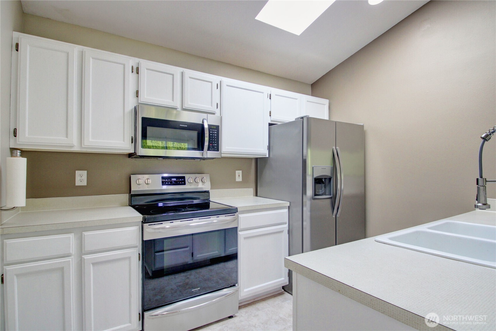Low-maintenance Burlington rambler updated, open living layout and move-in ready. 3 ample bedrooms, 2 bathrooms, vaulted ceilings, skylights and multiple walk-in closets. Master bath has both a soaking jetted tub and walk-in shower. Quality laminate throughout- no carpet! Fully fenced with long side yard and private backyard with both ample garden and play space. New 30 yr. roof in 2023 as well as new kitchen appliances. Oversized and insulated 2-car garage with work area and off-street parking. Near bus routes and walking distance to town, library, schools, restaurants and parks. Ready for your personal touches.