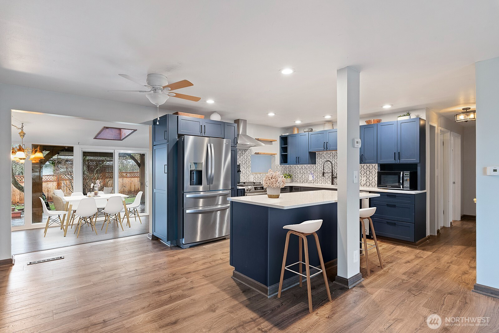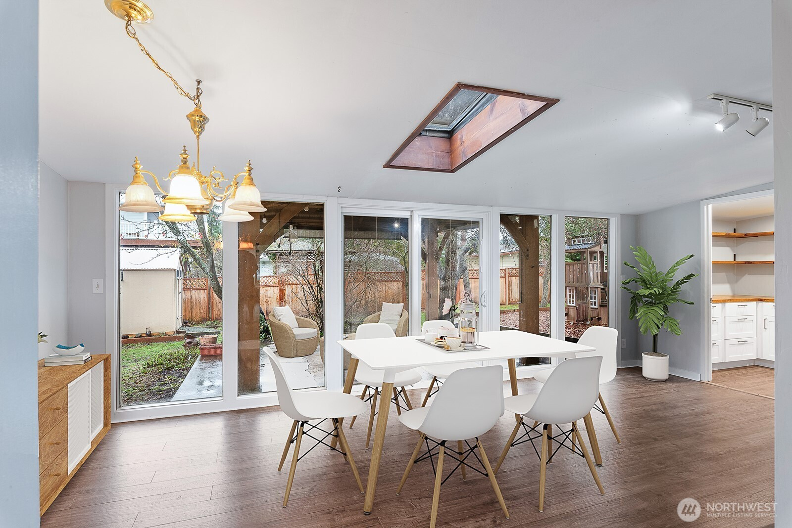 Spacious 4 BEDROOM, 2-bath home ideally located near schools & parks. Open concept layout showcases a FULLY remodeled kitchen w/quartz countertops, new cabinets, huge new walk-in pantry & eating bar that flows seamlessly to living room. Updated flooring throughout main living area. Dining space resides in a charming sunroom leading to a fenced backyard—perfect for entertaining or relaxing & three large sheds for storage, hobbies &more. Private primary suite w/it's own bath. Three additional bedrooms w/original oak floors & second full bath sit on the opposite side of the home. Additional living spaces include family room & versatile office/den w/a private entrance. Bring your ideas for further upgrades! 9148 sq ft lot on a dead-end street!